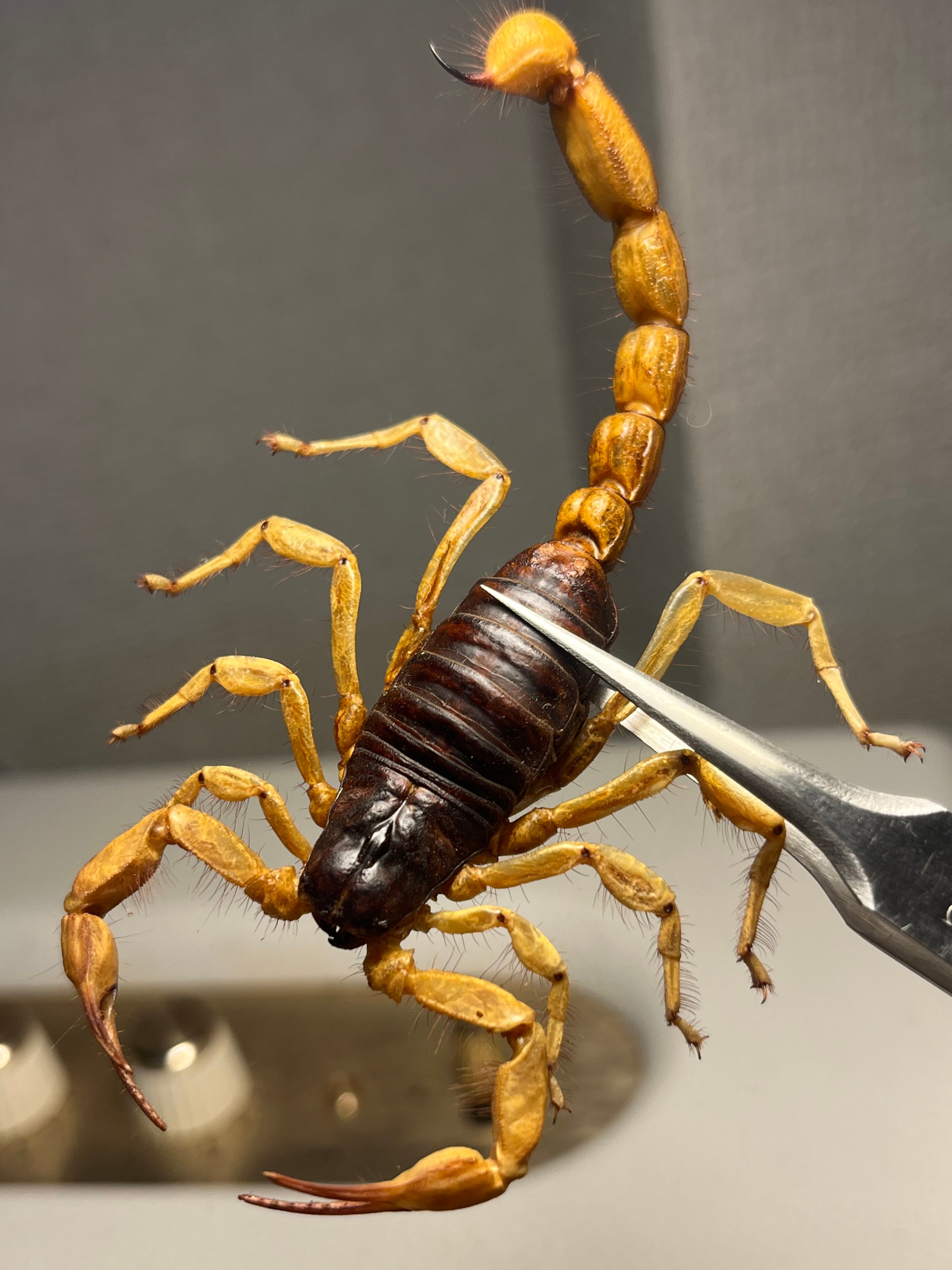 Hottentotta属のサソリかHadrurus属のサソリっぽいです。わかる人がいれば教えてください。