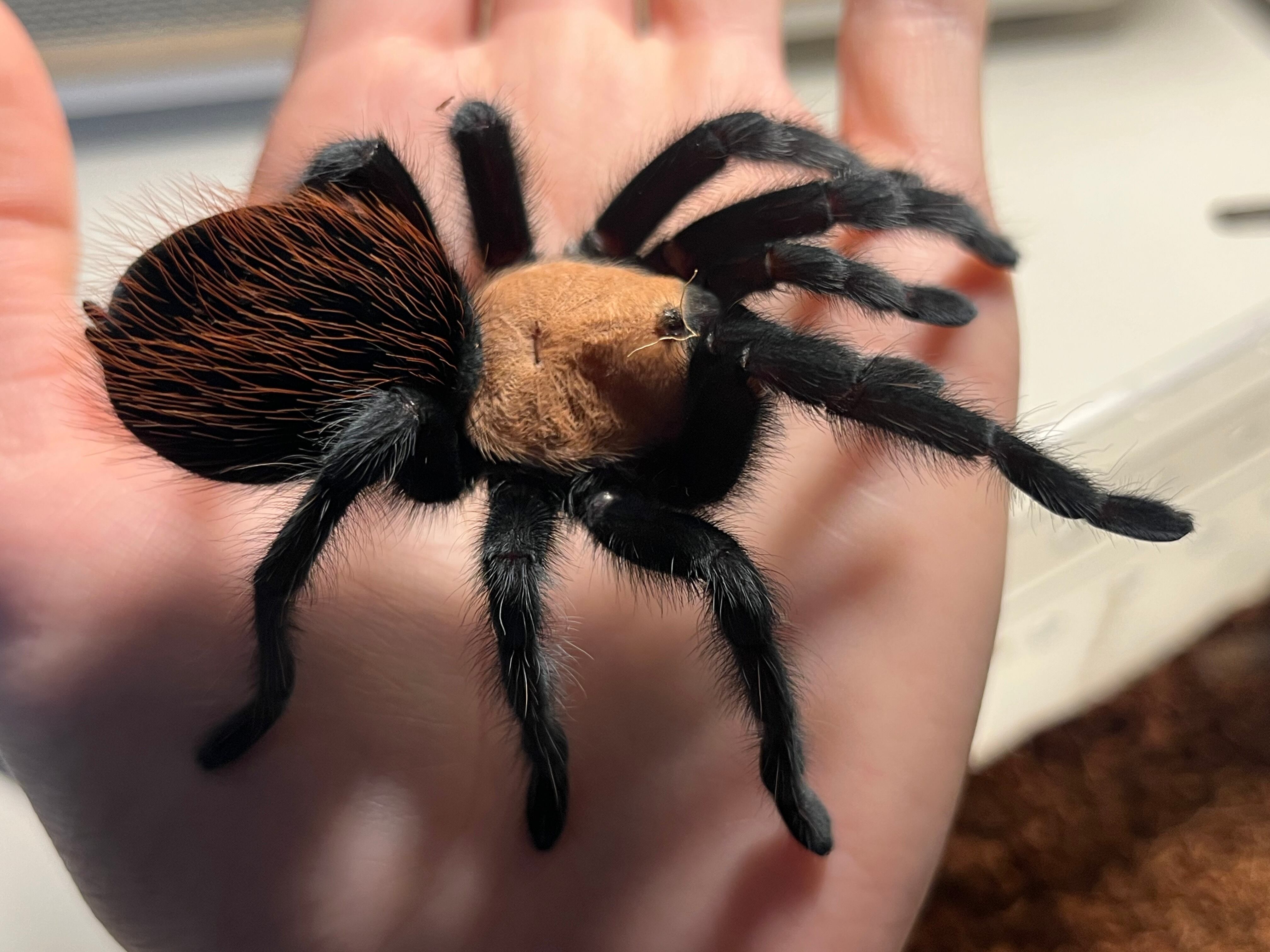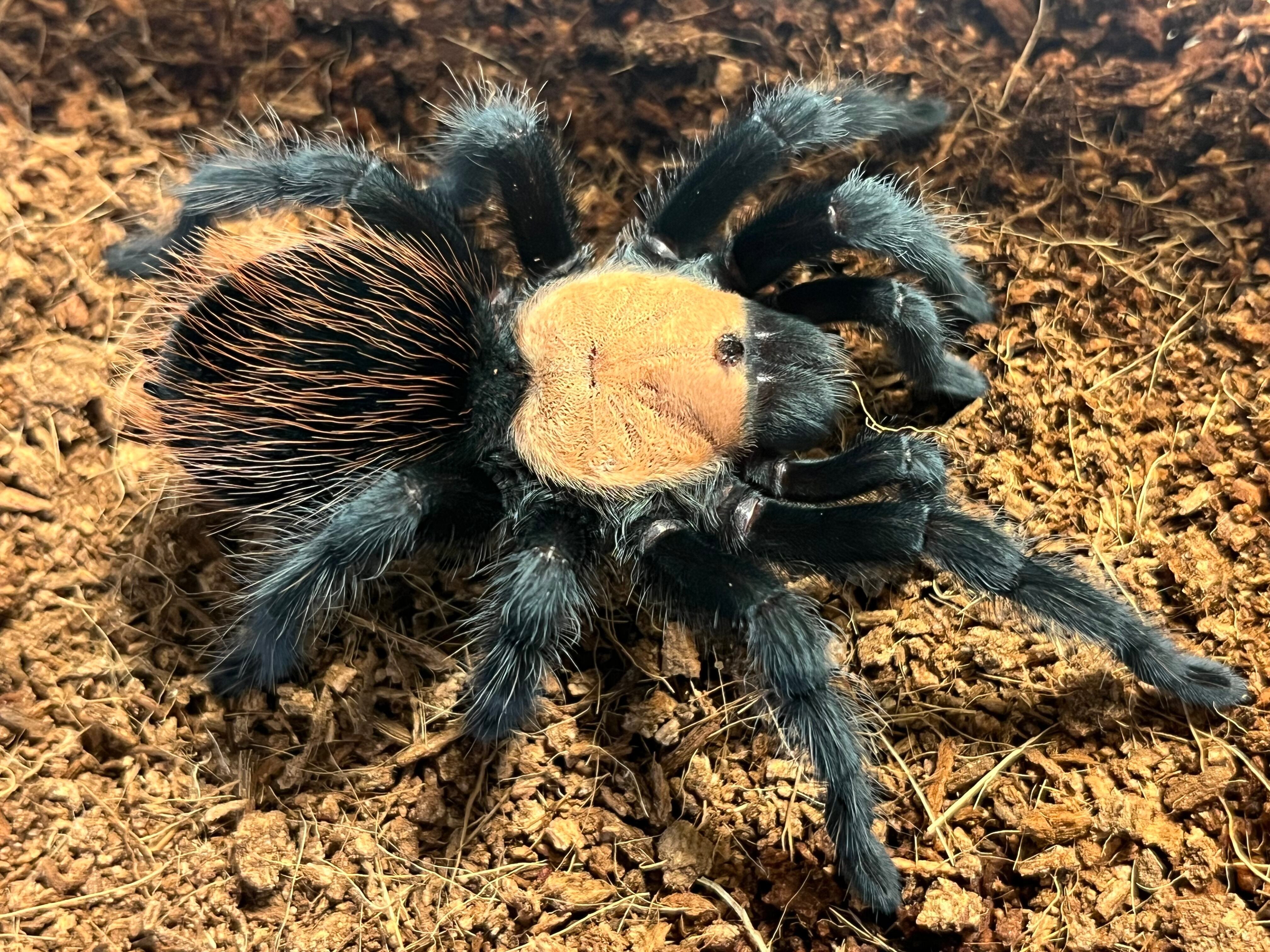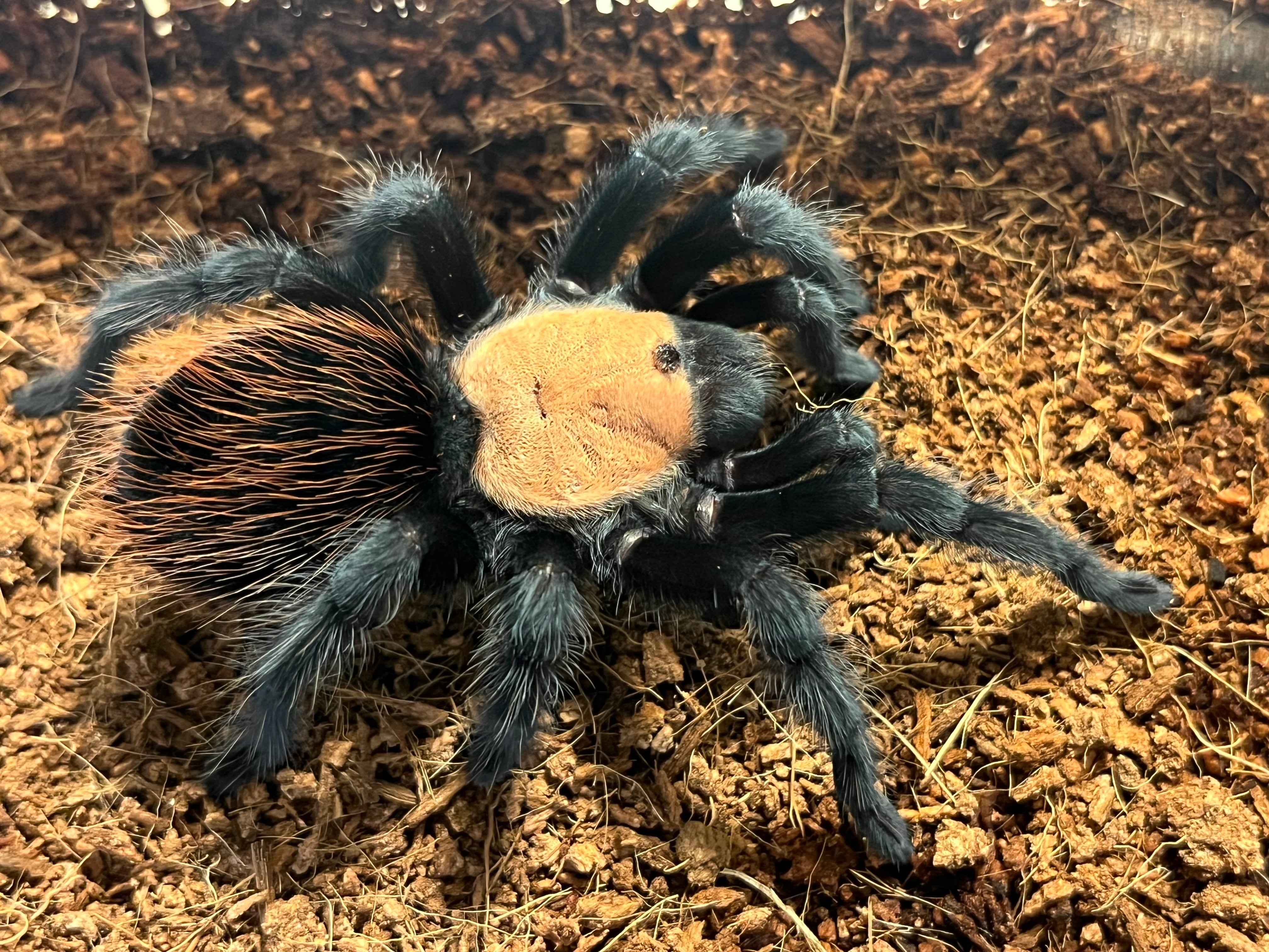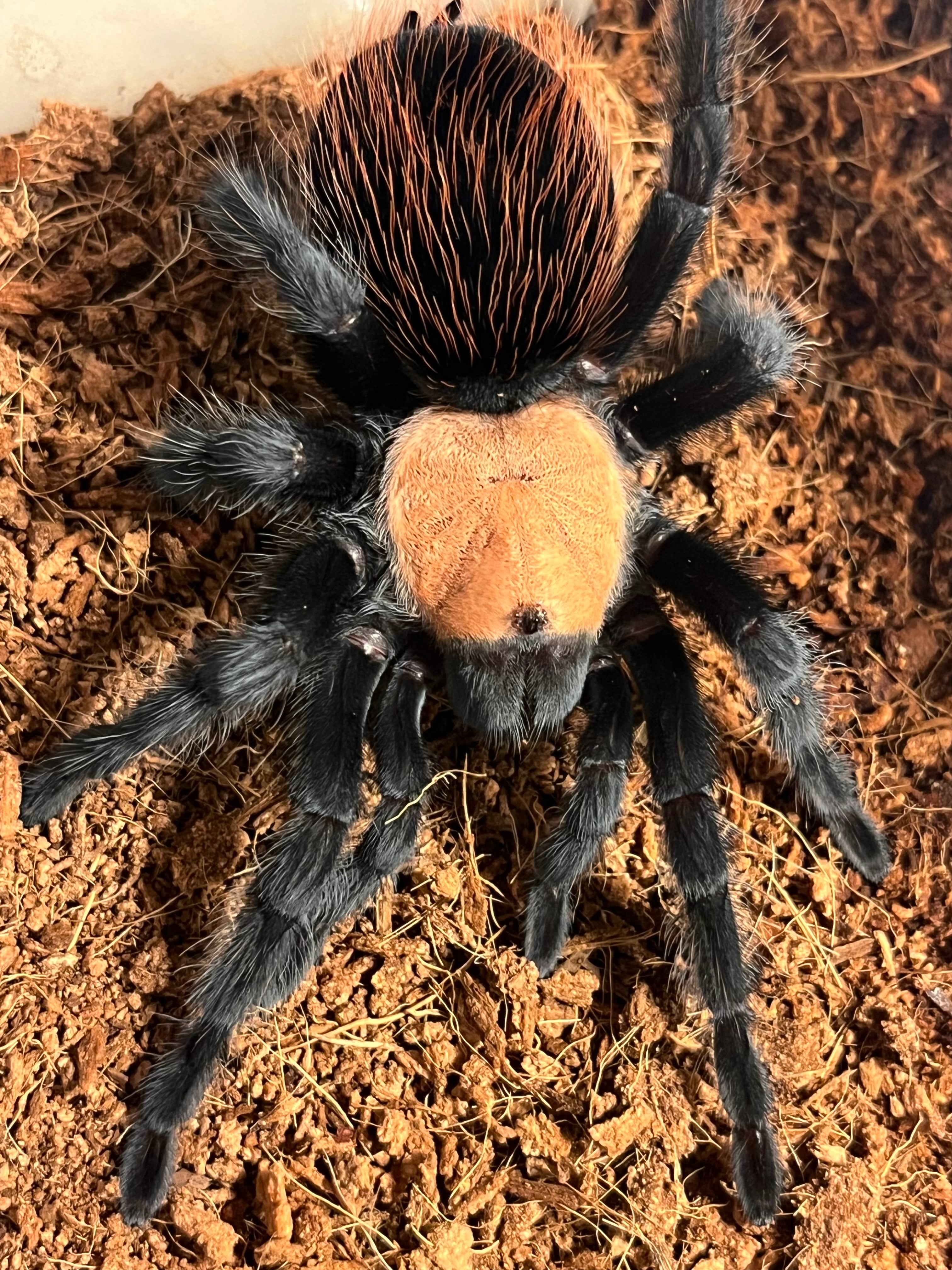 海外ではメキシカンゴールデンレッドランプと呼ばれています。 背甲部の金色と漆黒の脚、腹部の赤い毛がとても綺麗なタランチュラです。