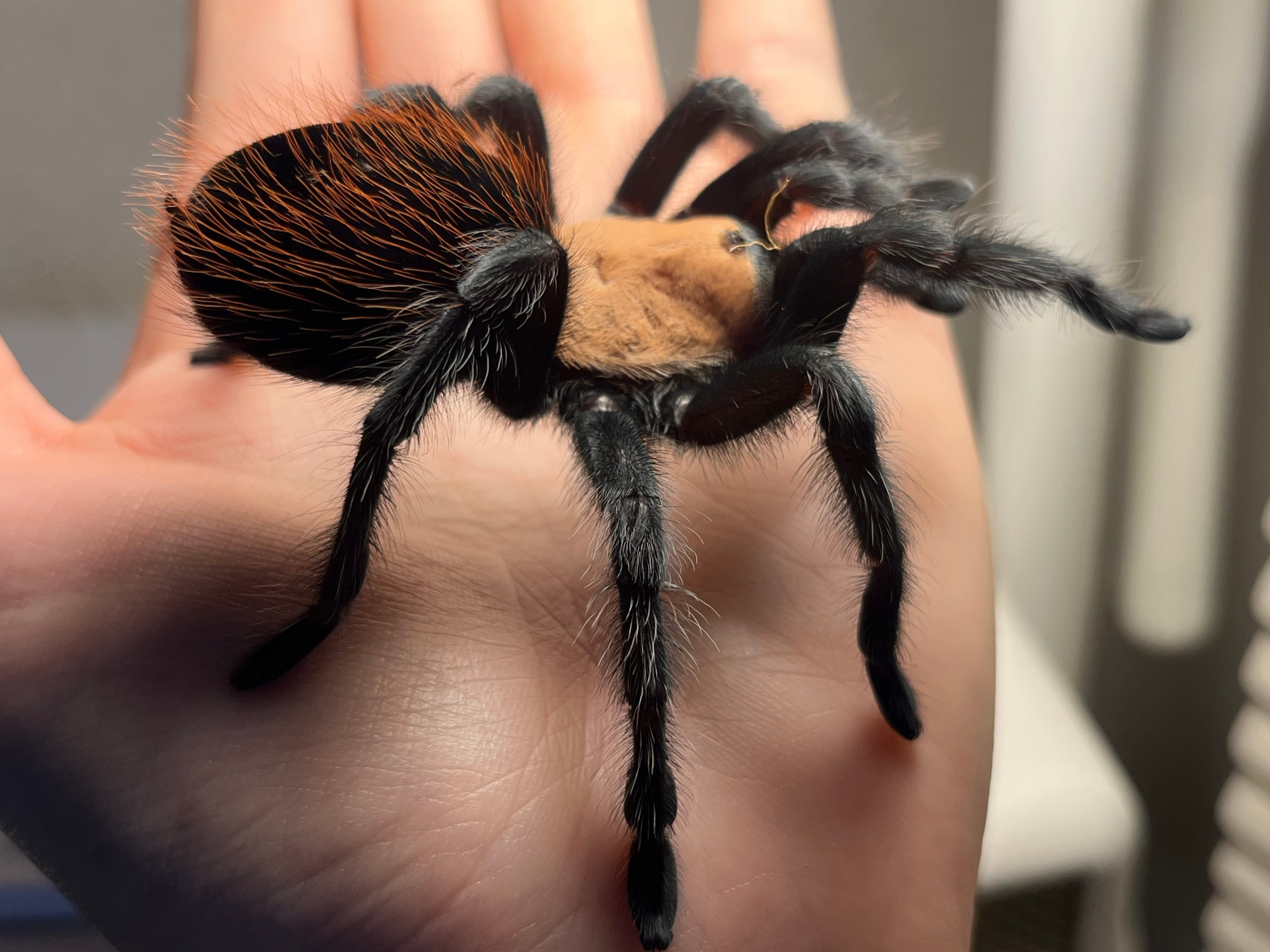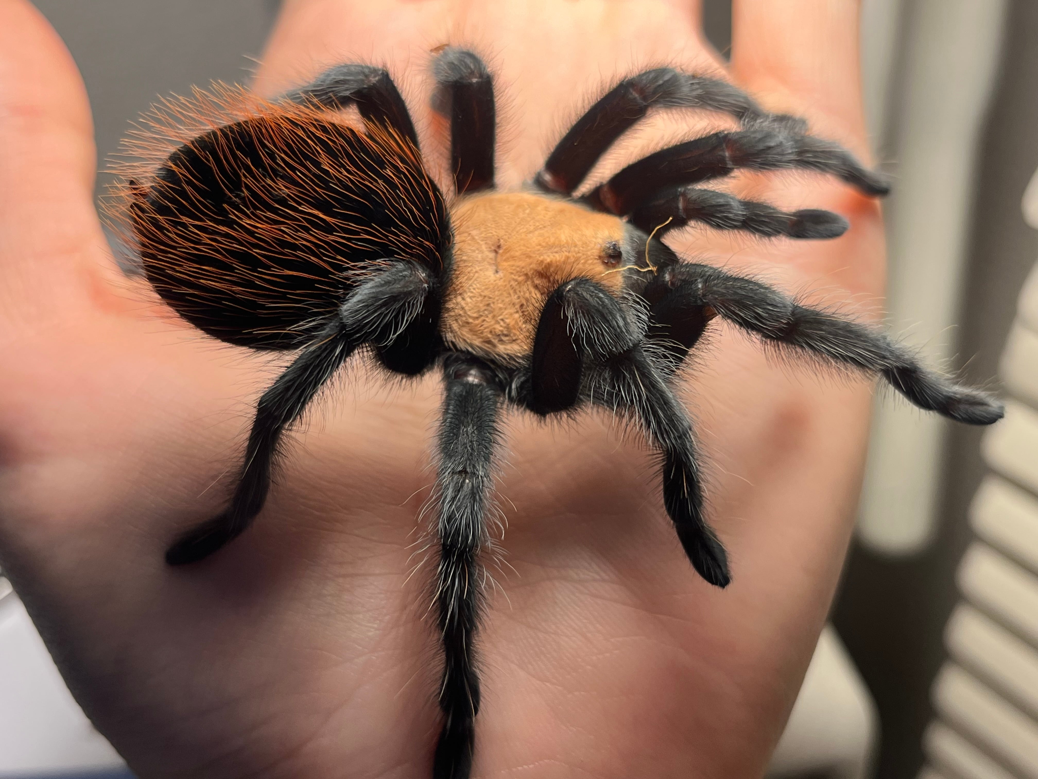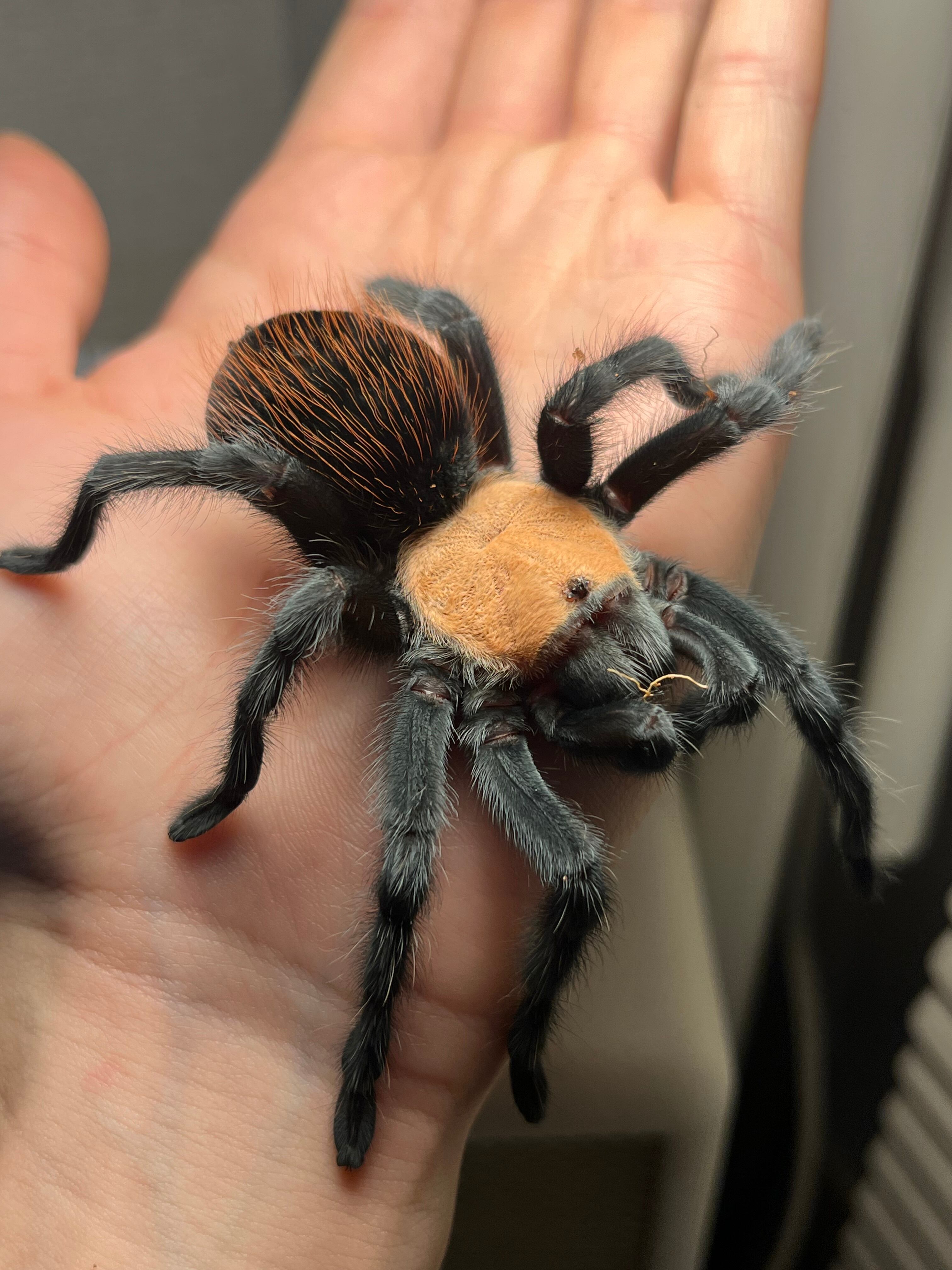海外ではメキシカンゴールデンレッドランプと呼ばれています。 背甲部の金色と漆黒の脚、腹部の赤い毛がとても綺麗なタランチュラです。