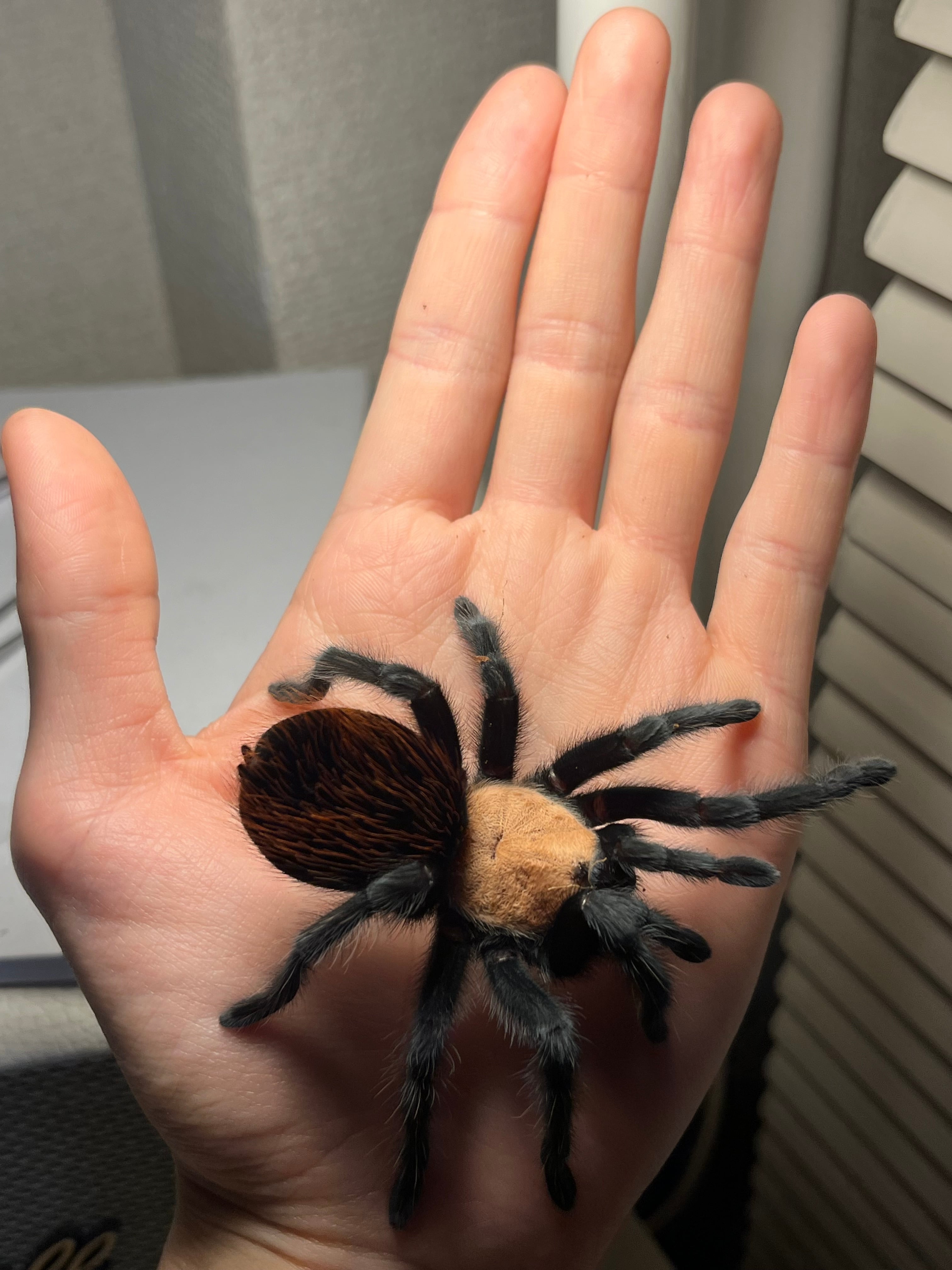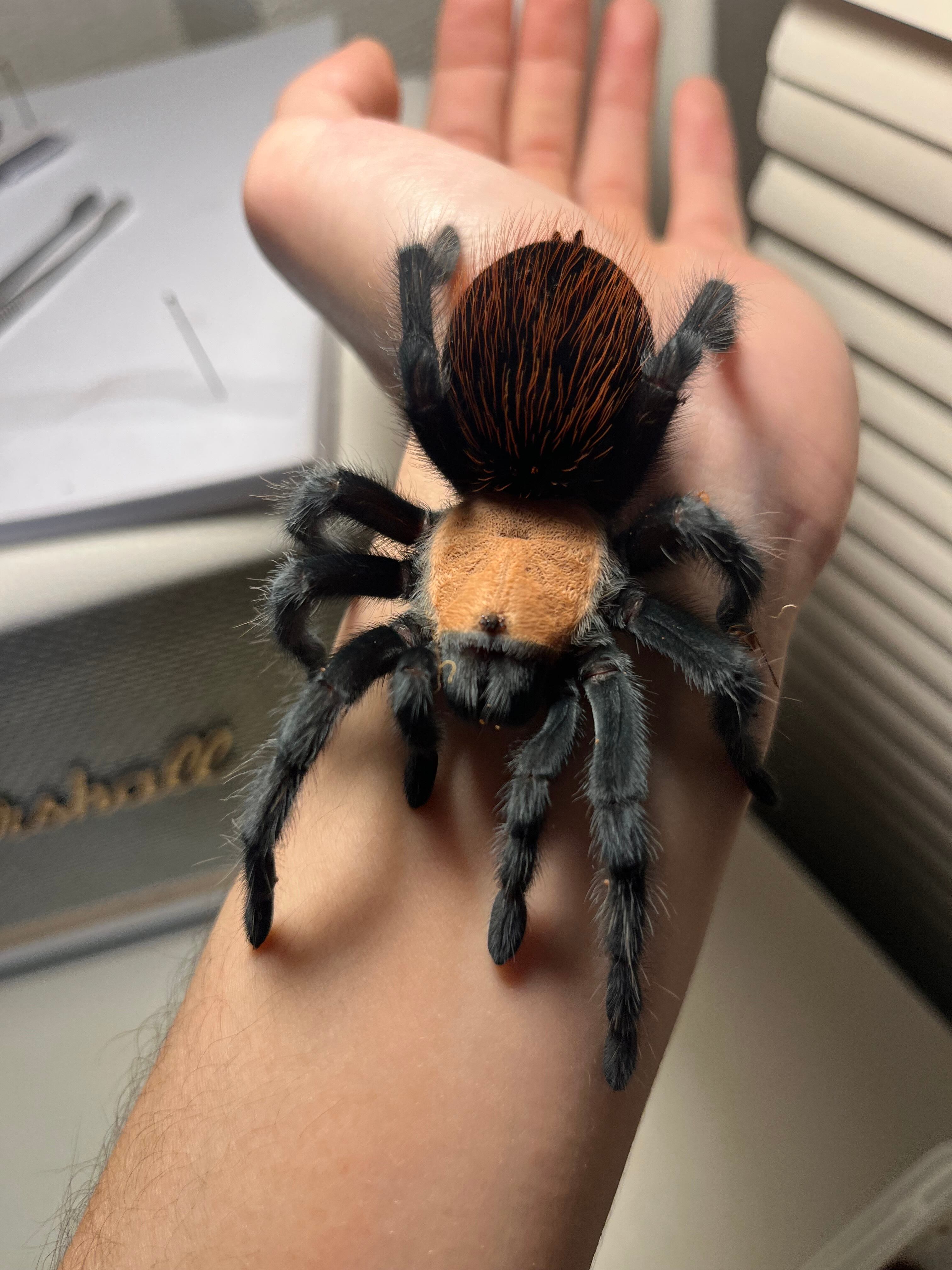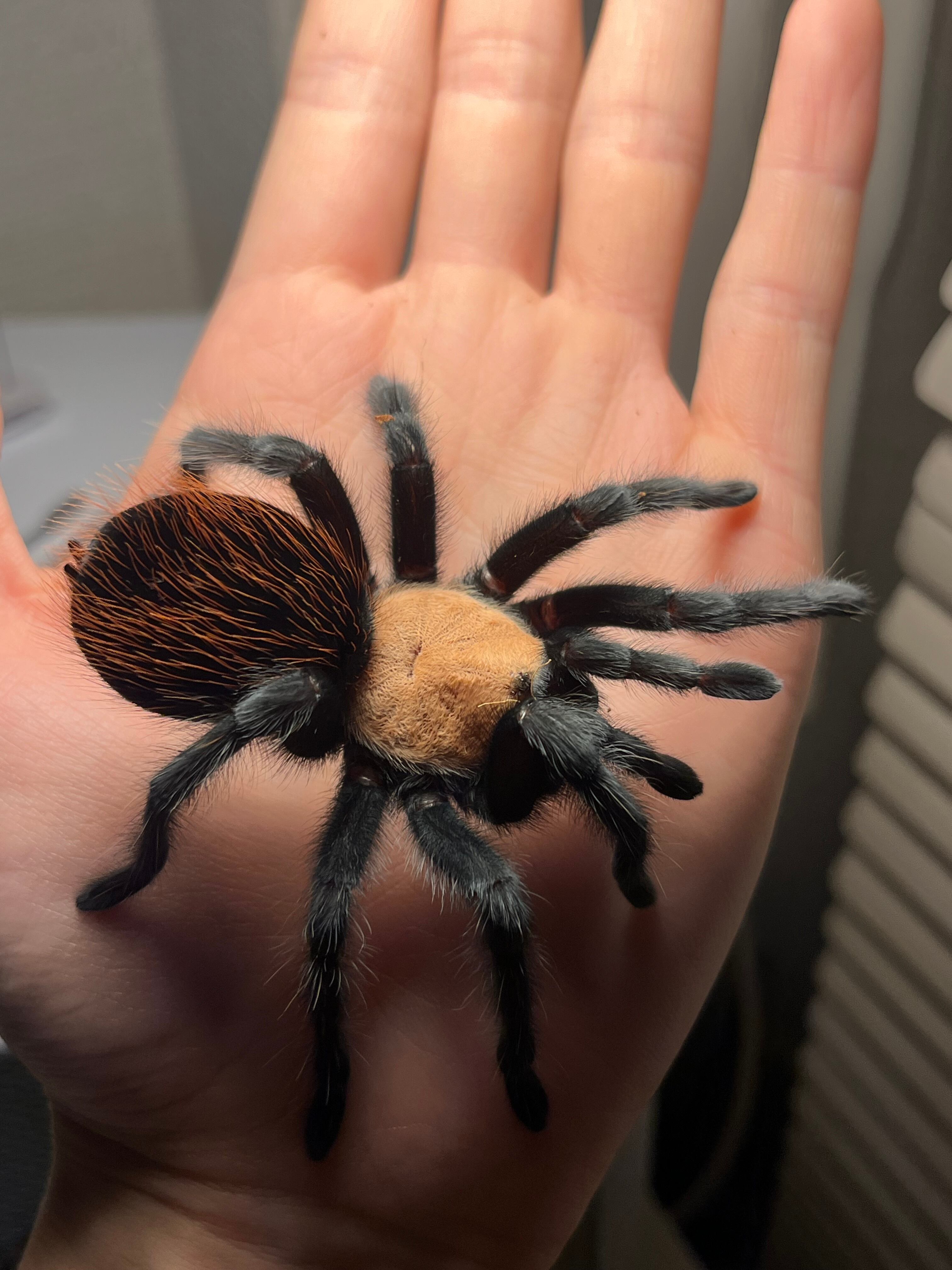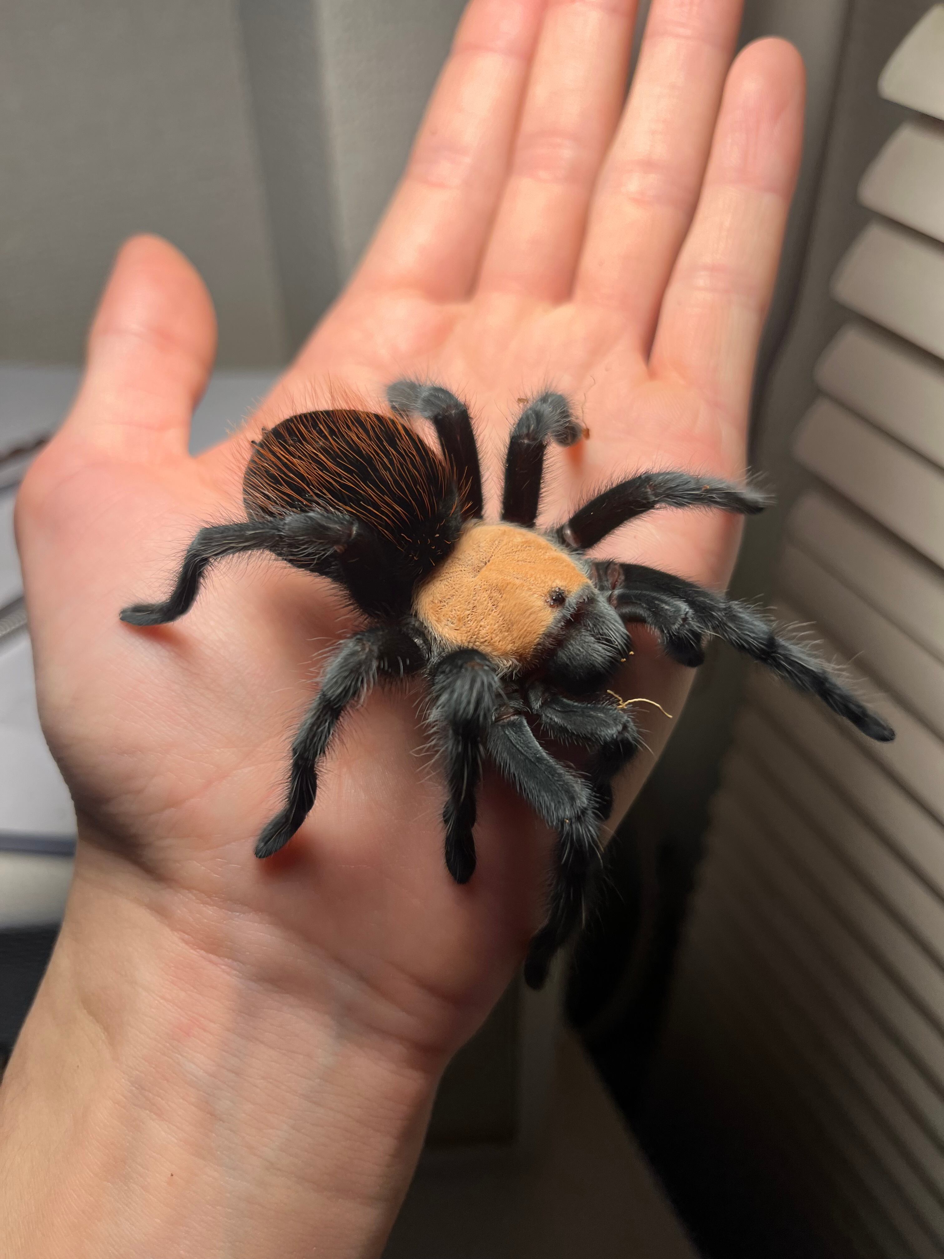 海外ではメキシカンゴールデンレッドランプと呼ばれています。 背甲部の金色と漆黒の脚、腹部の赤い毛がとても綺麗なタランチュラです。