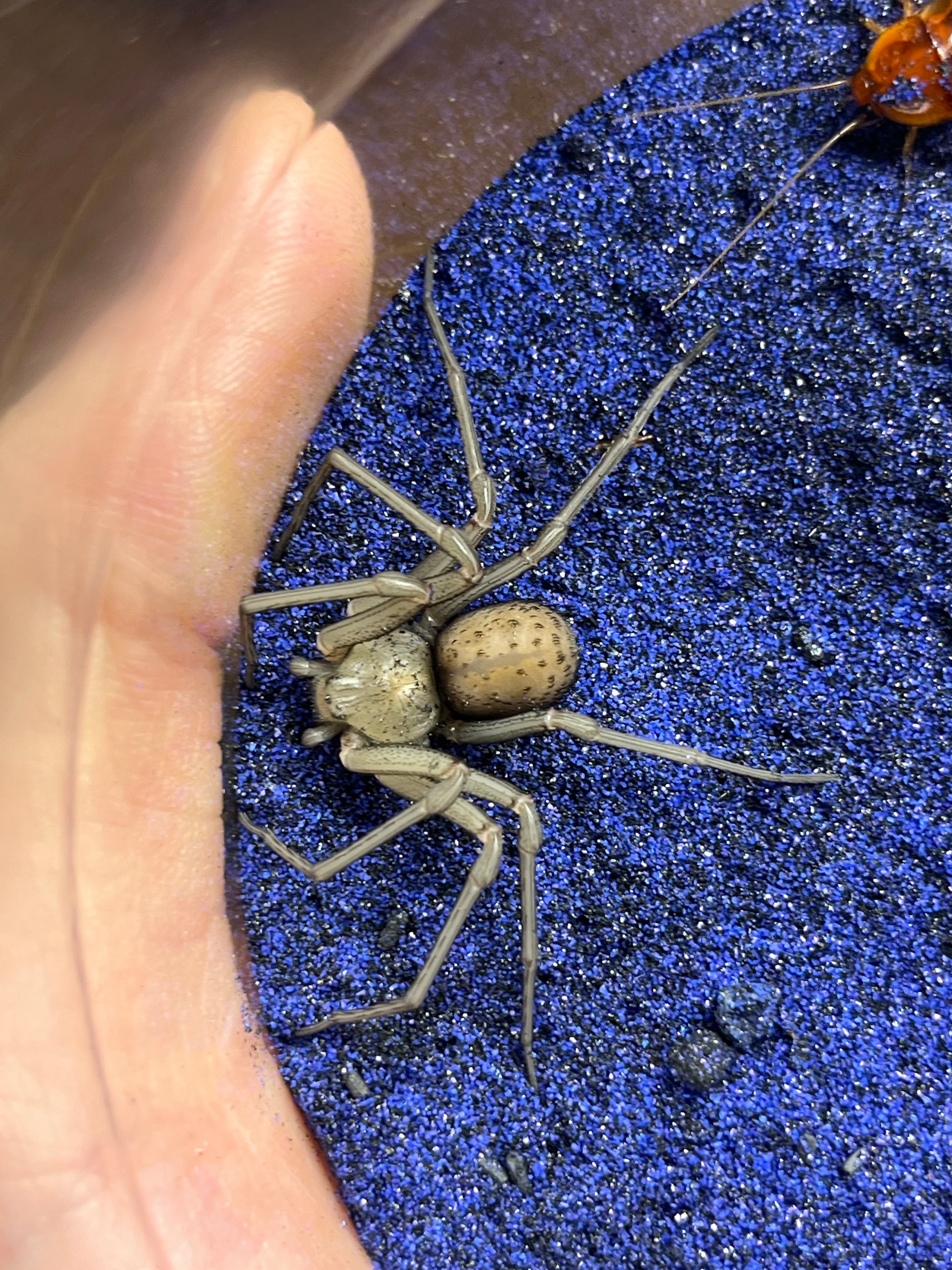 申し訳ありませんが輸送に伴うグレードダウン及び死着保証はございませんのでご了承願います。1枚目の画像個体を配送します。青と黒の砂が体に付着した個体になります。寿命もタランチュラなどに次いで長いそうで10-15年だそうです。