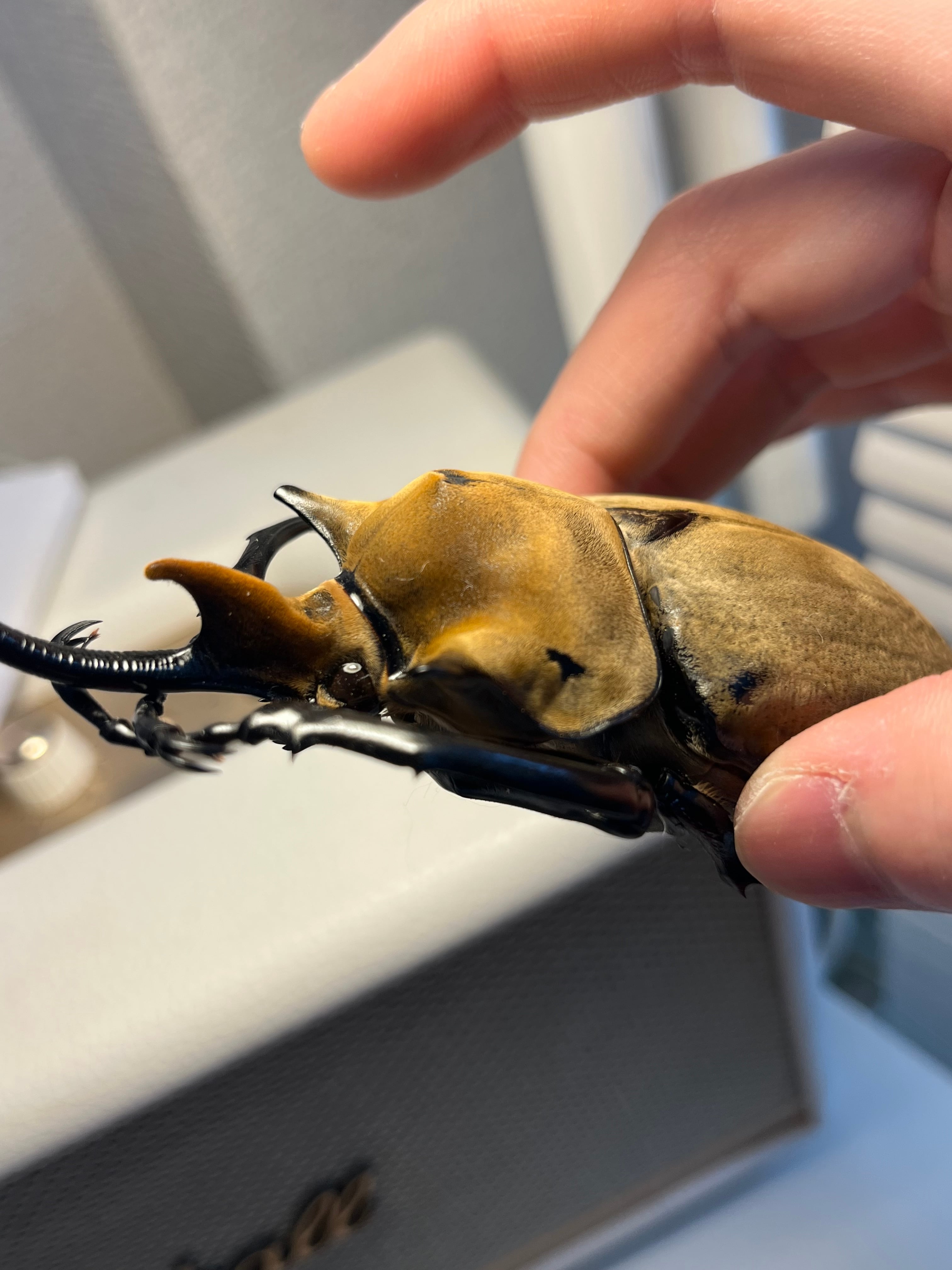 体の割に角は小さい。金色のビロード状の体毛が全身に生えており黄土色をしているが、この毛は時間と共に擦れて抜け落ちる。角が短いため体長ではヘラクレスオオカブトに劣るものの、体重と体全体の大きさでは本種の方が勝る。