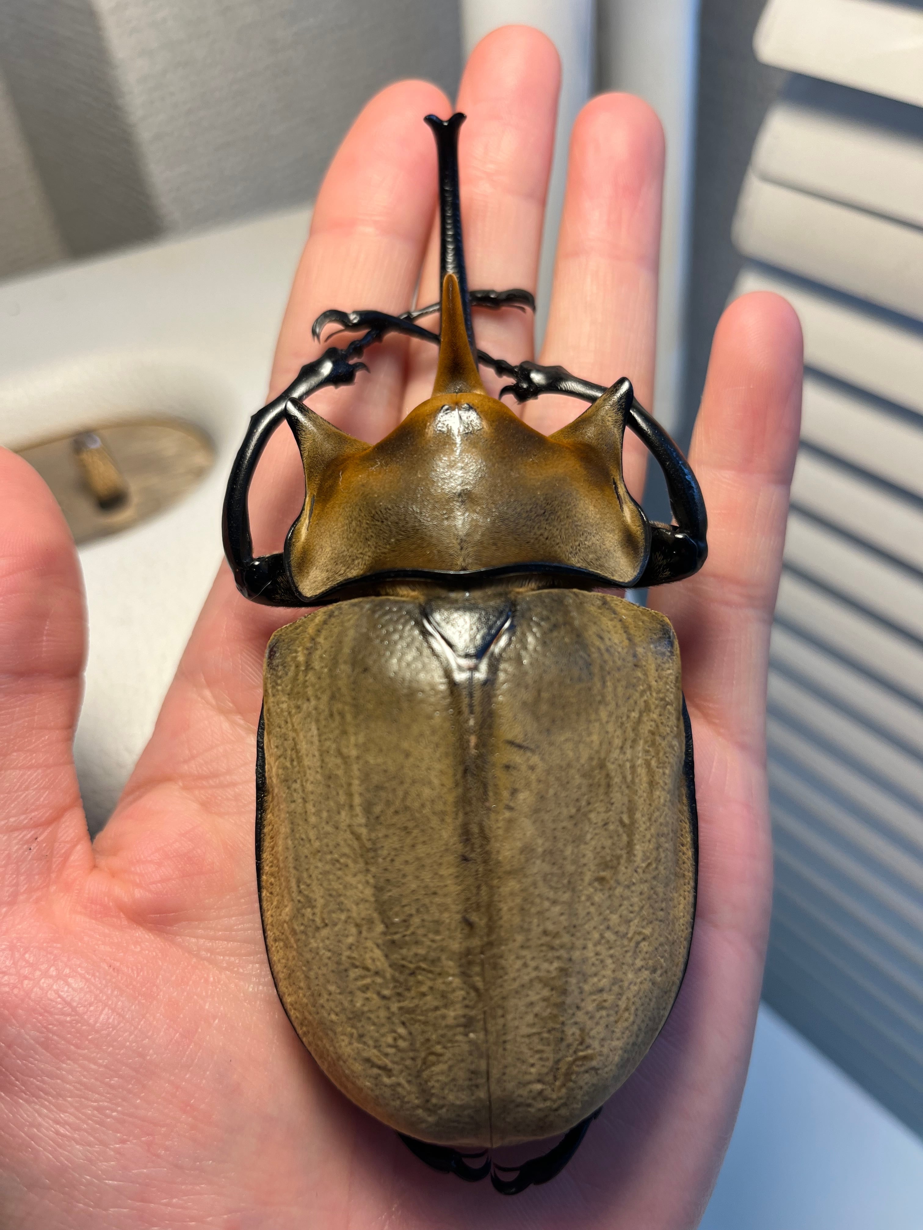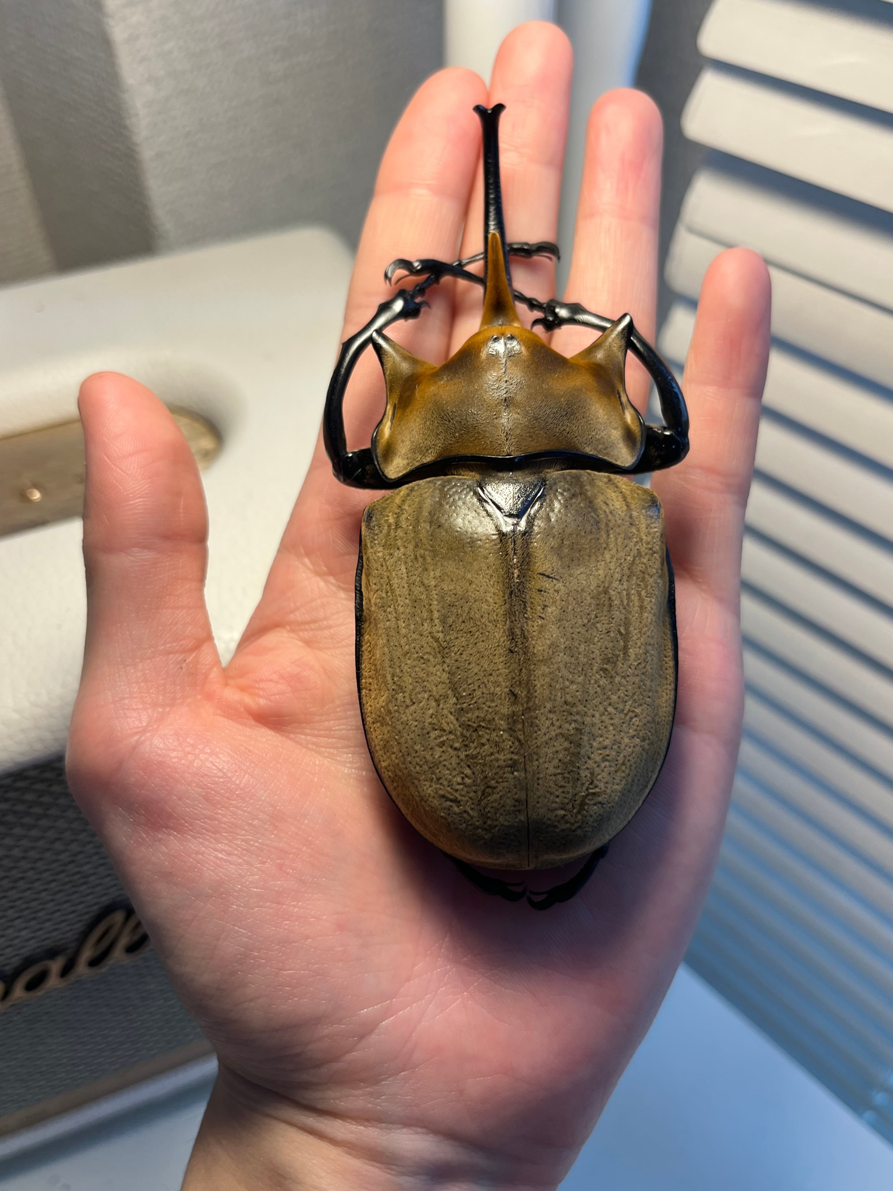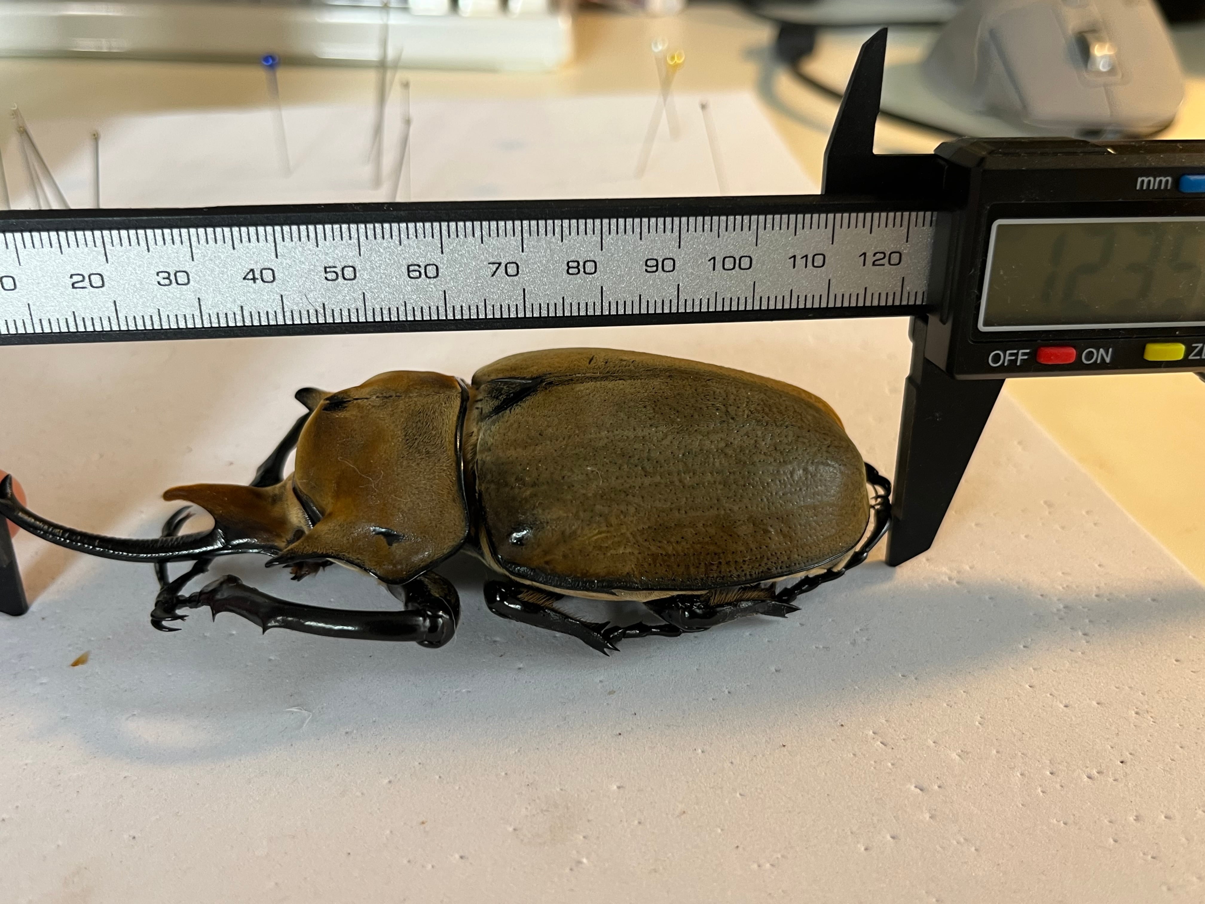 飼育下では130mmを越えた個体も報告されている。世界で最も体重が重いカブトムシとして知られ、約50gにも達する(ちなみにヘラクレスオオカブトは約40g)。また、本種はメスも大きく、体長80mmを超えるものもある。