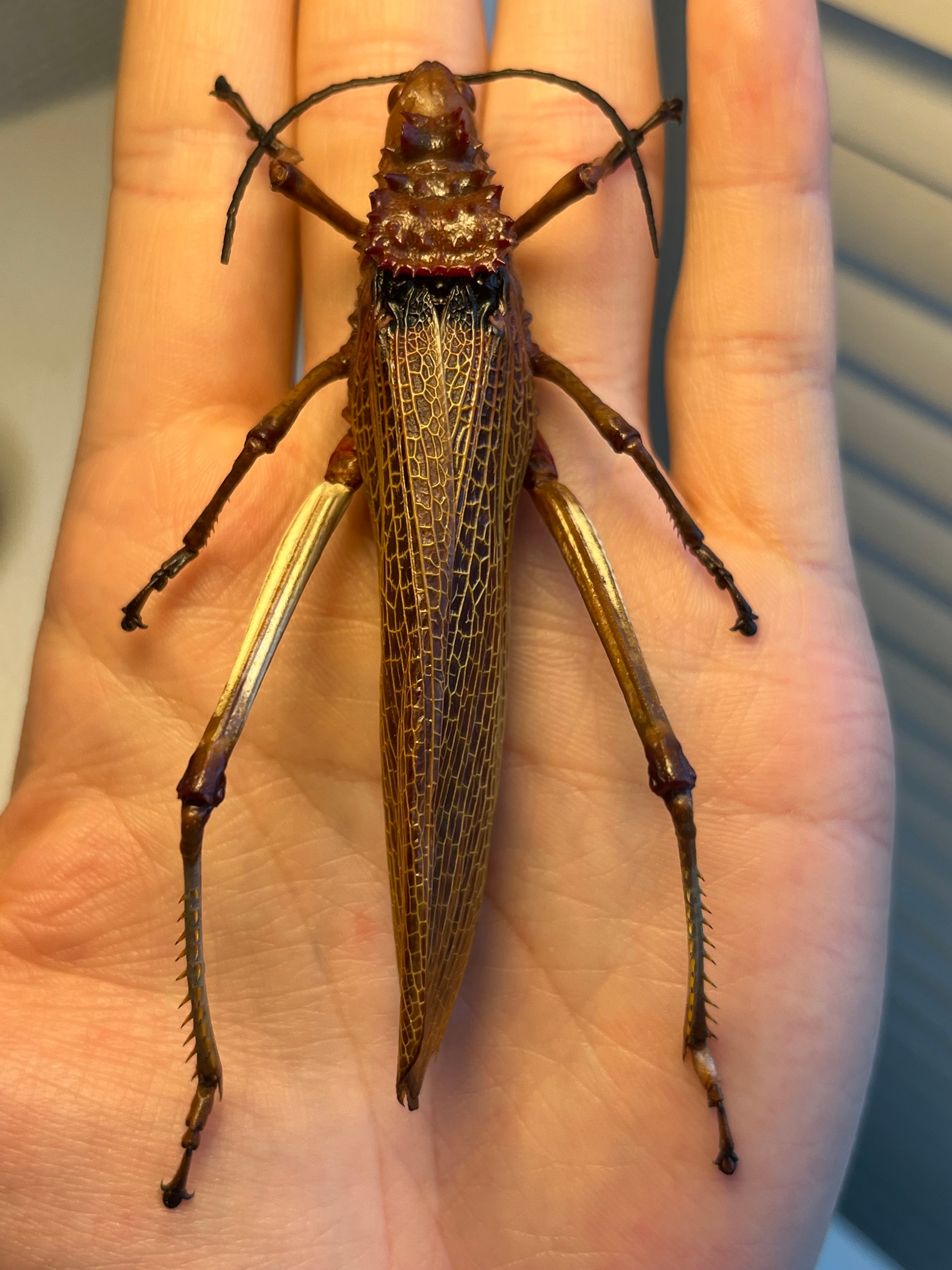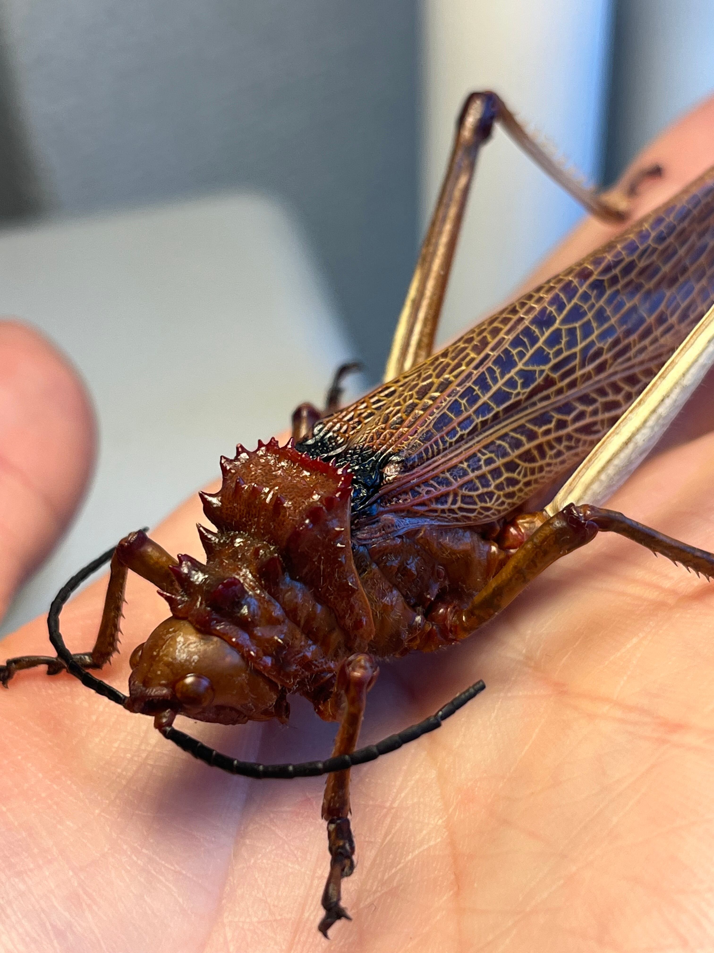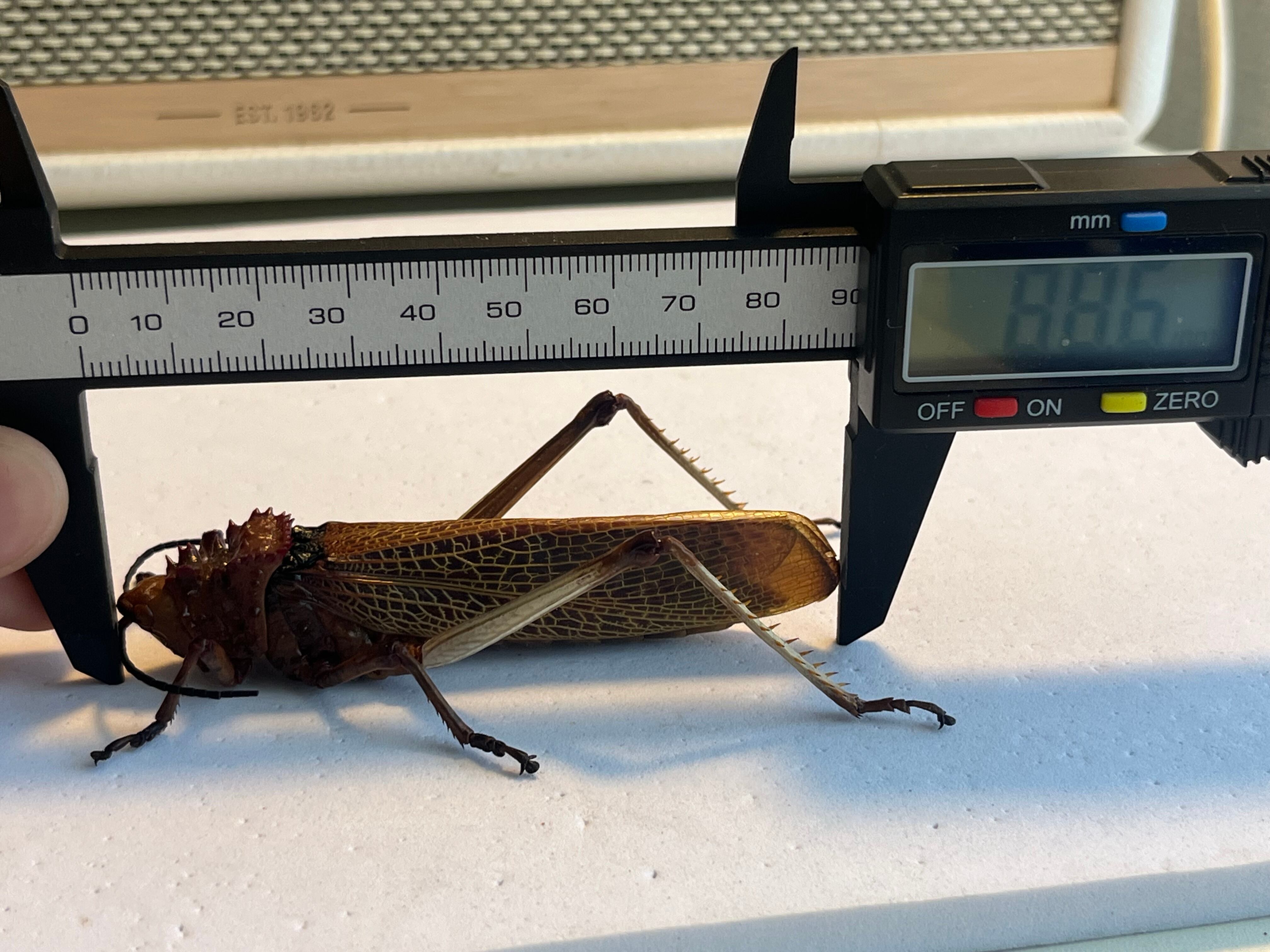 Phymateus aegrotusは、ブルーブッシュバッタまたはイーストアフリカブッシュバッタとも呼ばれ、バッタ科に属する害虫の一種です。「バッタ」とは異なり、成虫は群れをなしても形態変化を起こさないことが知られていますが、ホッパー期には小集団で行進行動をとることがあります。