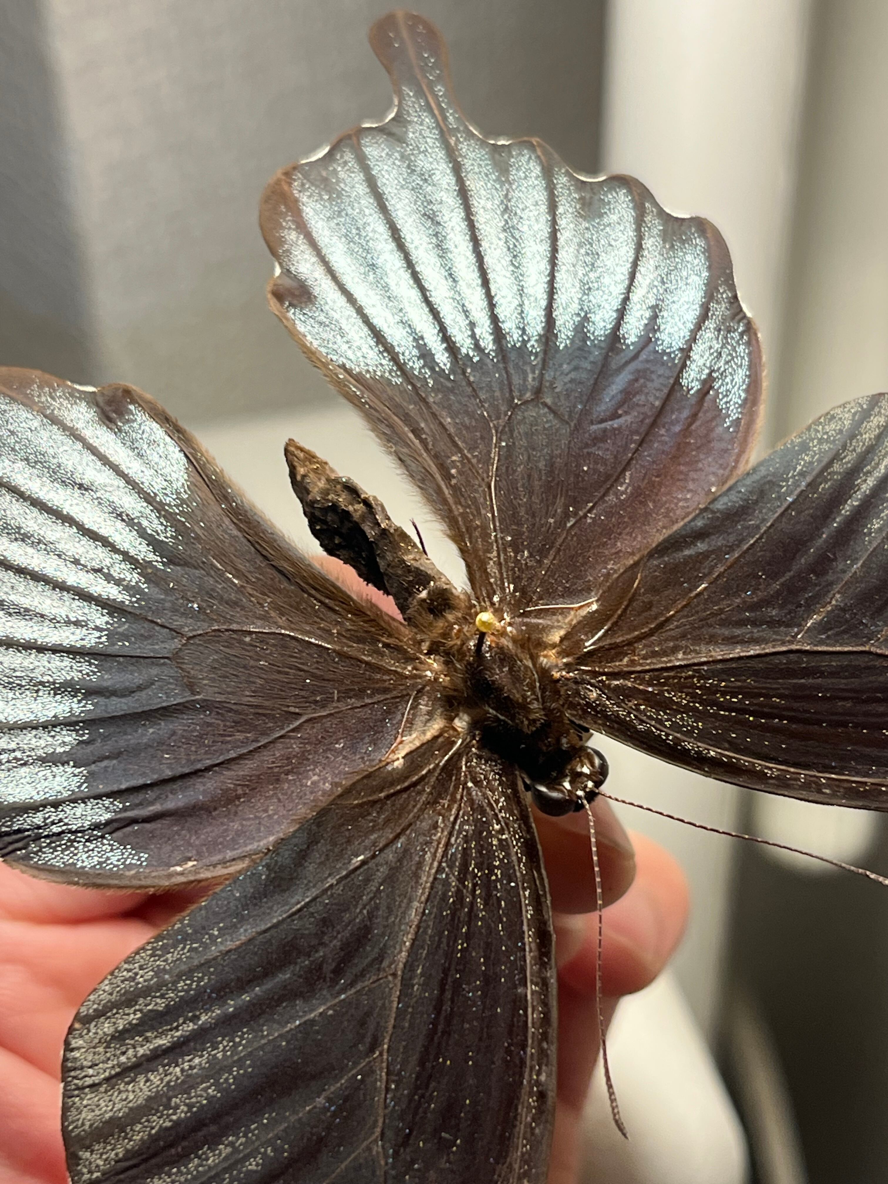 雄。尾部がなく、上面は濃い青から黒色です。前翅の羽根基部に赤い条線がある場合とない場合があります。