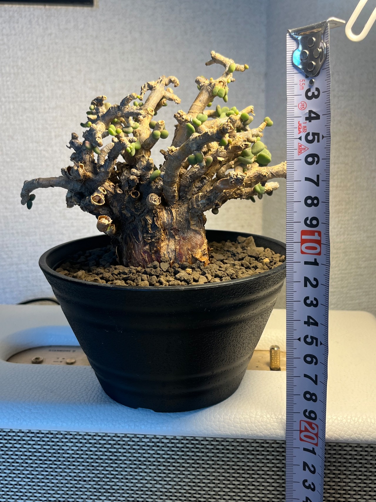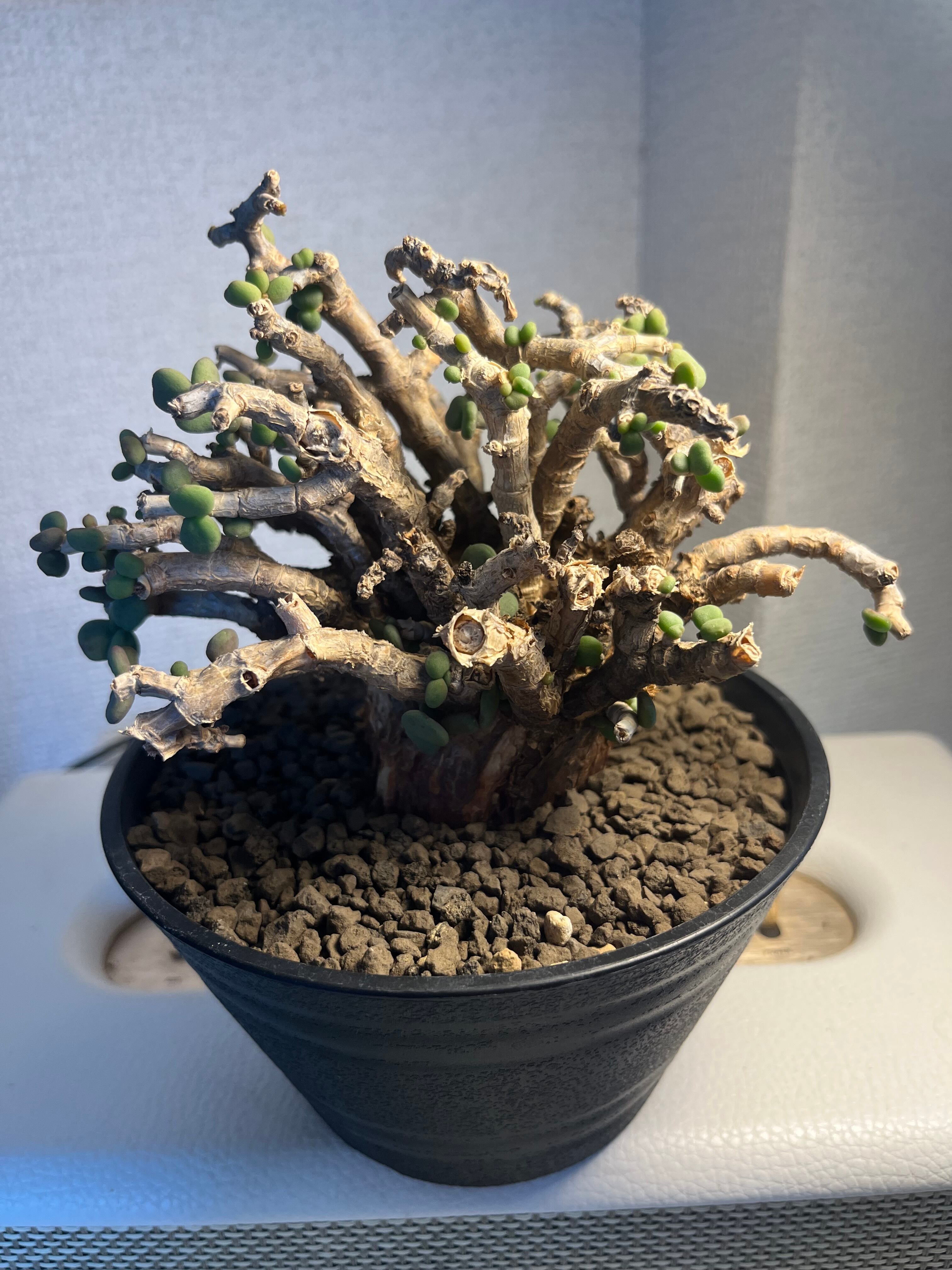 まるでジャガイモのような塊根部から枝を伸ばし、ゼリービーンズのようなプックリとした黄緑色で多肉質のきれいな葉をつけます。ピグマエア(小型)という名前から連想できる通り、コンパクトな塊根植物。