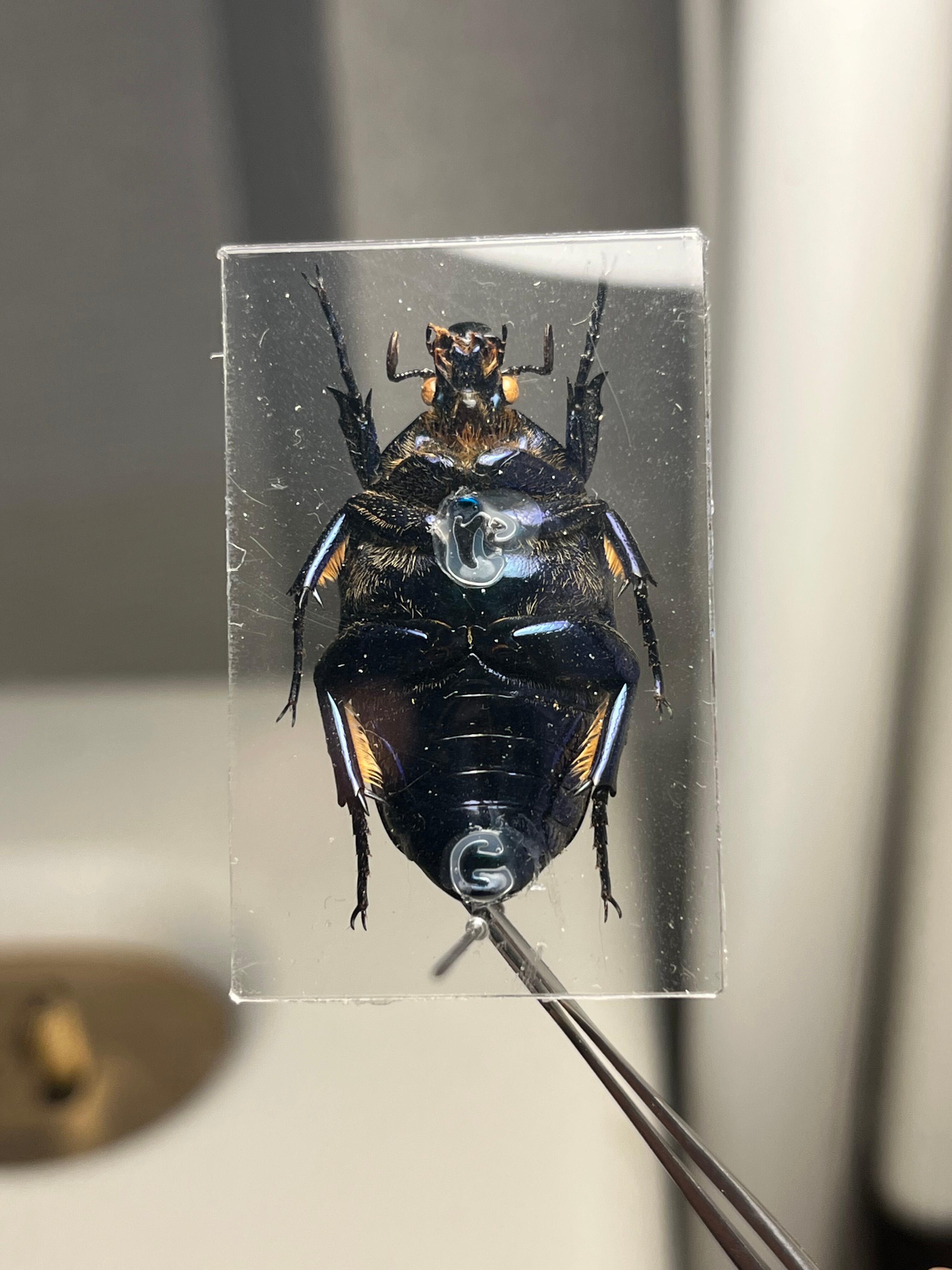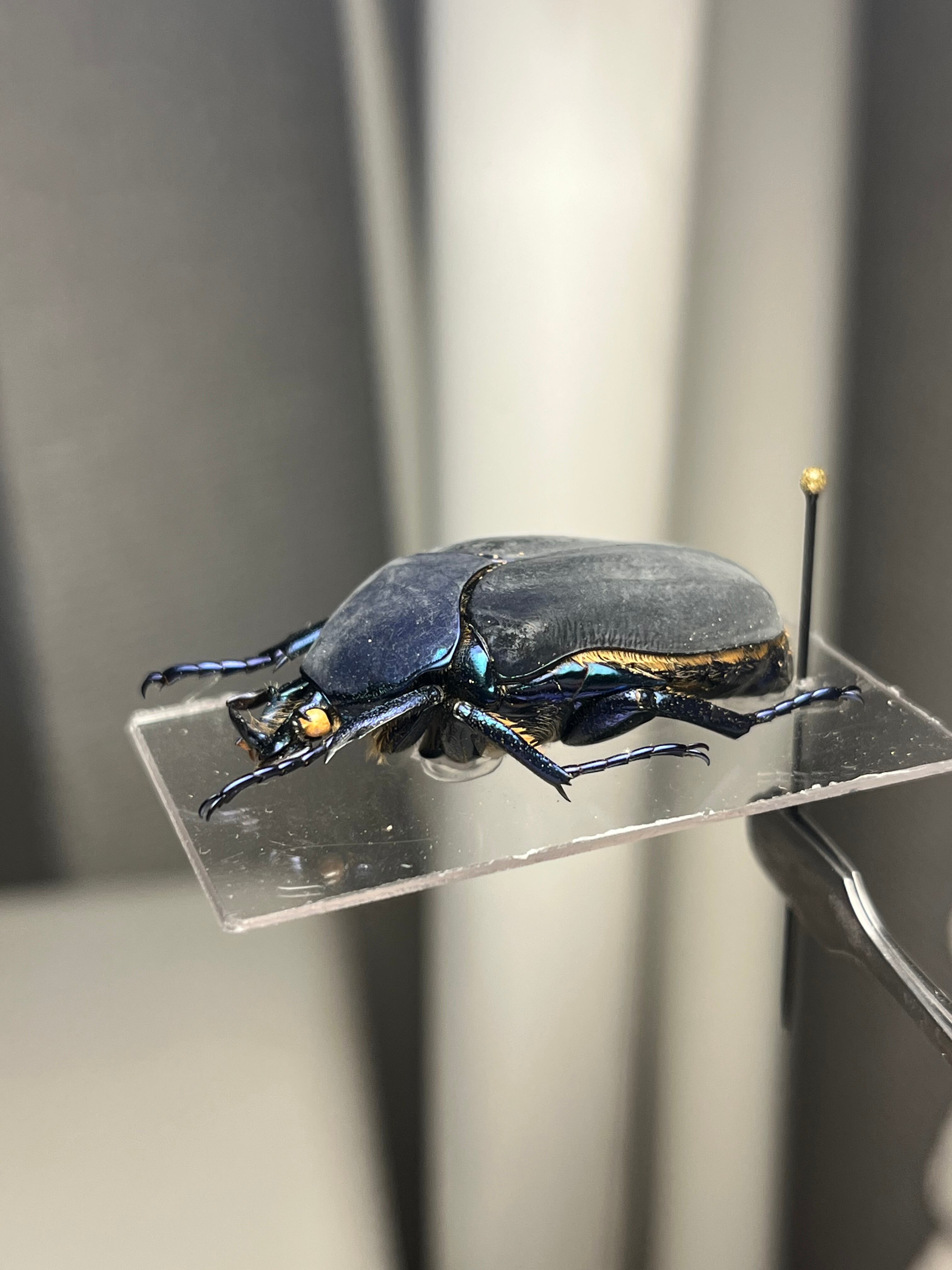 体表はアフリカのメキノリーナの様なマットなビロード状の微毛で覆われていますが、側面や裏側、6本の脚はメタリックな輝きを放っています。