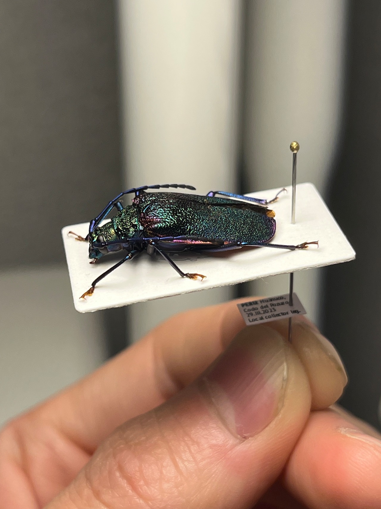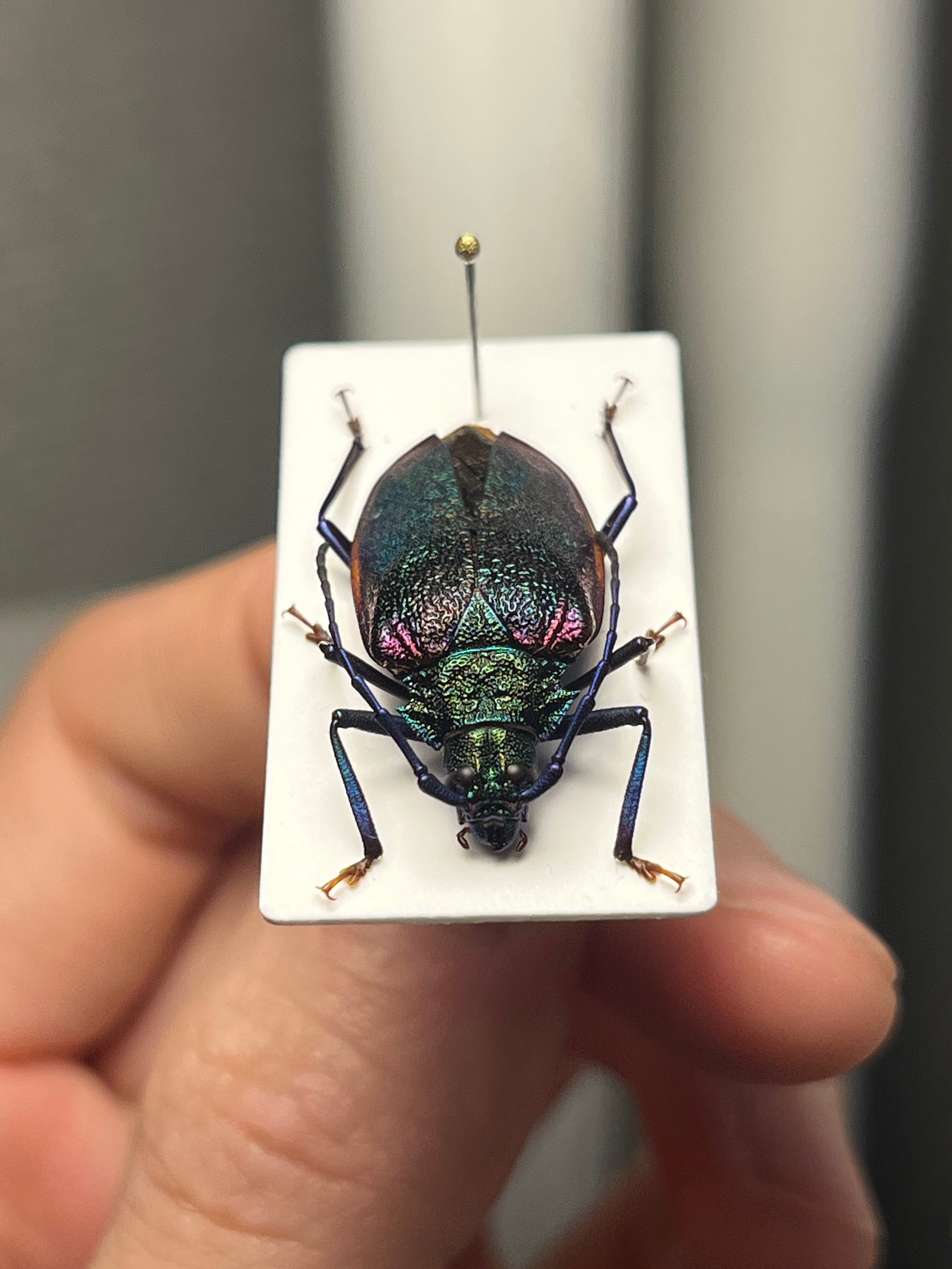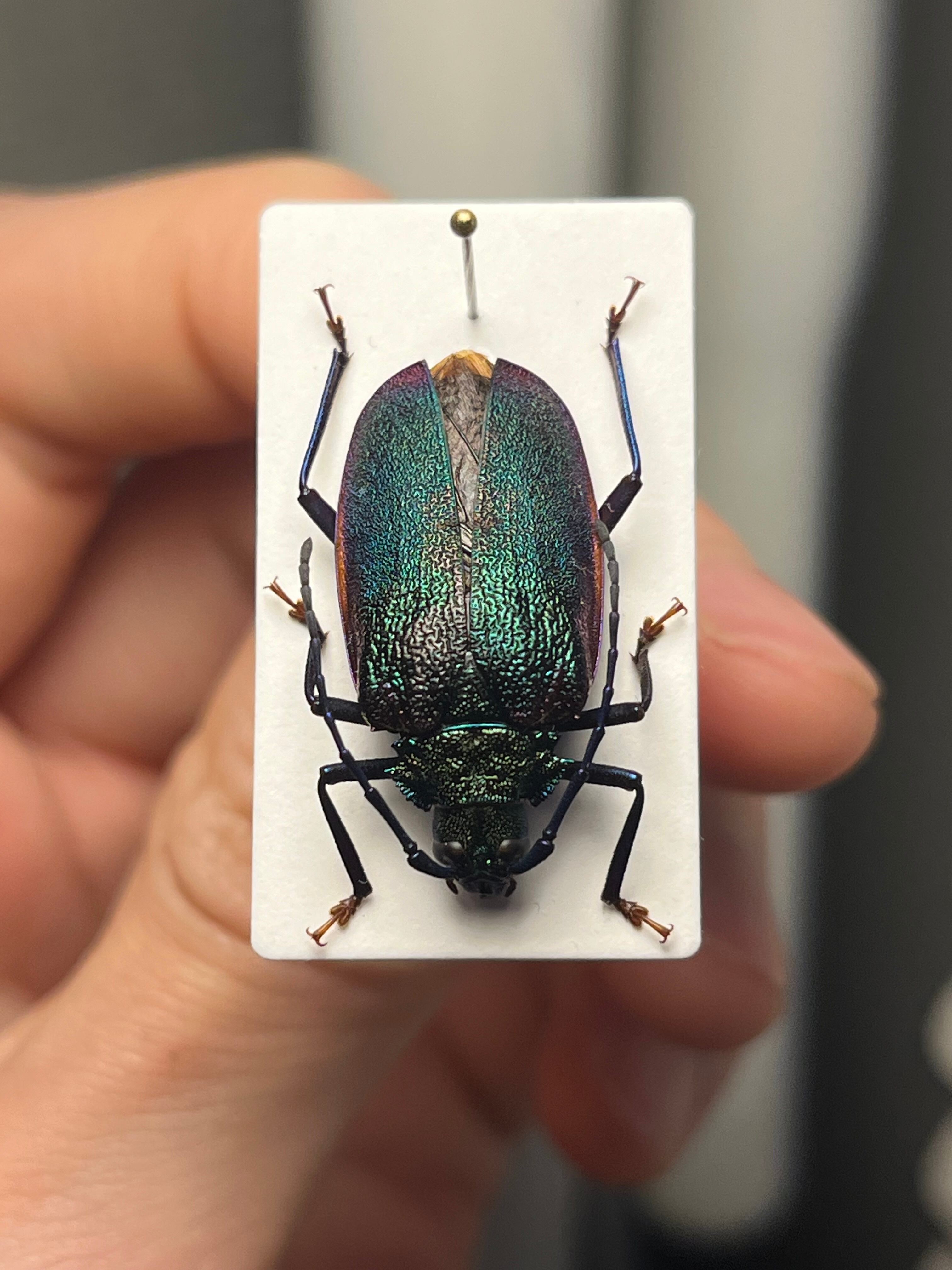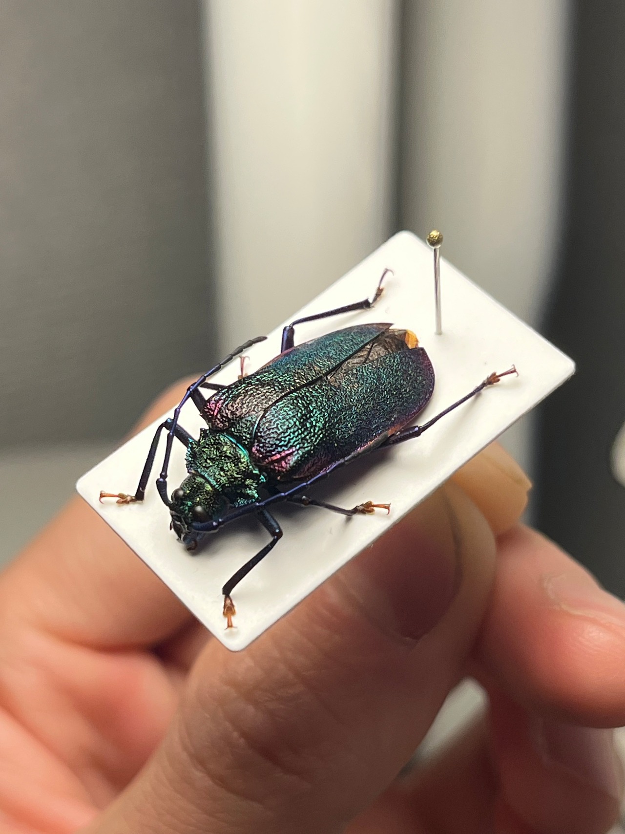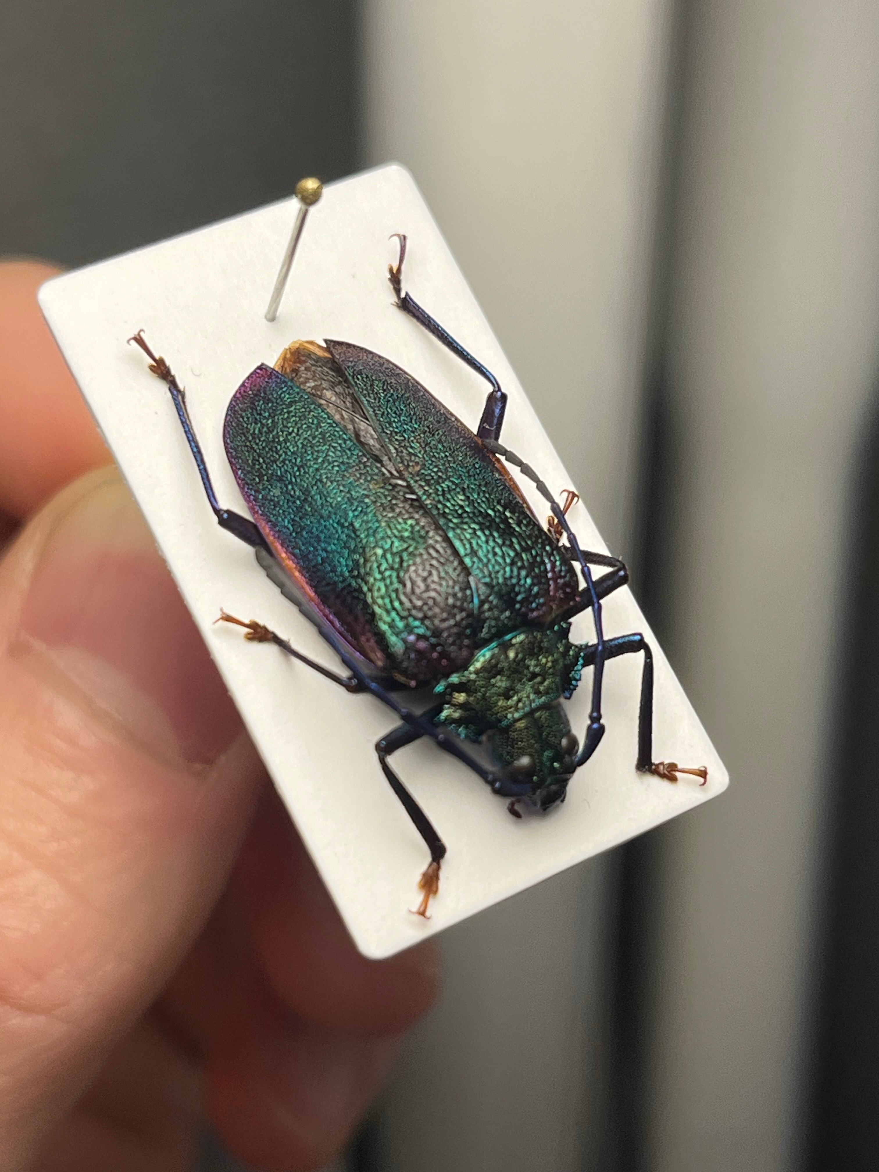 一般的な和名のブロンズノコギリは、オスの特徴からつけられたのではと思います。ノコギリカミキリの中でも最も美しい種のひとつです。