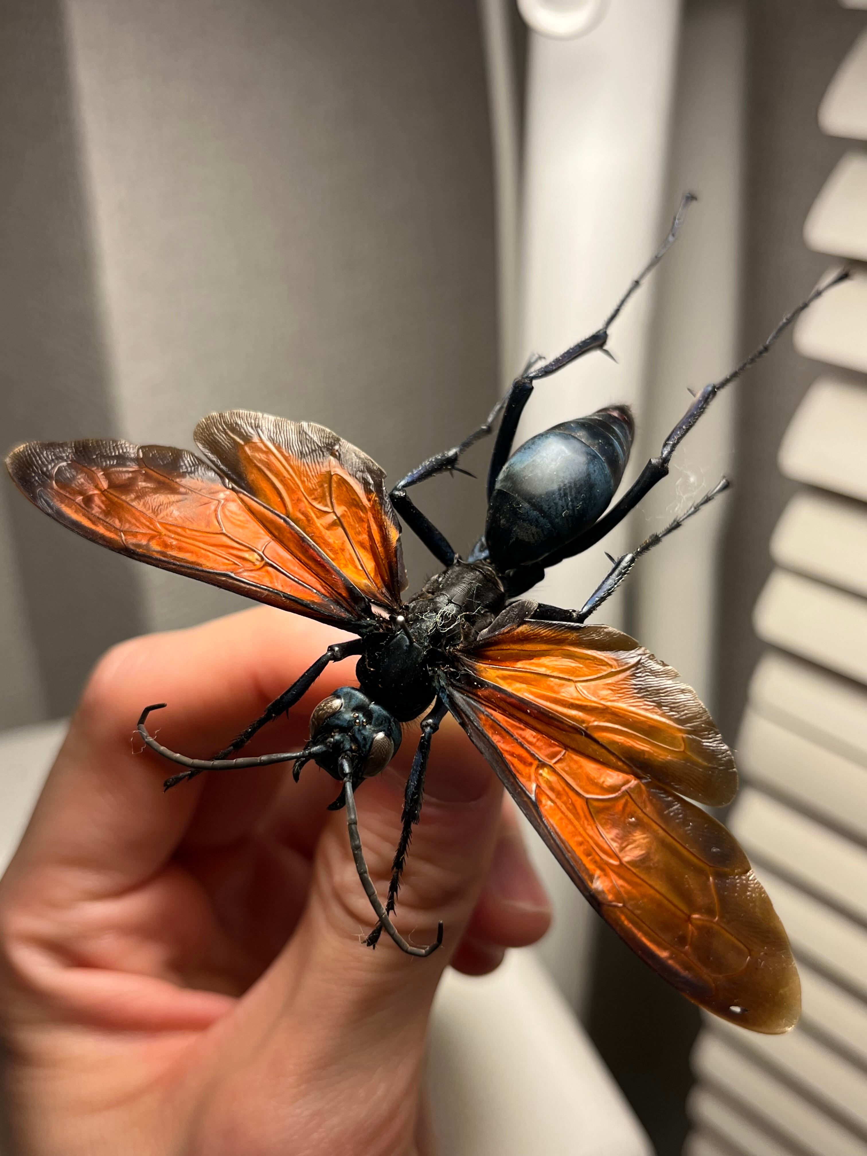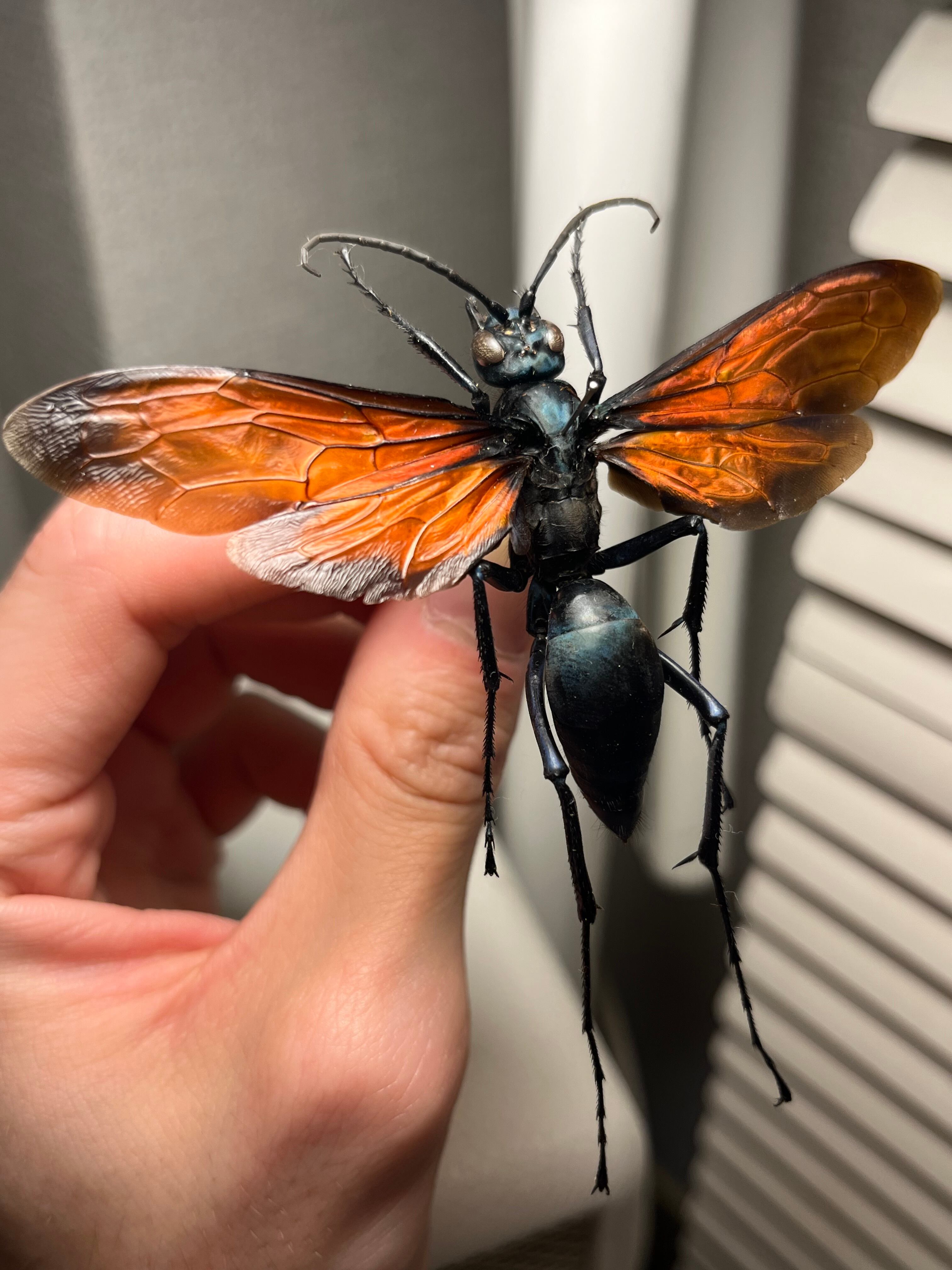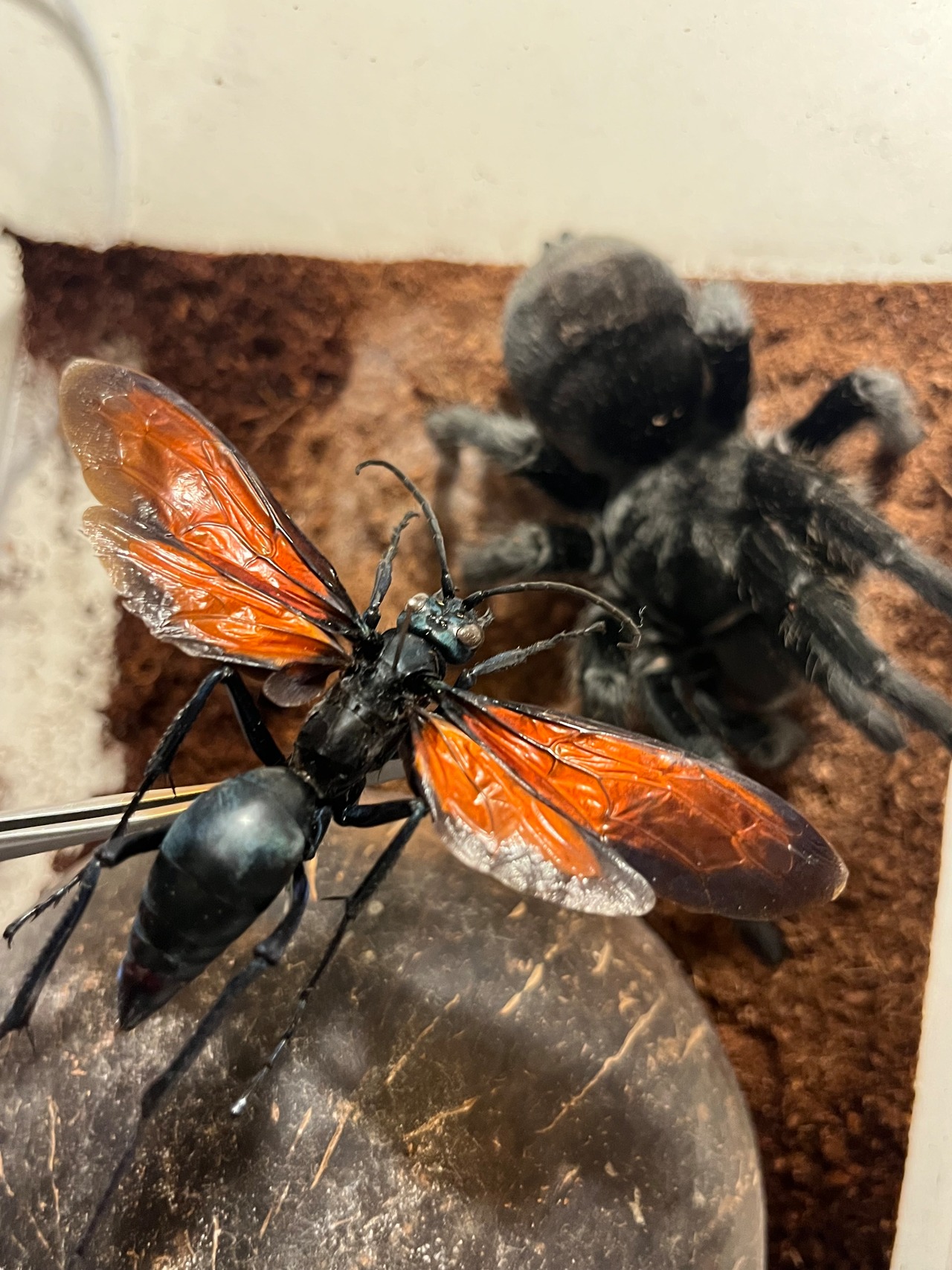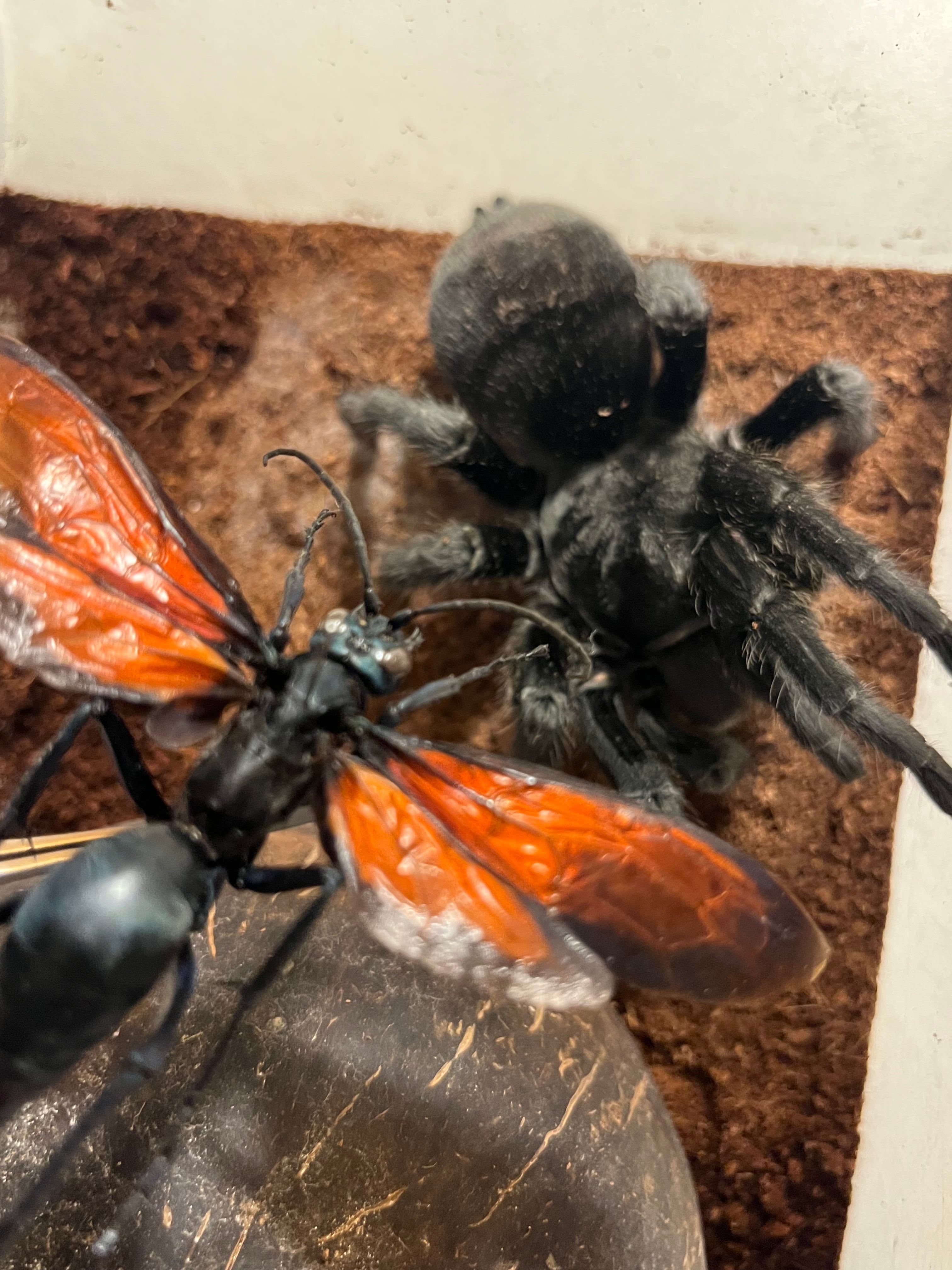 メタリックブルーの体色と赤い翅が美しい画像個体を配送します。サイズも大きいブラジル産になります。1枚目はブラジリアンブラックを襲うタランチュラホークになります。