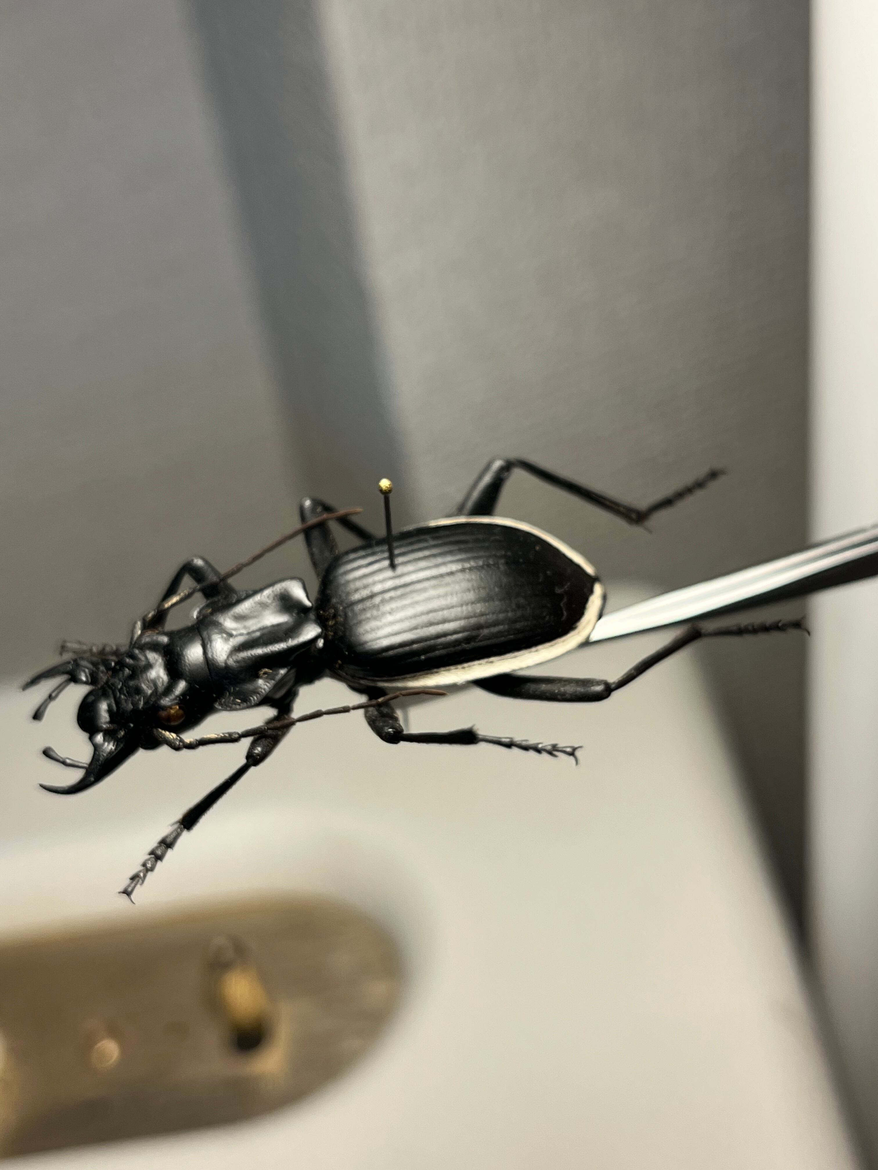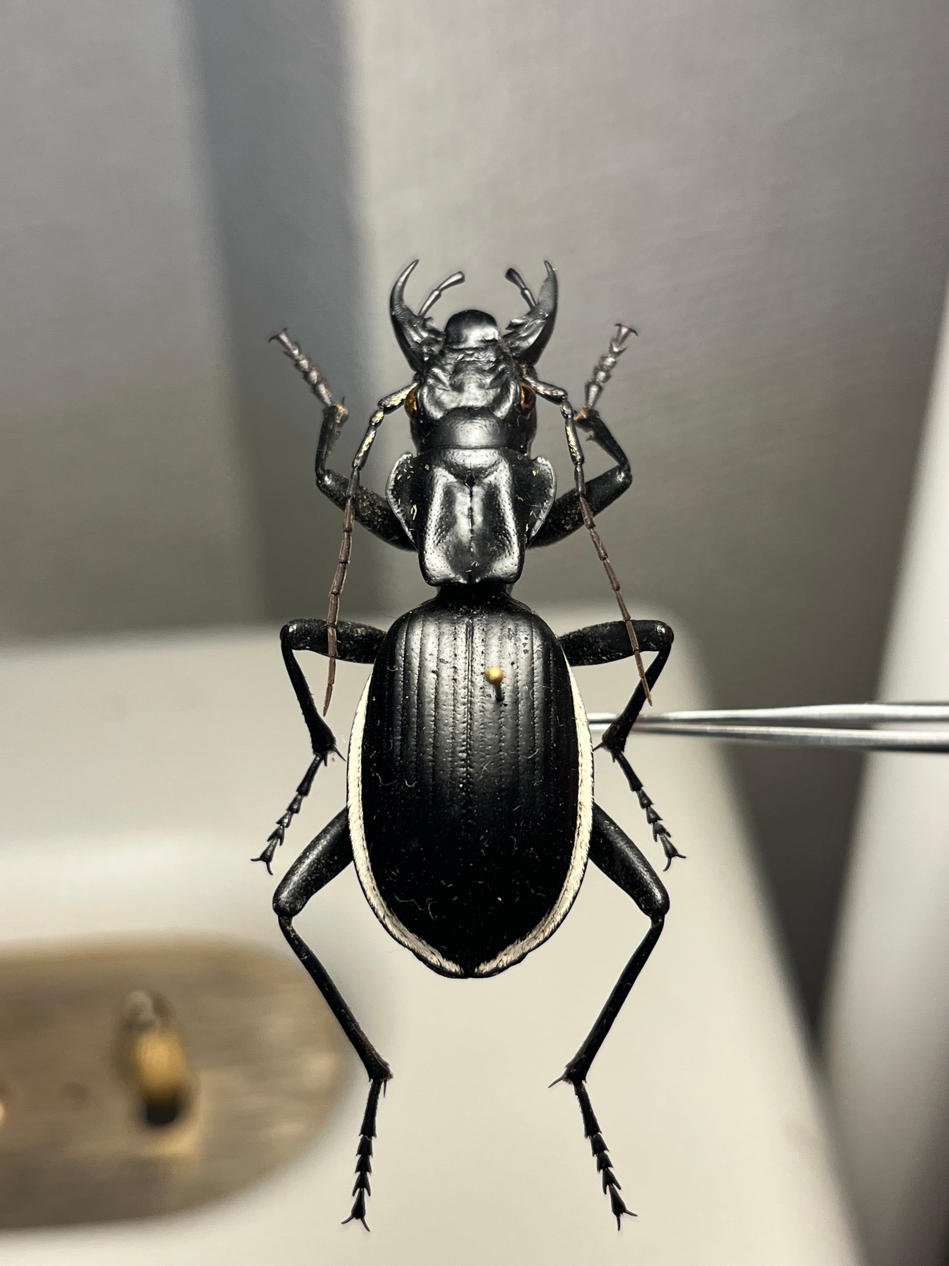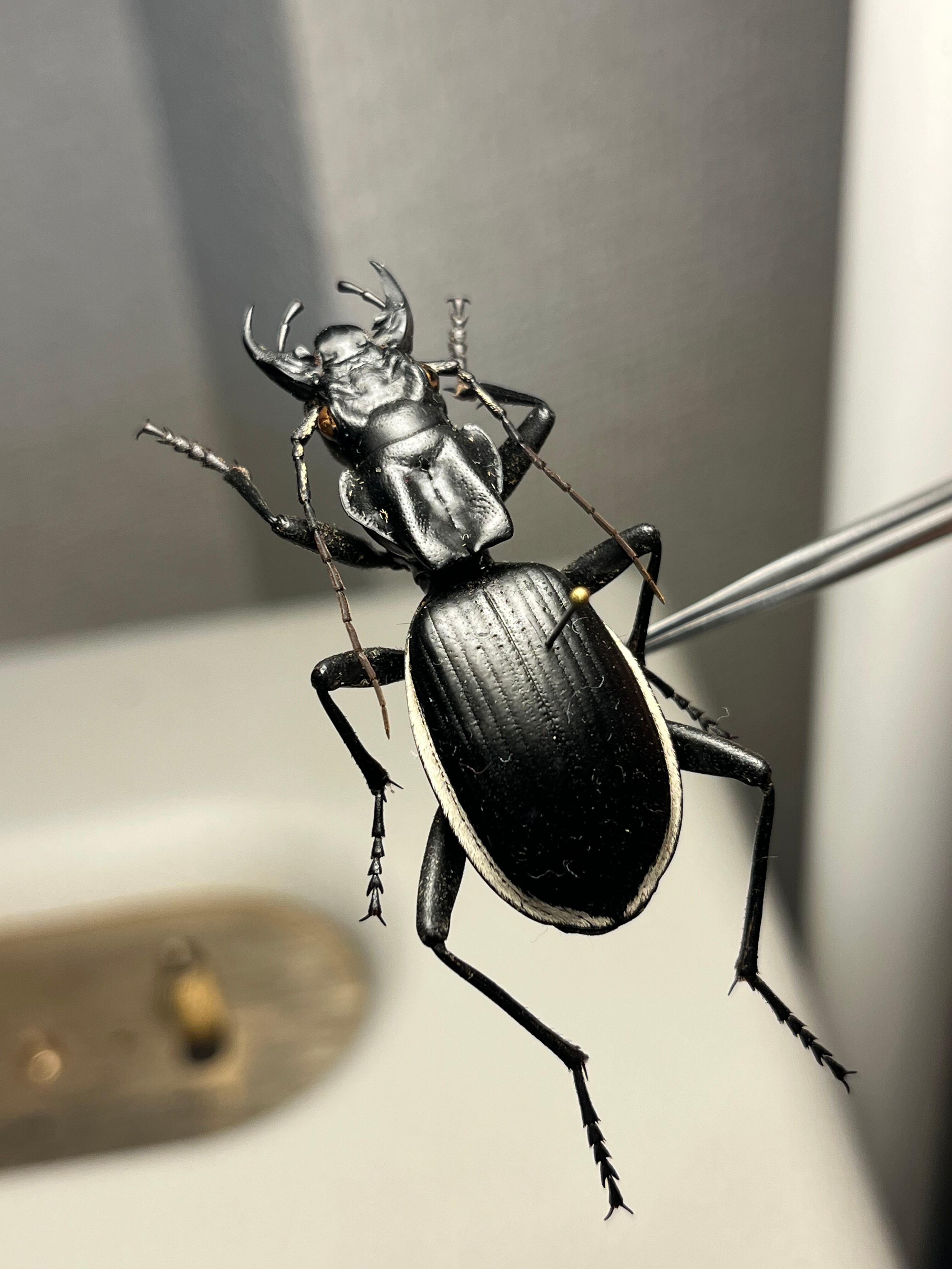 サウスアフリカンプレデタービートルは、アフリカの乾燥地帯に生息する肉食性の大型オサムシです。体長2〜5cm程度、黒いボディに頑丈な顎と白いラインが特徴で、俊敏な動きで餌を狩る獰猛なハンターとして知られています。