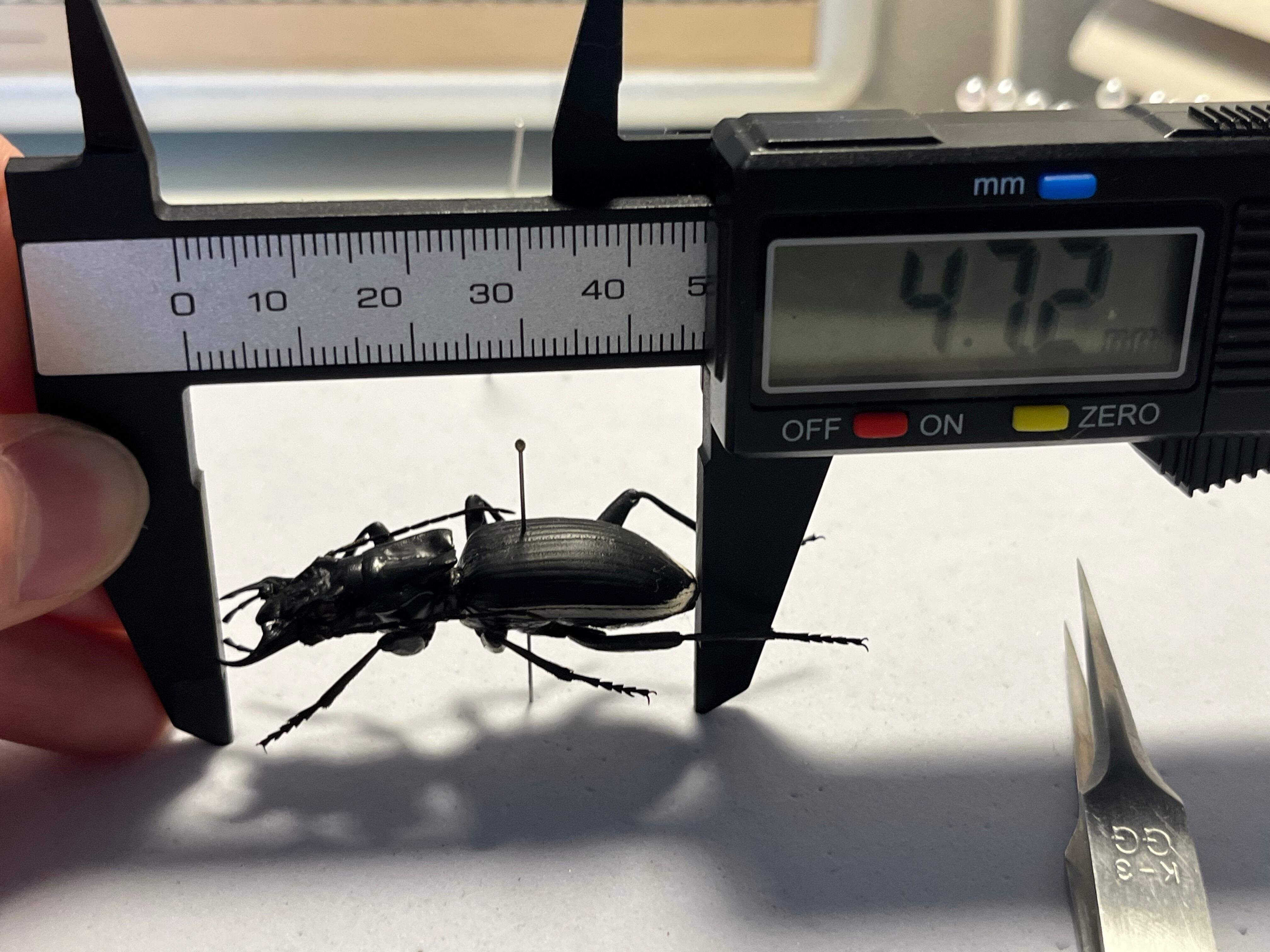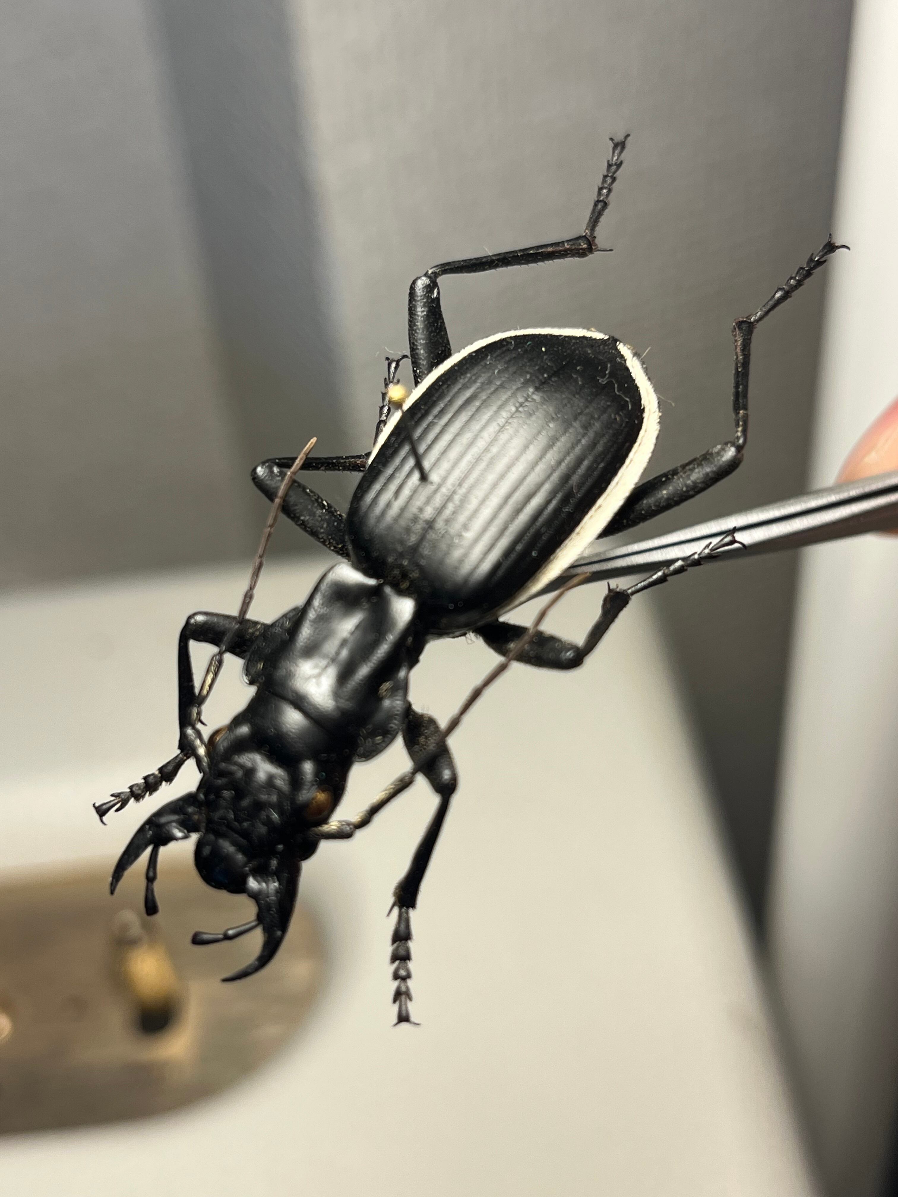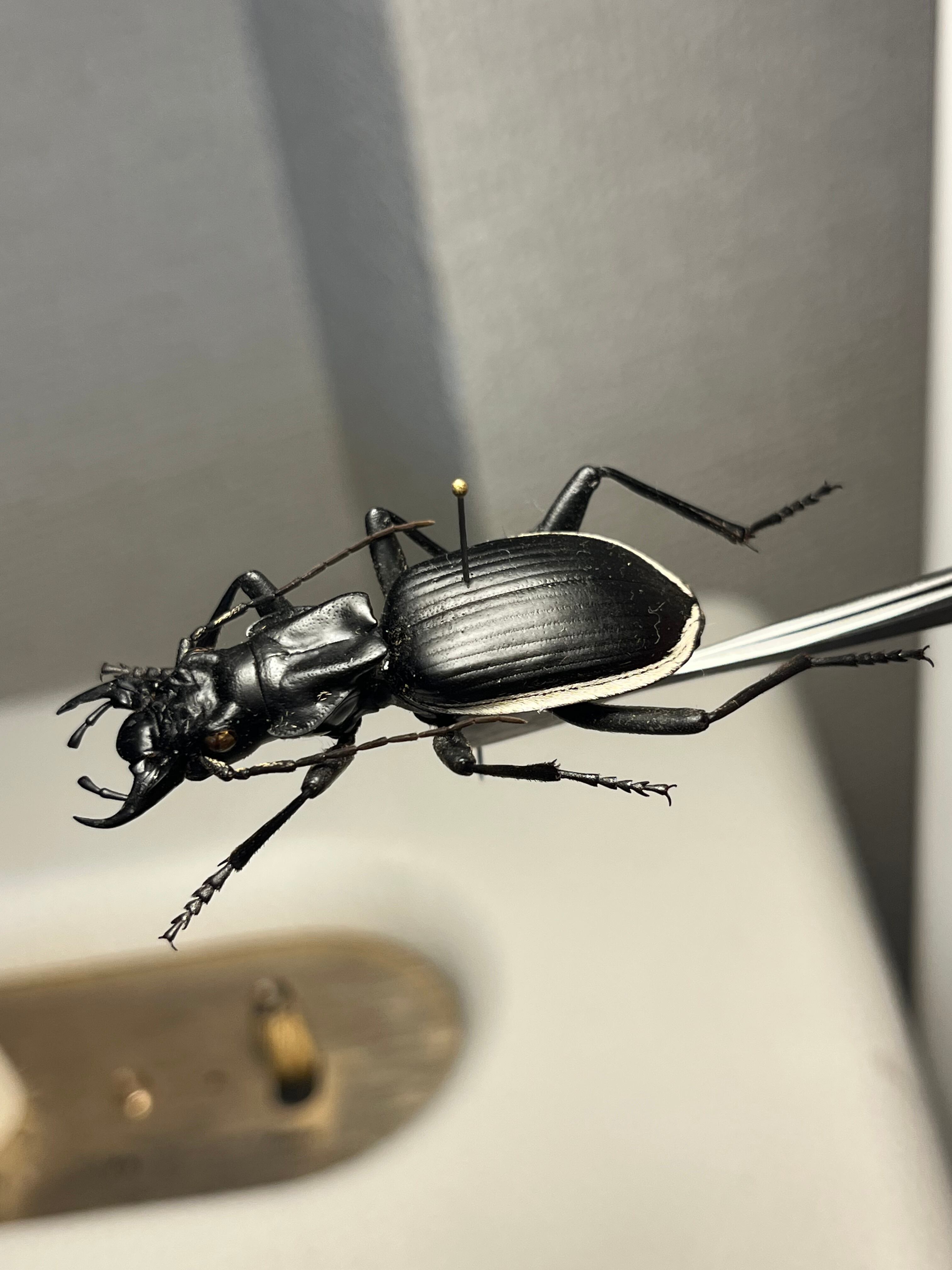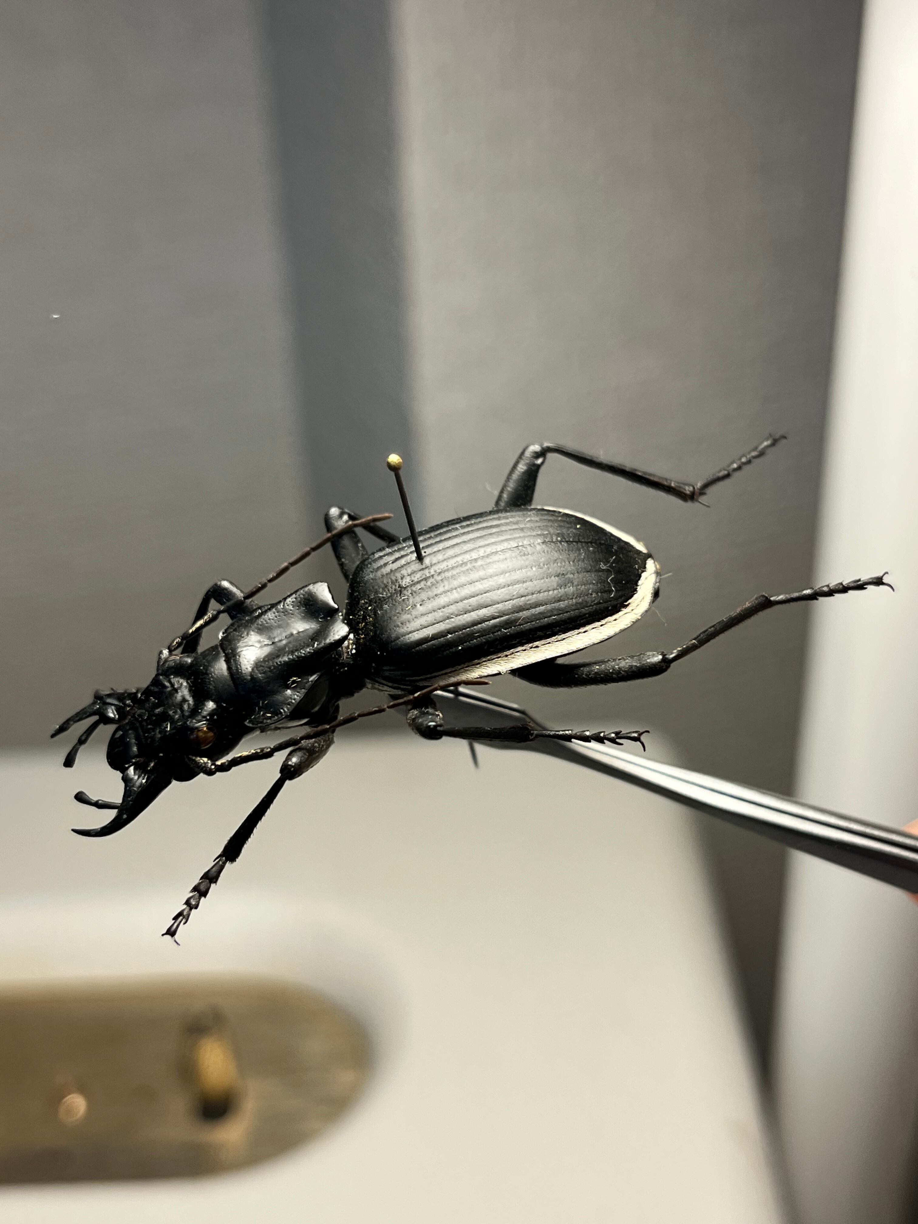 サウスアフリカンプレデタービートルは、アフリカの乾燥地帯に生息する肉食性の大型オサムシです。体長2〜5cm程度、黒いボディに頑丈な顎と白いラインが特徴で、俊敏な動きで餌を狩る獰猛なハンターとして知られています。