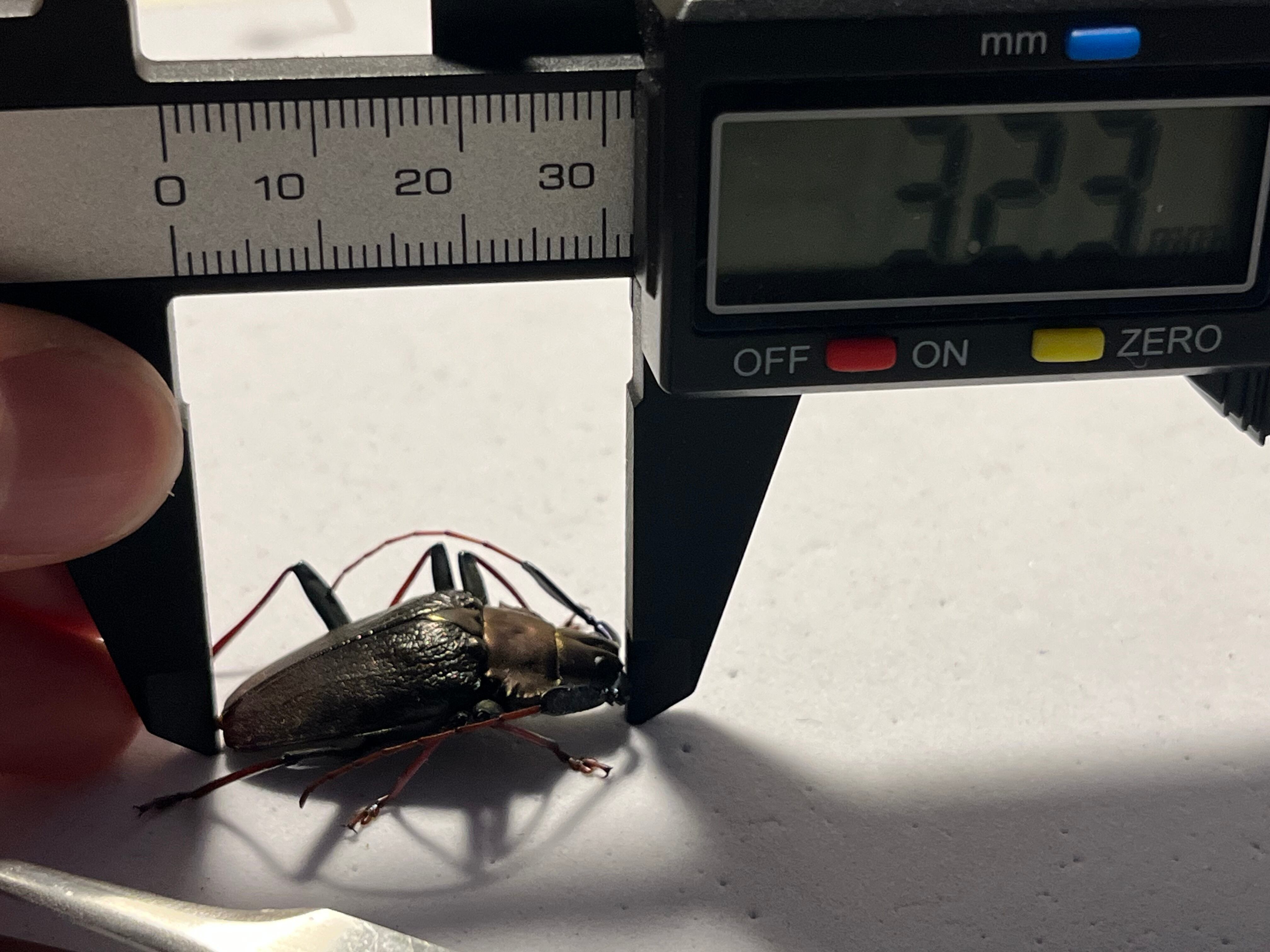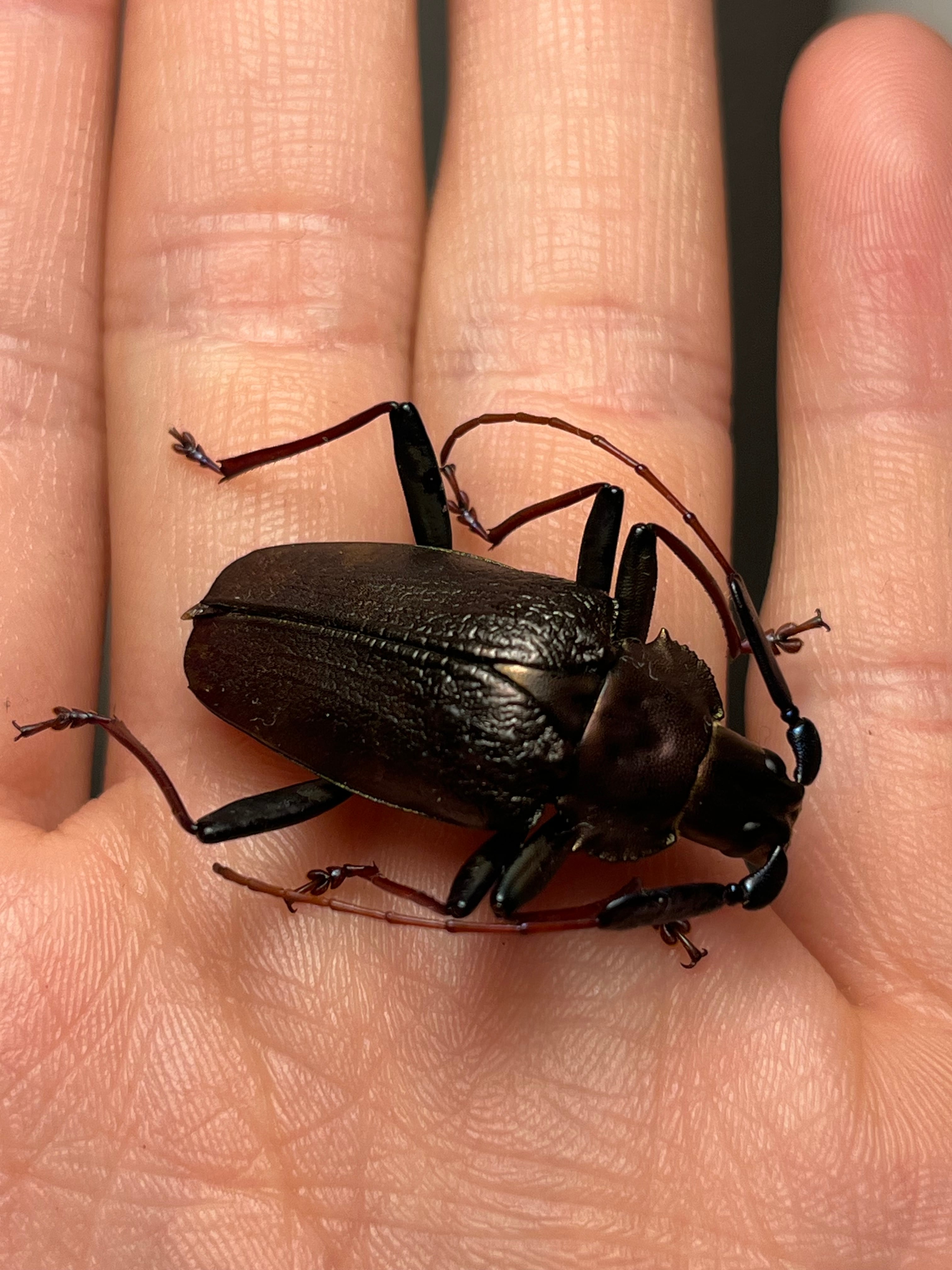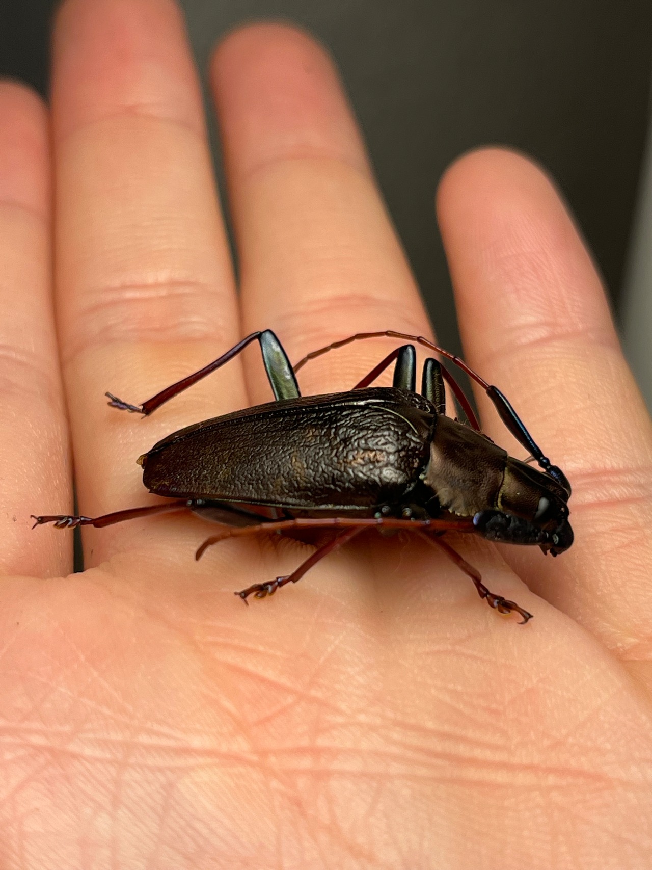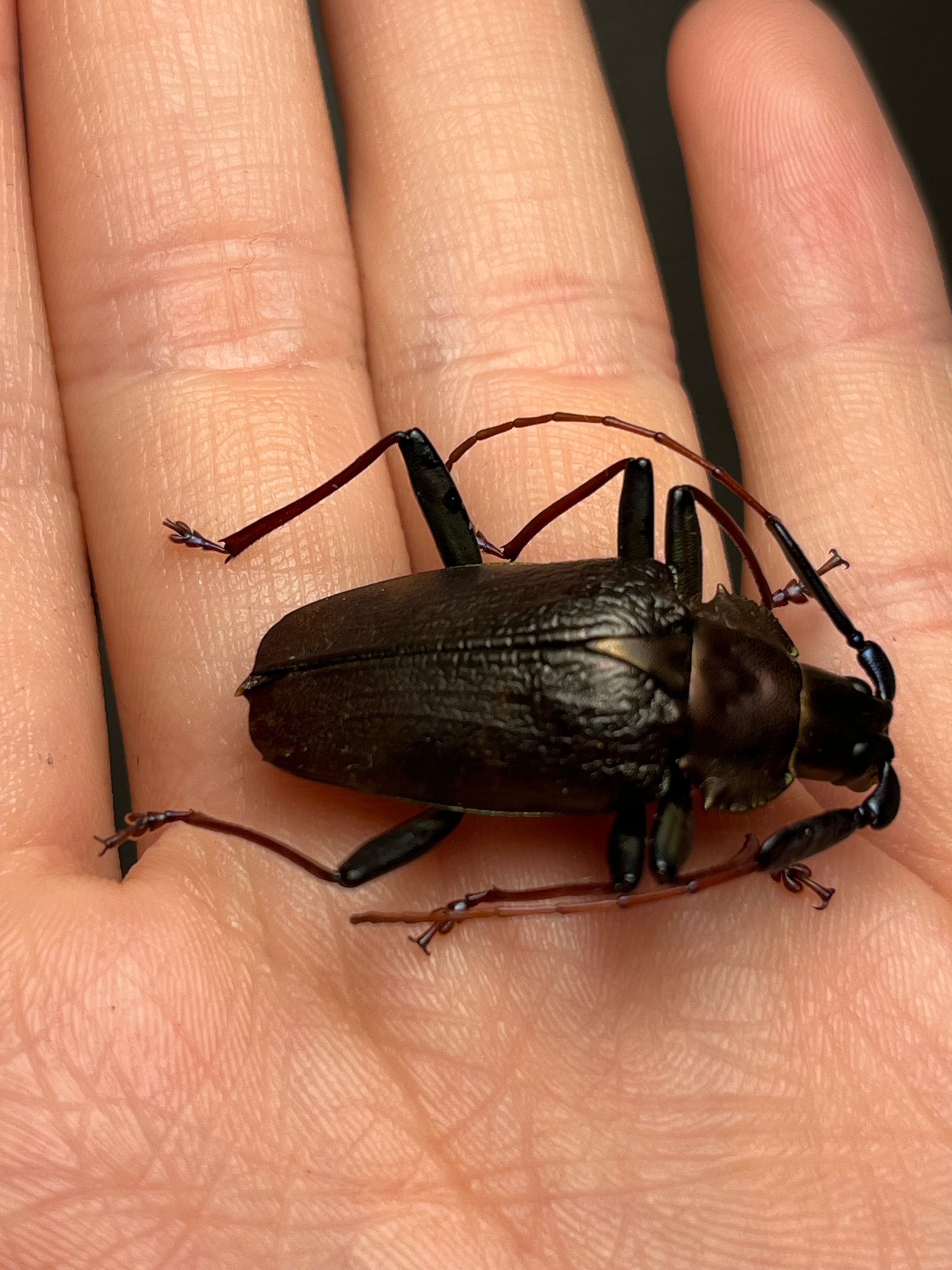 一般的な和名のブロンズノコギリは、オスの特徴からつけられたのではと思います。ノコギリカミキリの中でも最も美しい種のひとつです。