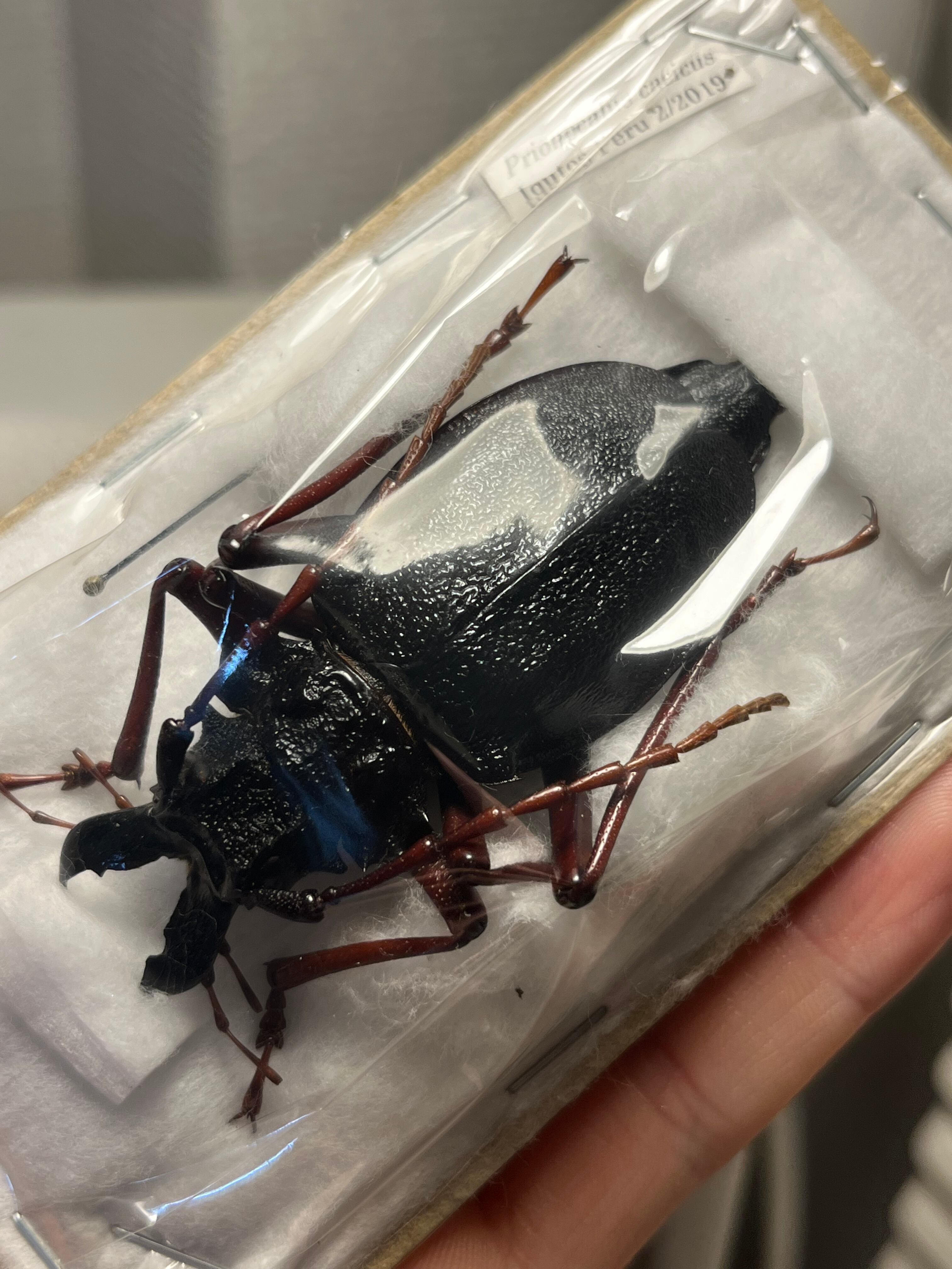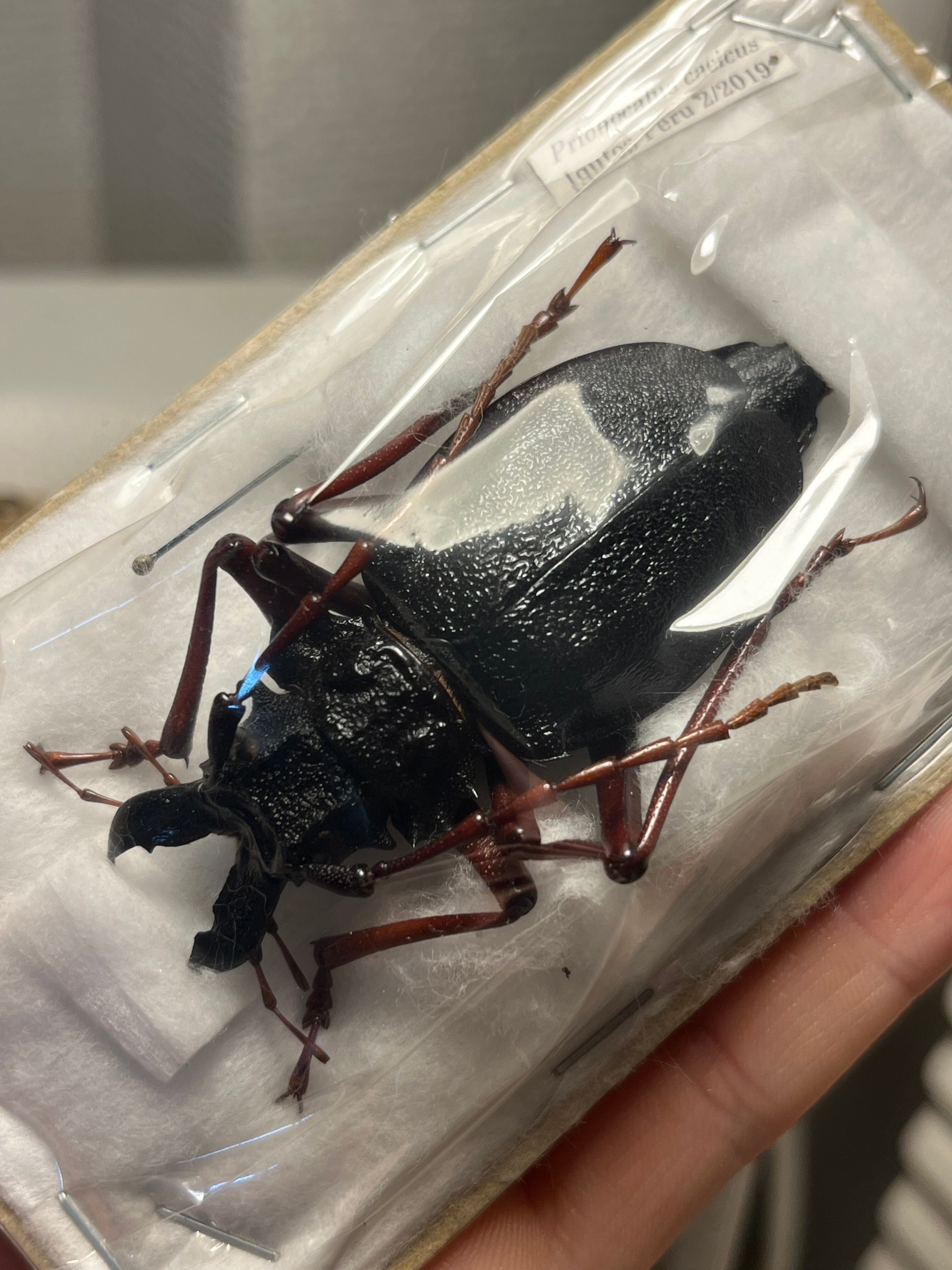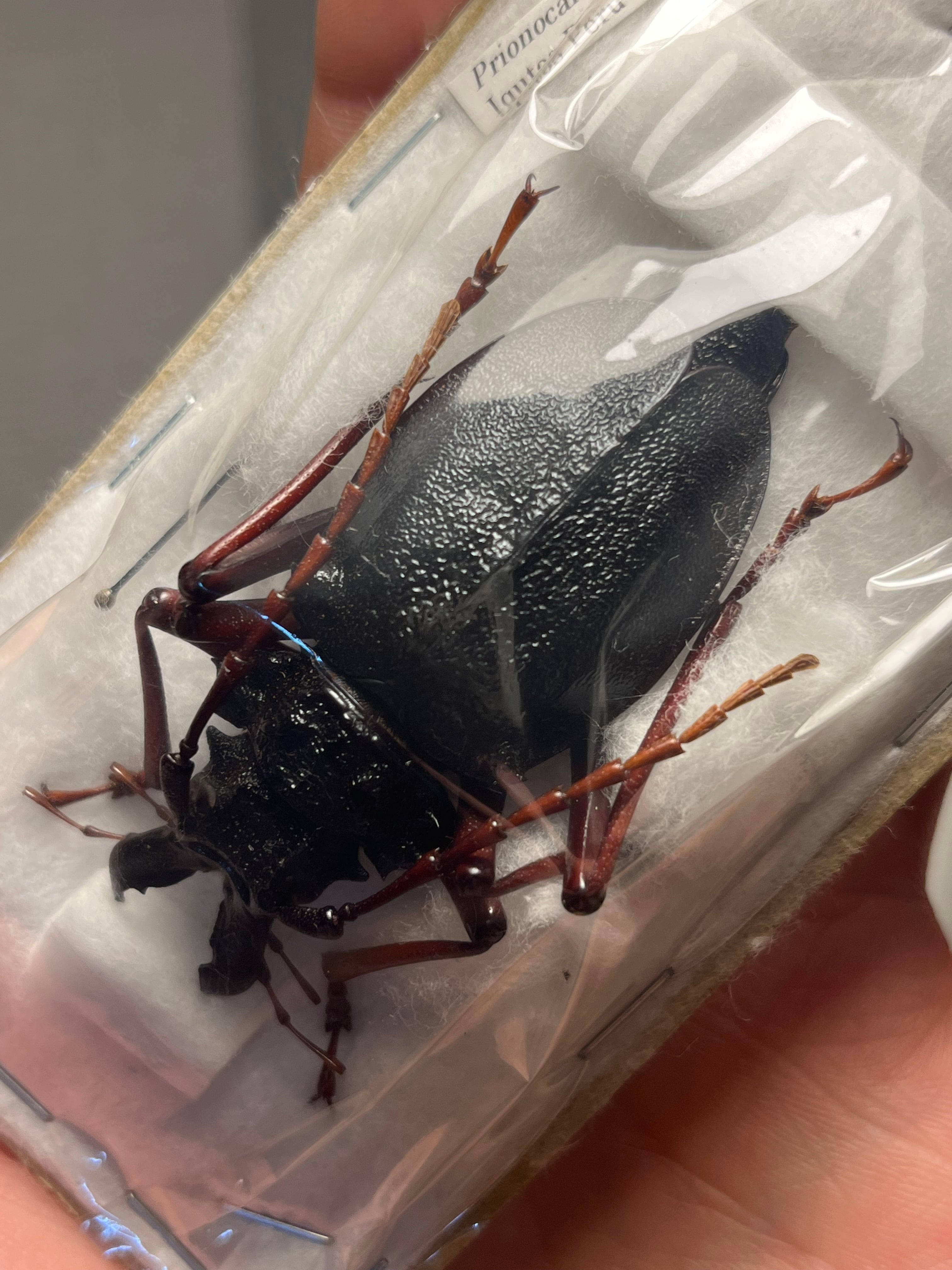 ペルーの飛べないカミキリ。左右非対称の大顎がすごい迫力です。顎先から翅端までは60mmほどですが、脚がたいへん長いので大きく見えます。