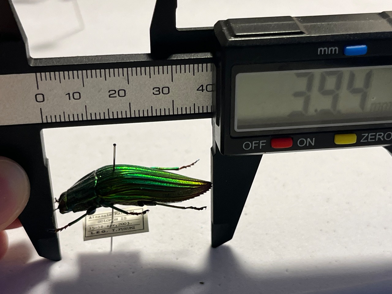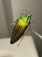 主にソロモン諸島のマライタ島やサンタクルーズ諸島に生息する、35〜39mm前後の大型のタマムシです。セダカタマムシ属に分類され、メタリックな緑色や青色の光沢を持つ、非常に美しい甲虫として標本市場で人気があります。