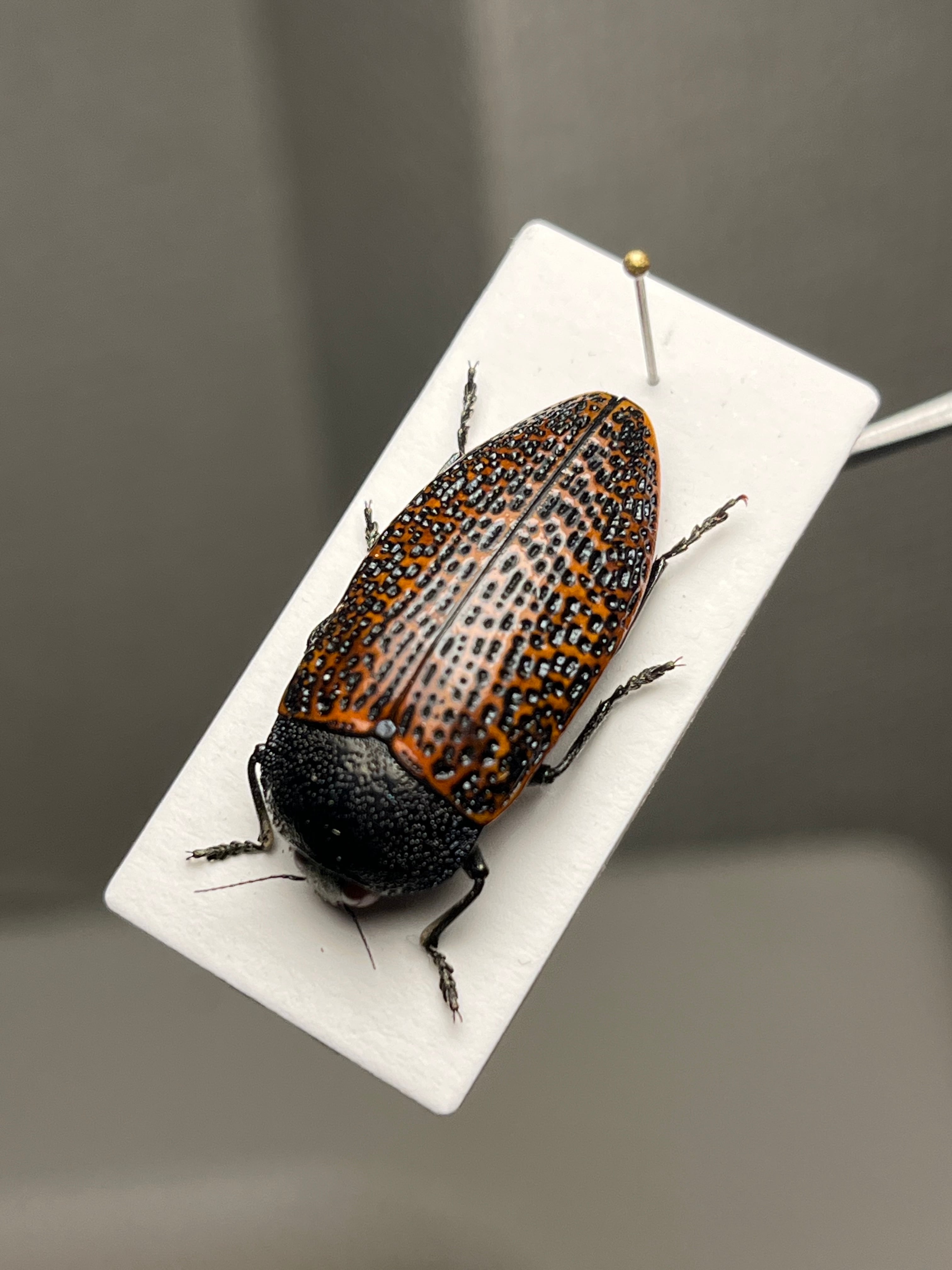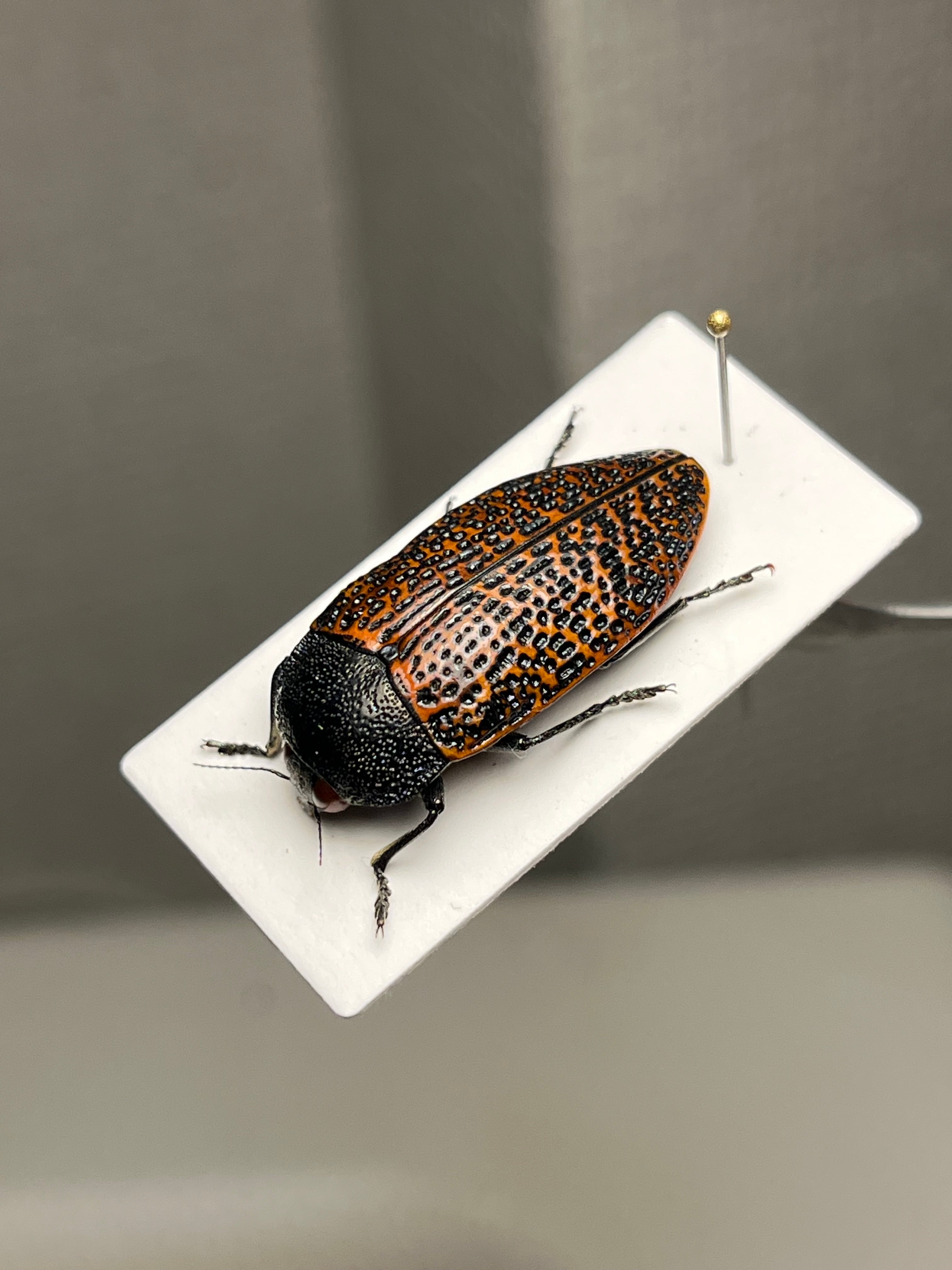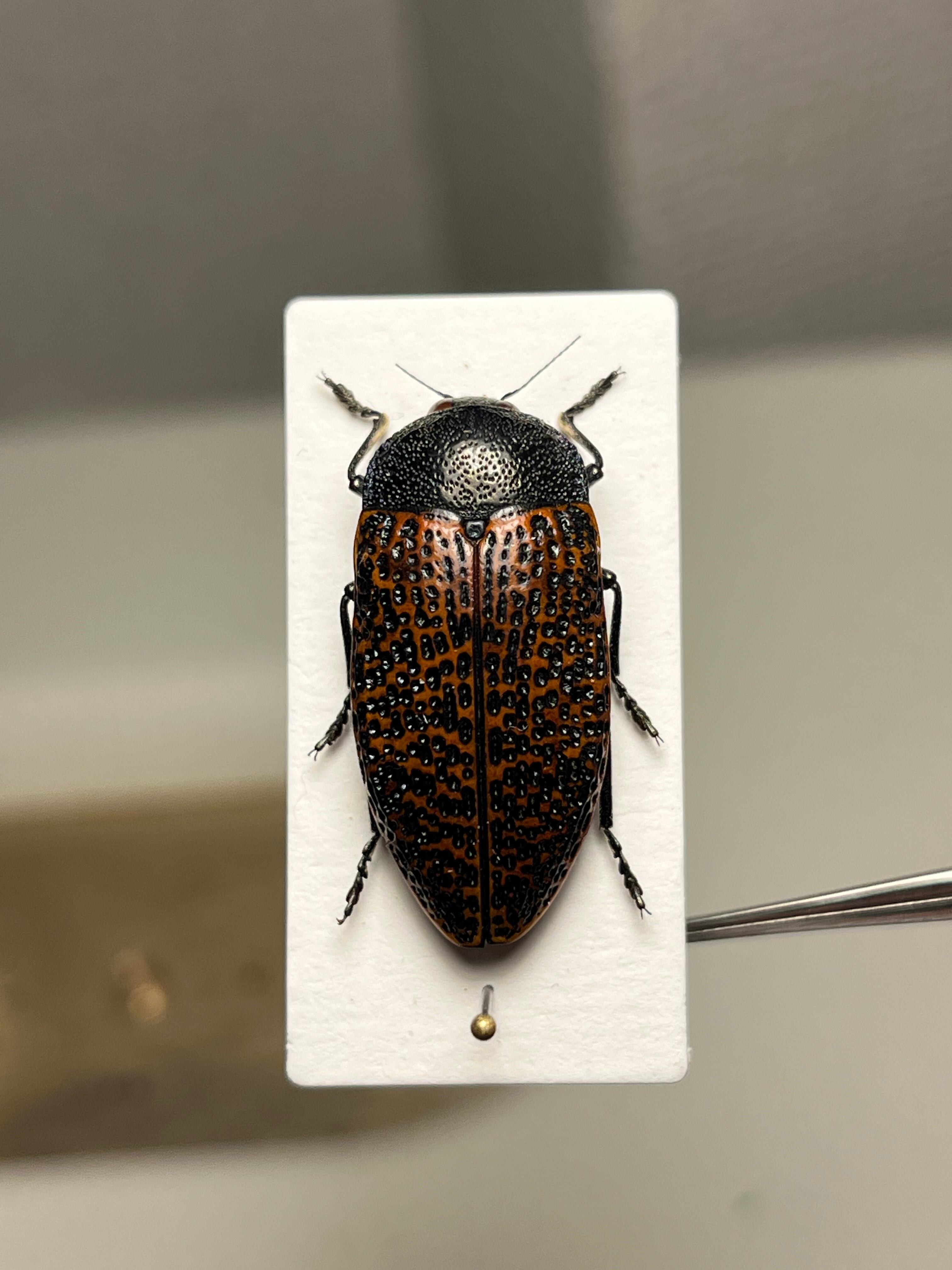 朱色の翅に、深く刻まれた点刻が青黒く光る、大変美しい種です。