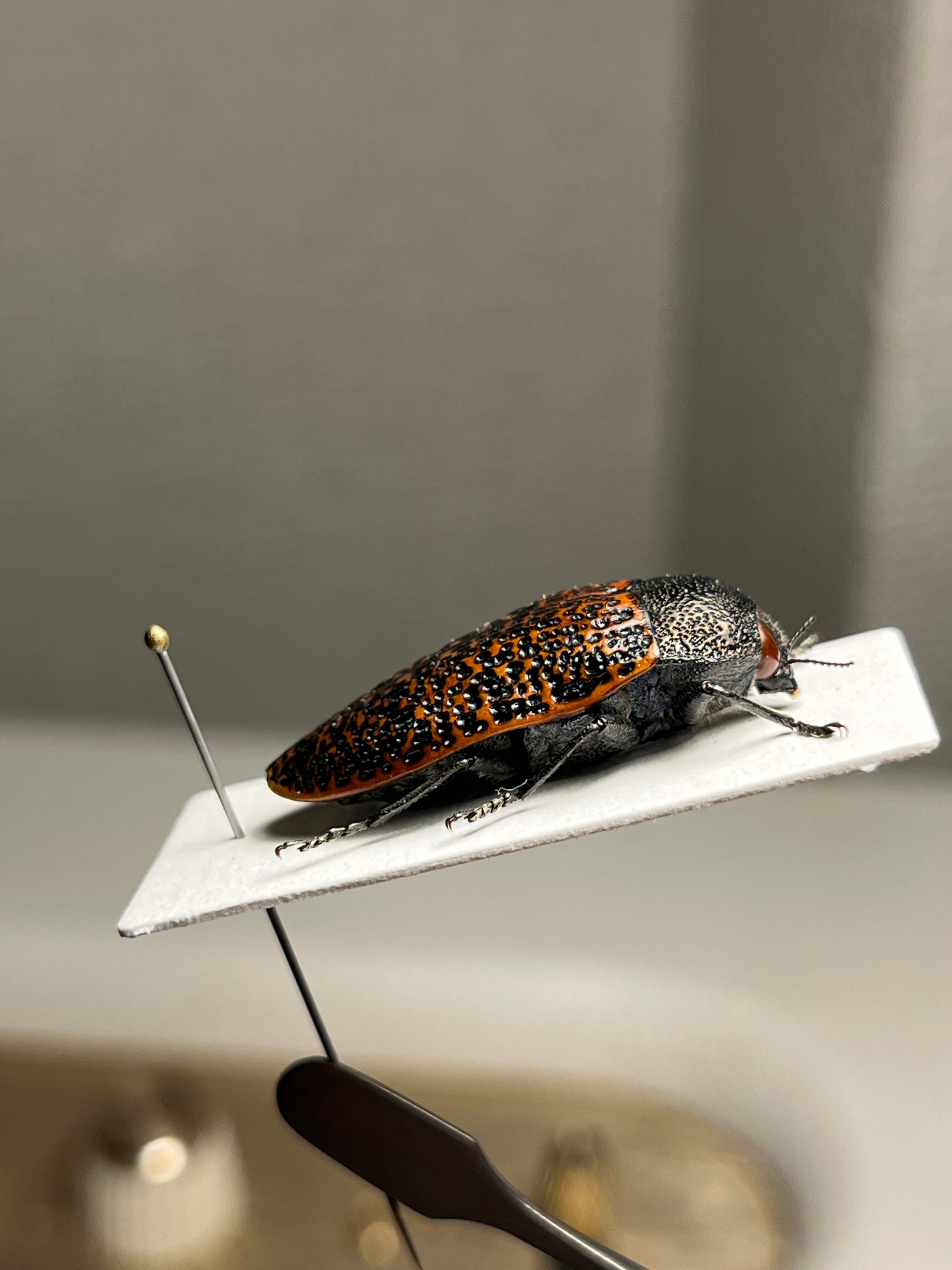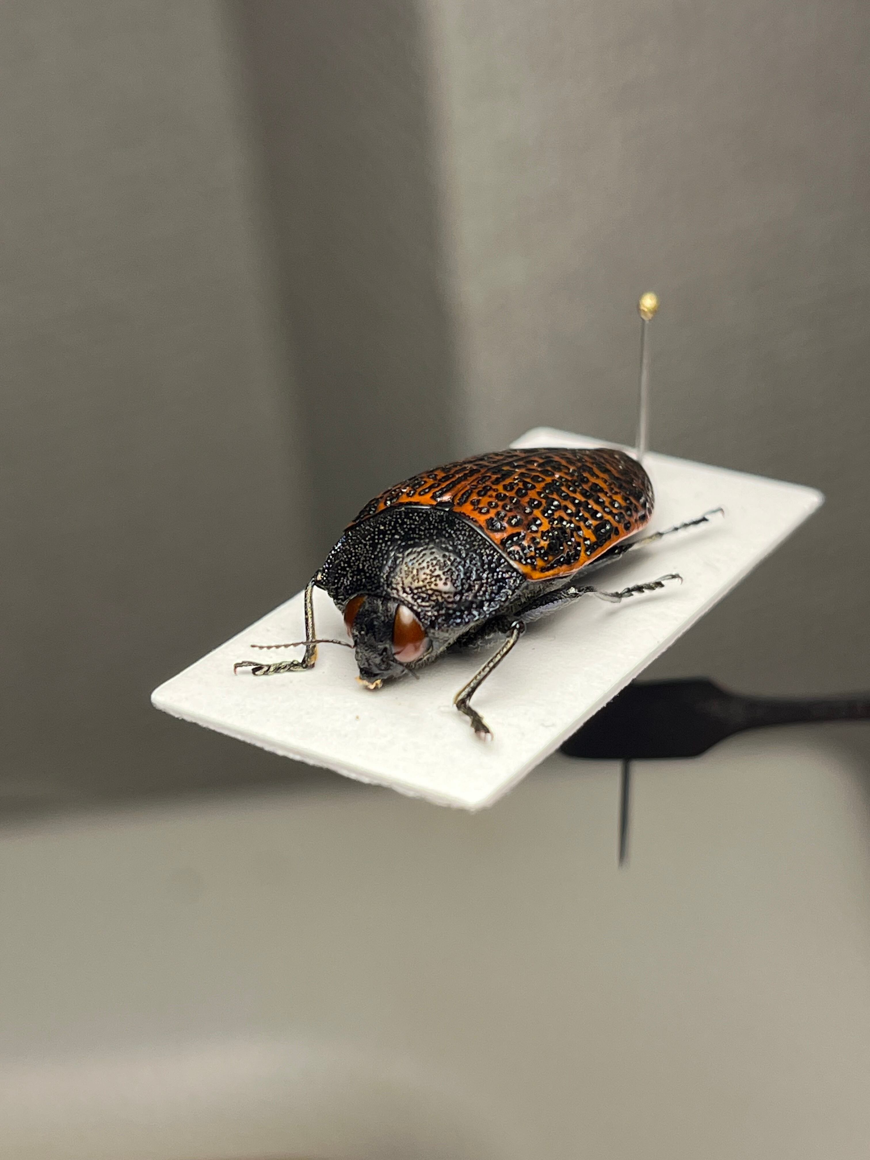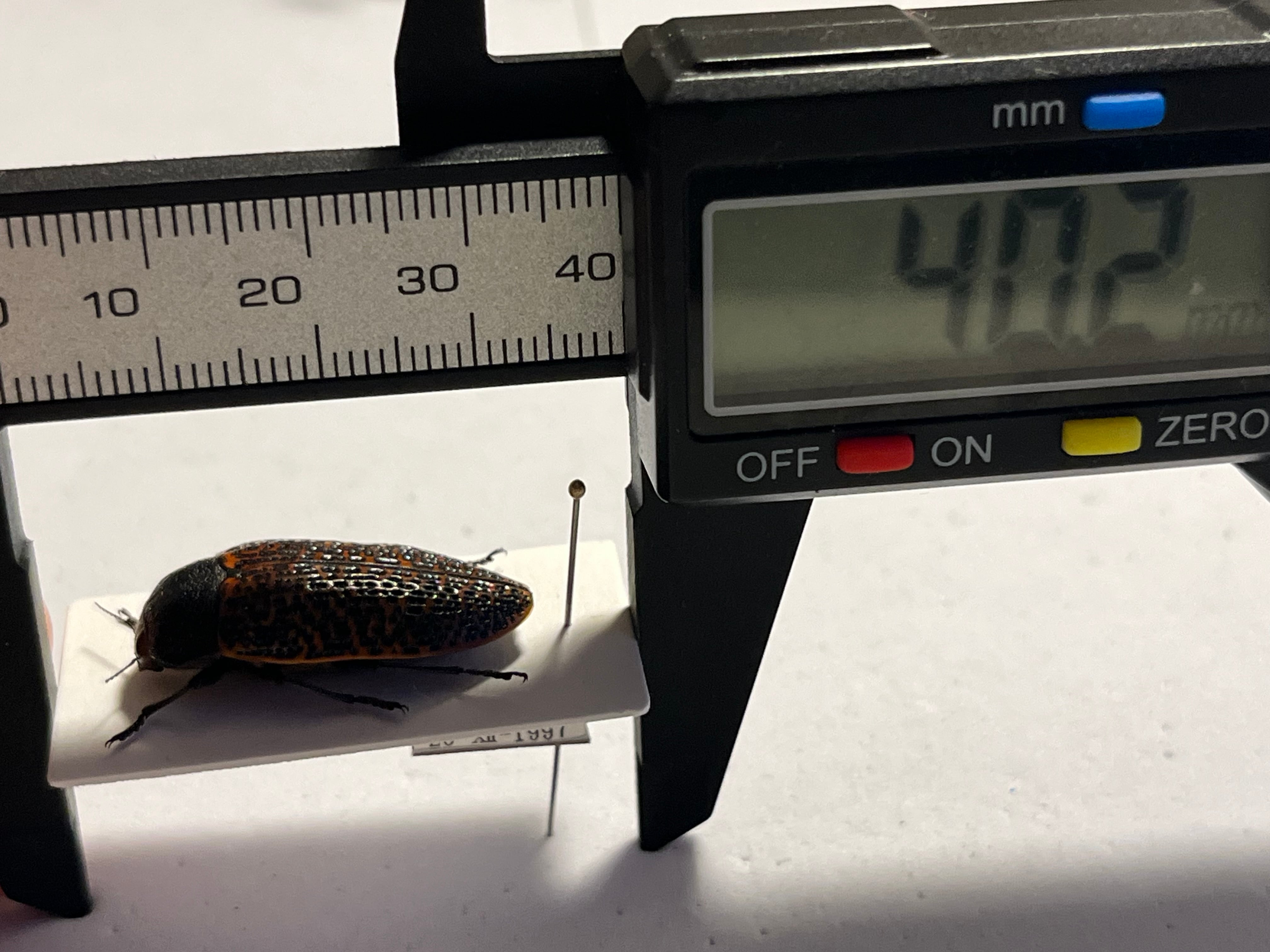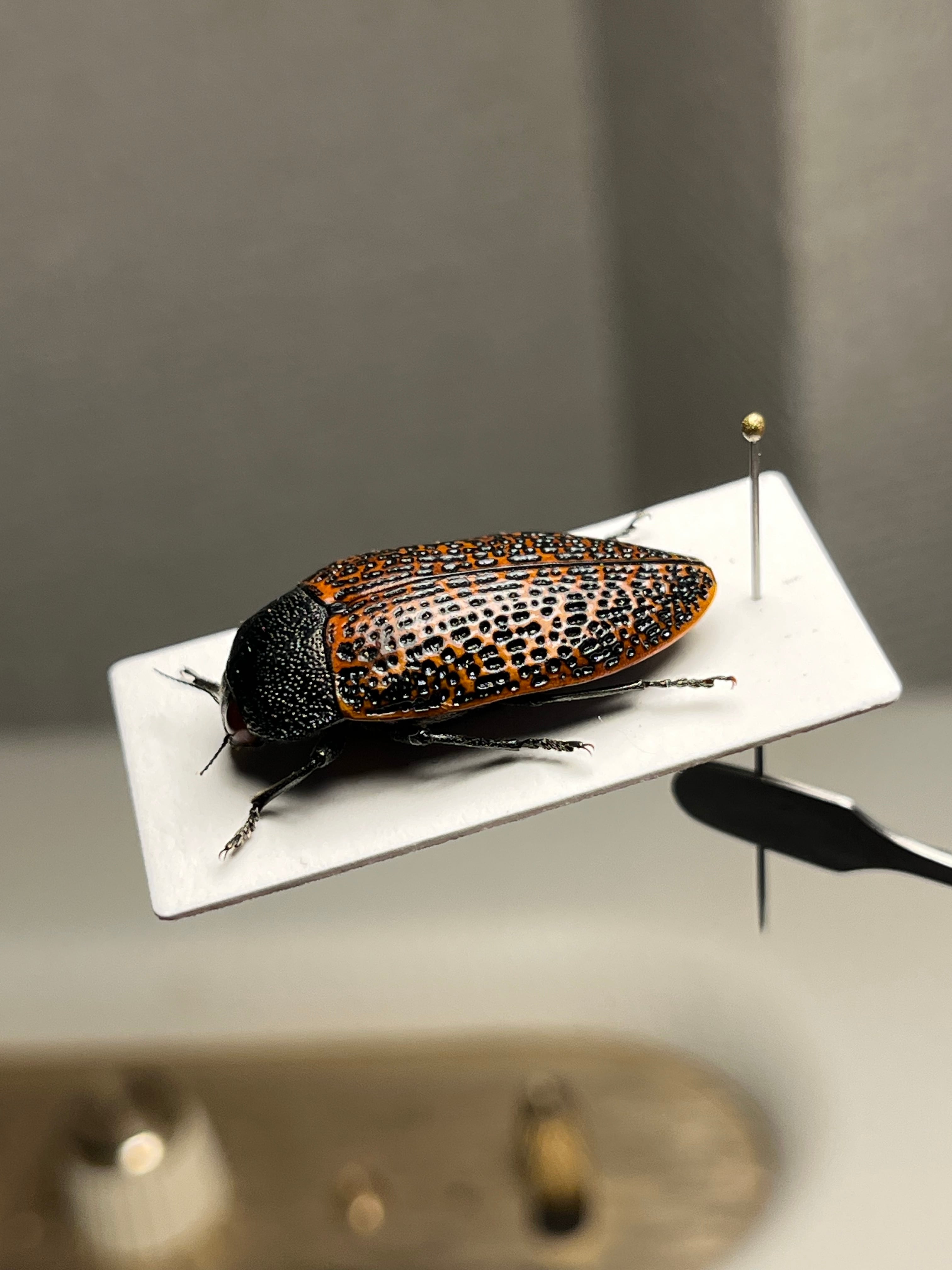 朱色の翅に、深く刻まれた点刻が青黒く光る、大変美しい種です。