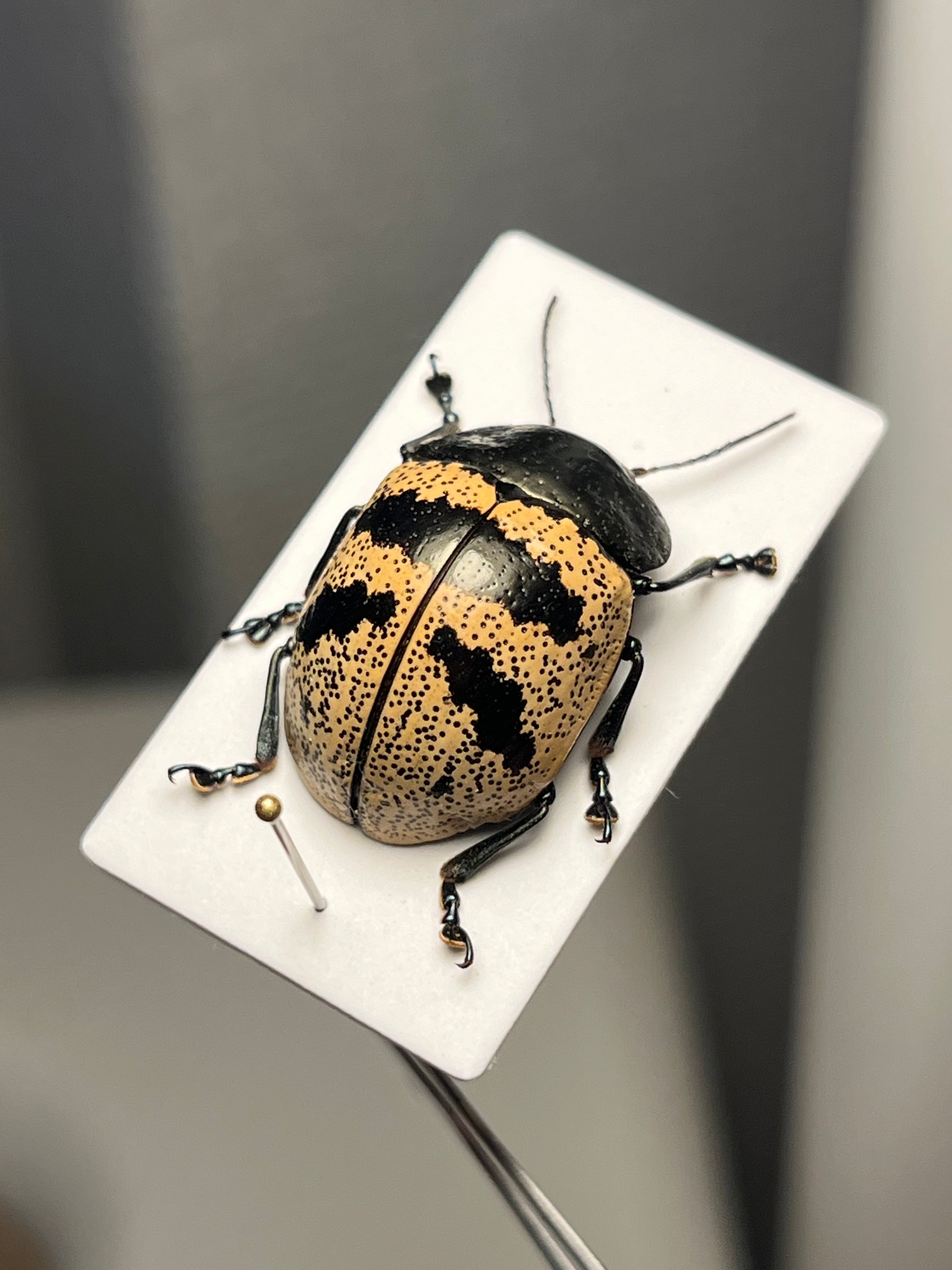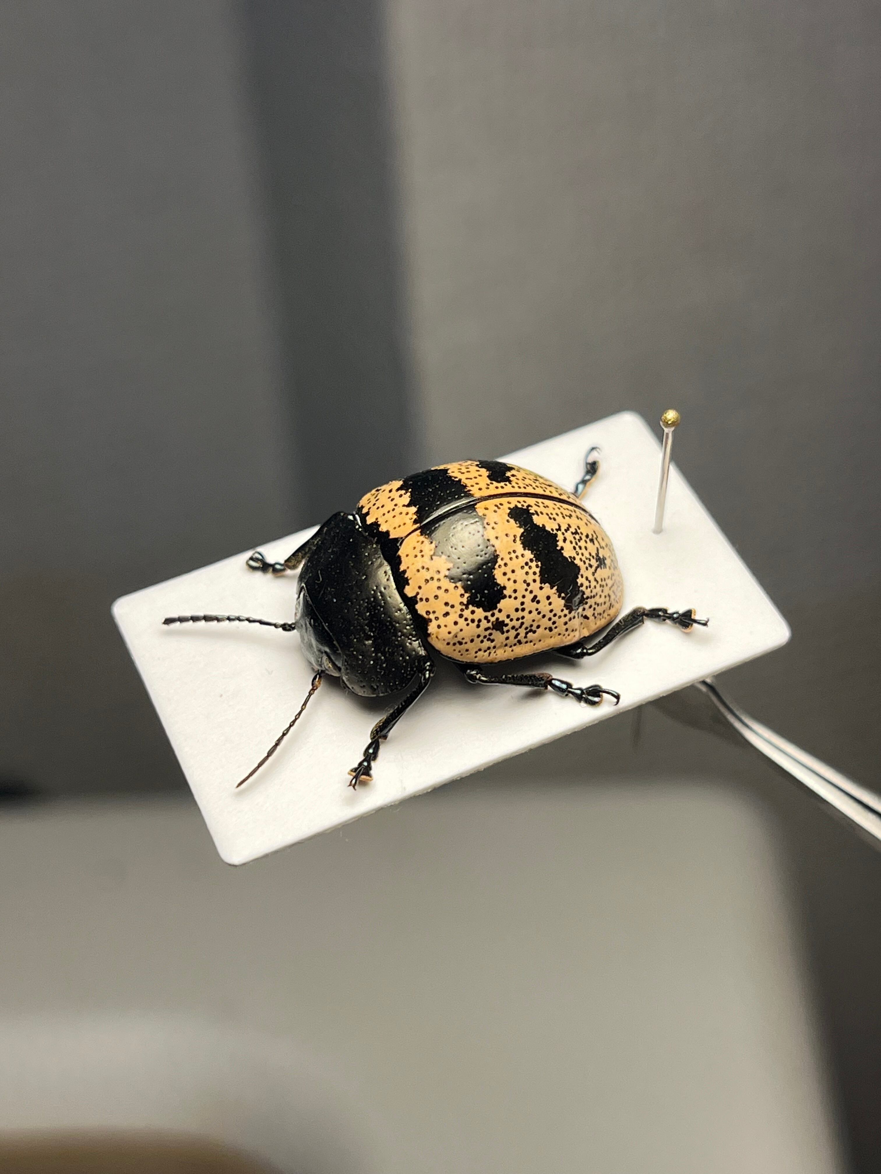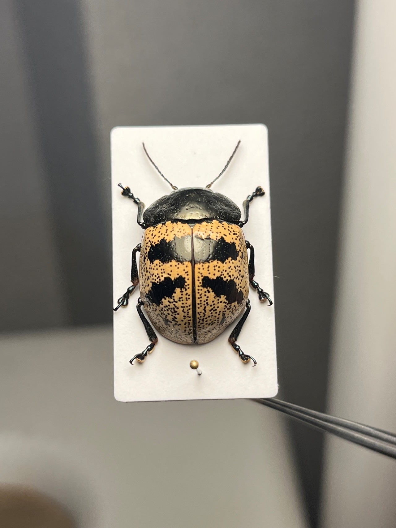 ズングリハムシはコロンとした丸い体型にバリエーション豊かな模様が魅力的な南米のハムシ、「とんでもない甲虫」でも見開き2ページに渡って紹介されているグループです。この仲間は大抵お腹に突起があるのも特徴の一つです。