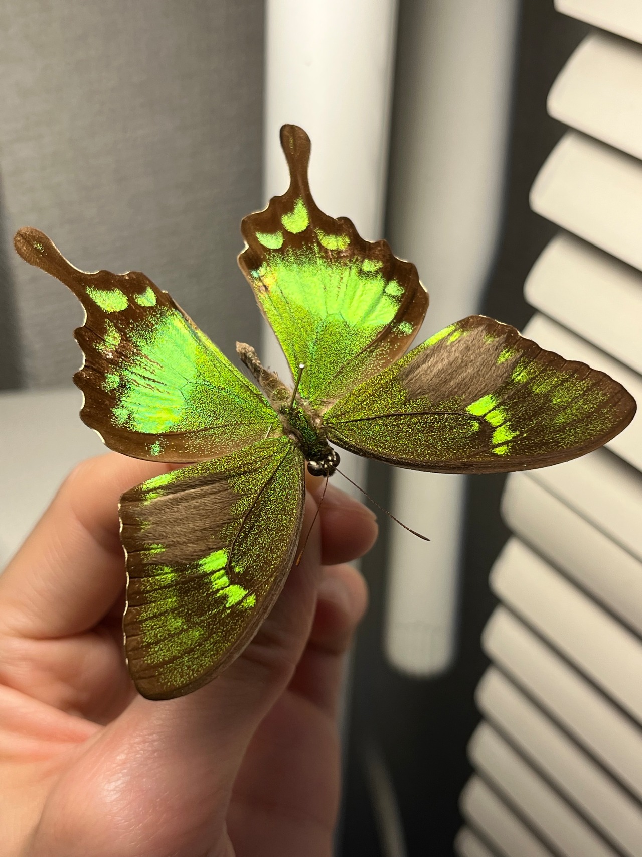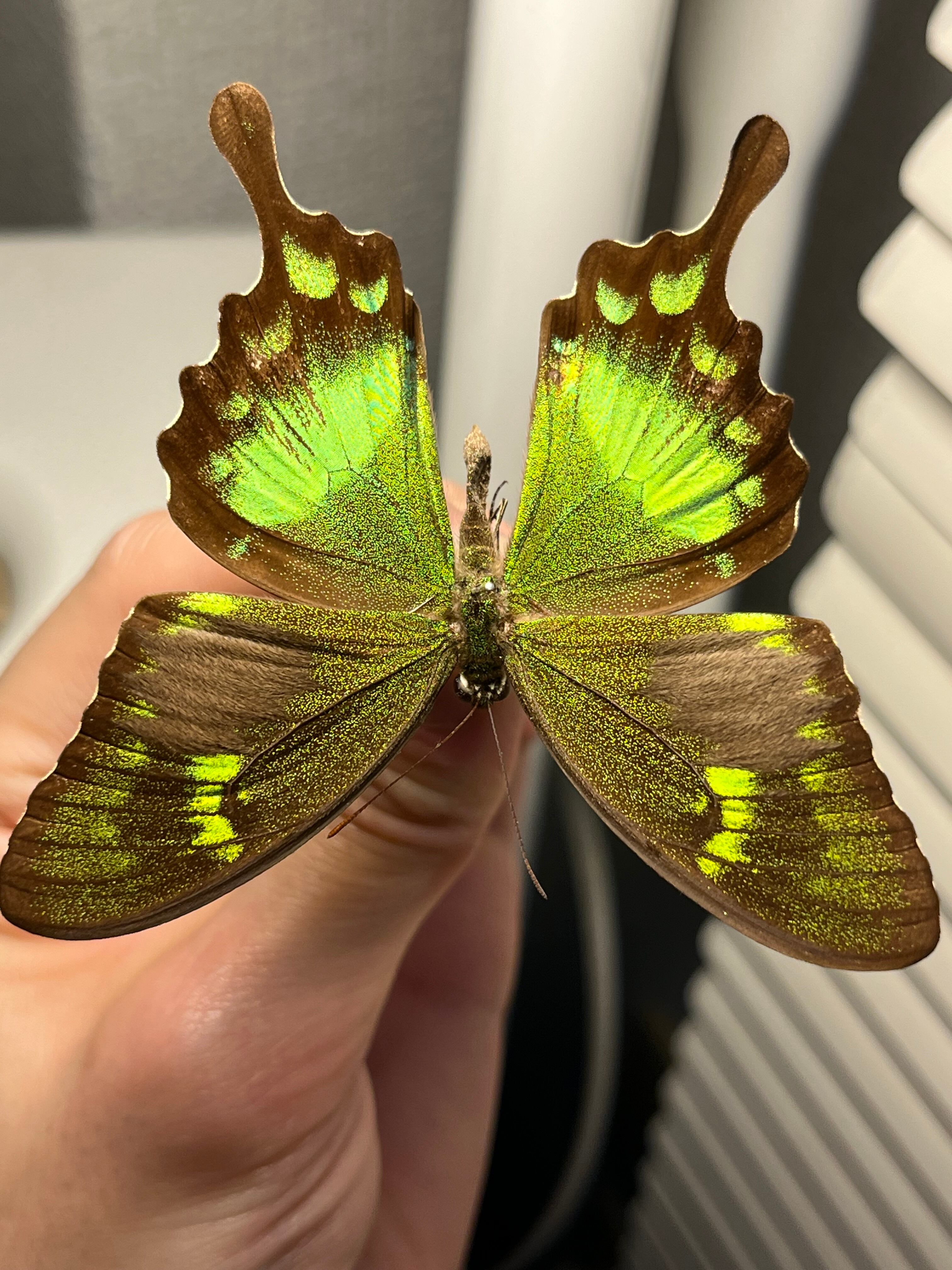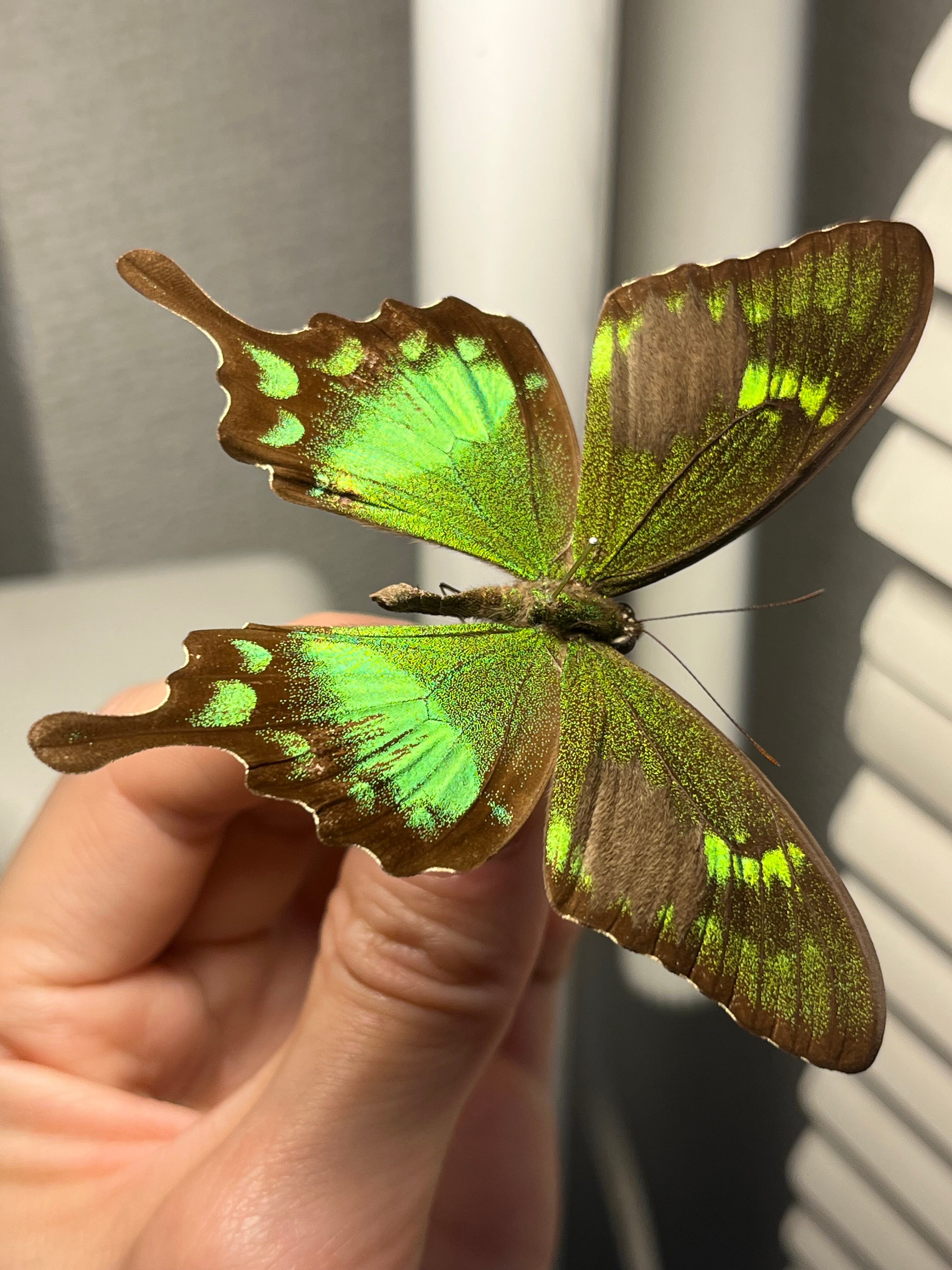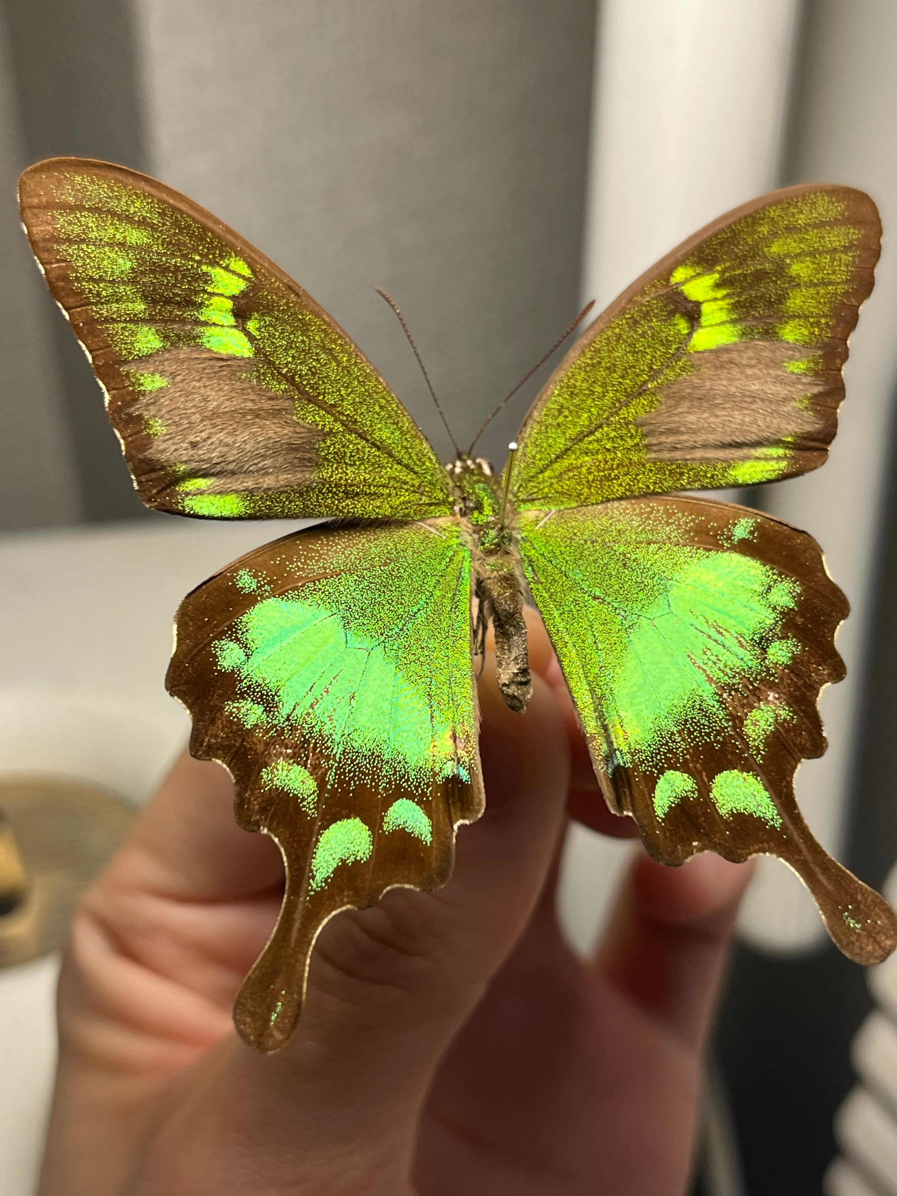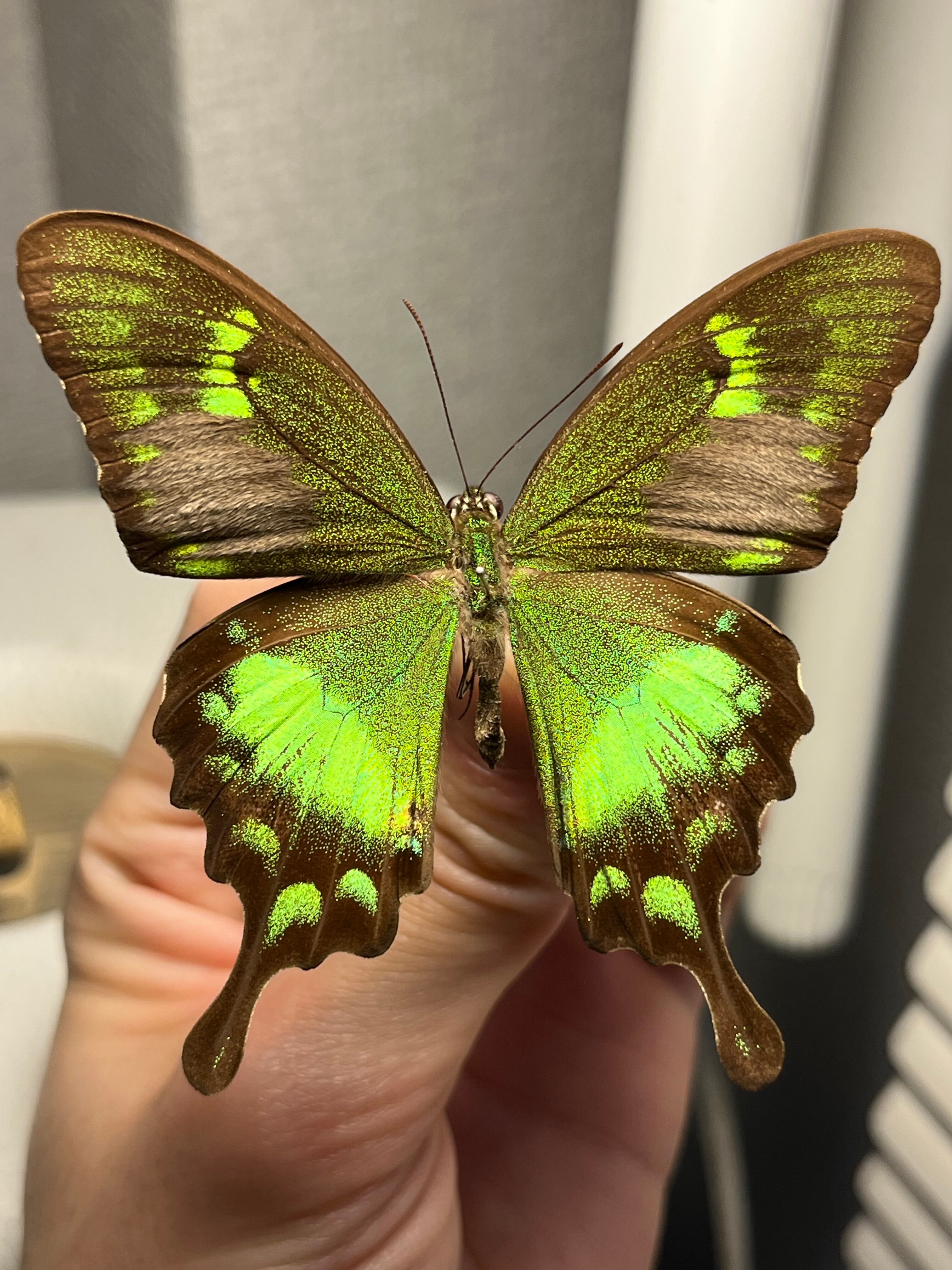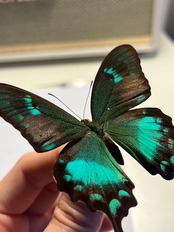 羽の純度の高いグリーンが光の角度によって黄色や青緑へと変化する蝶です。
