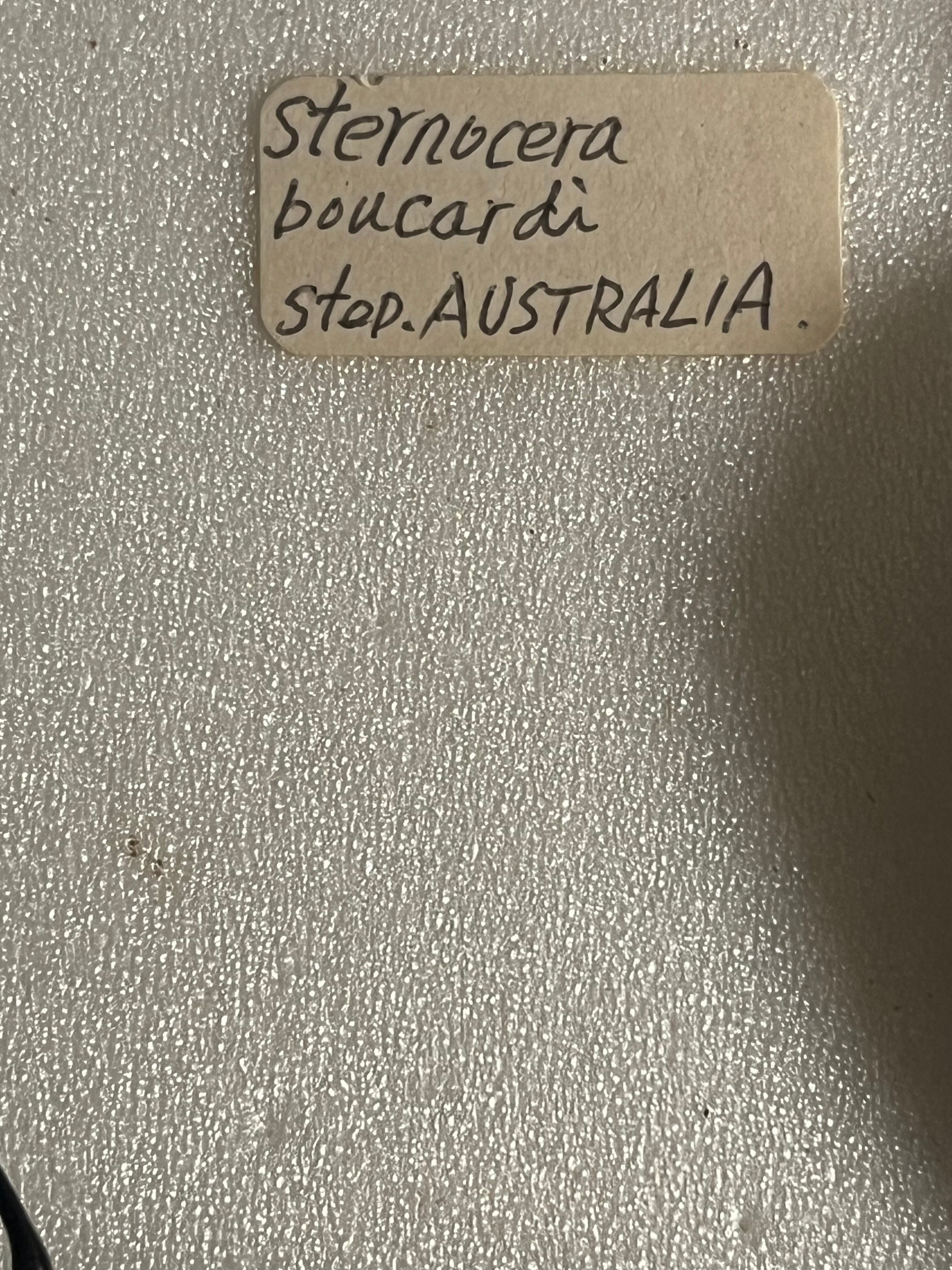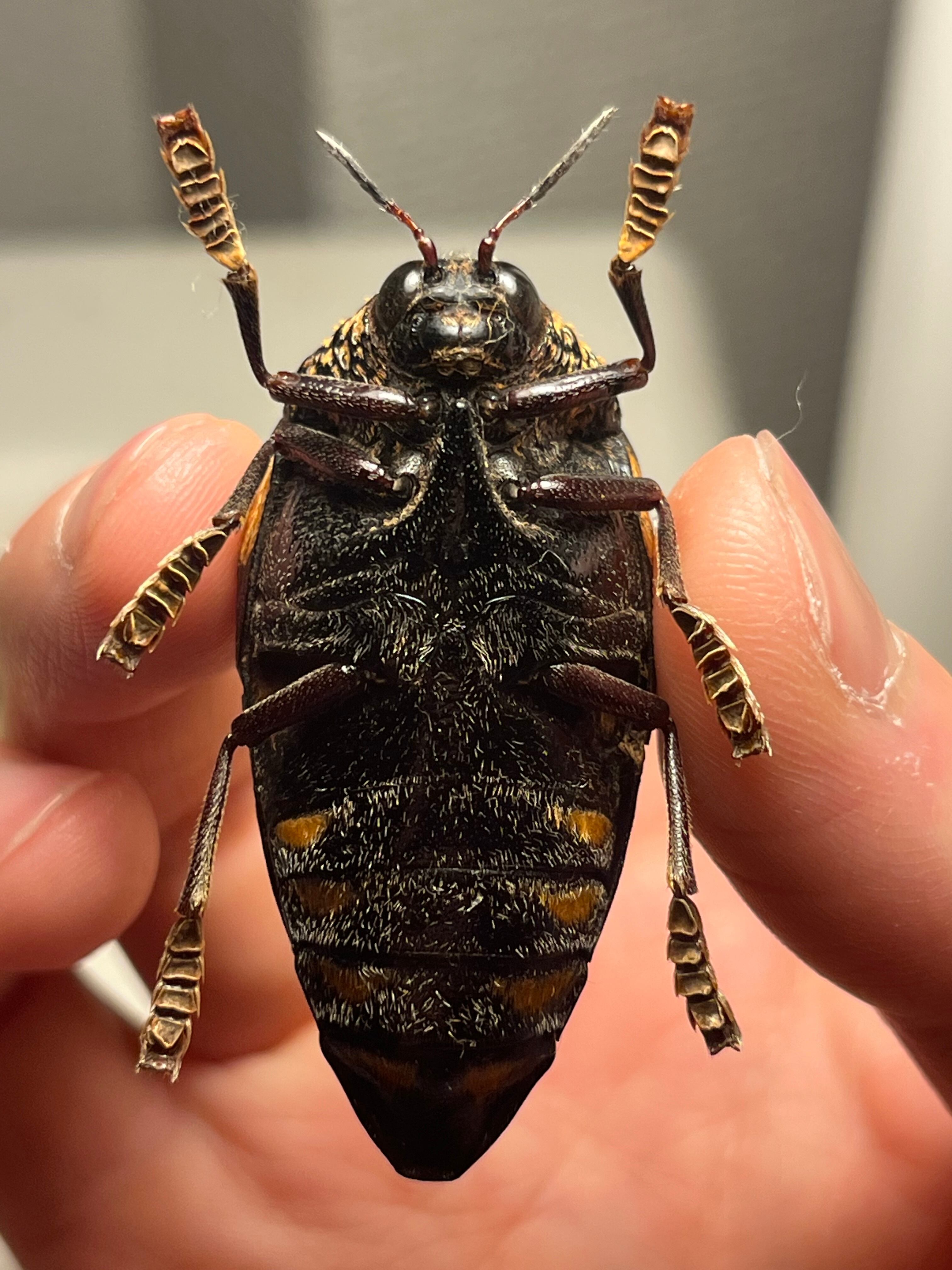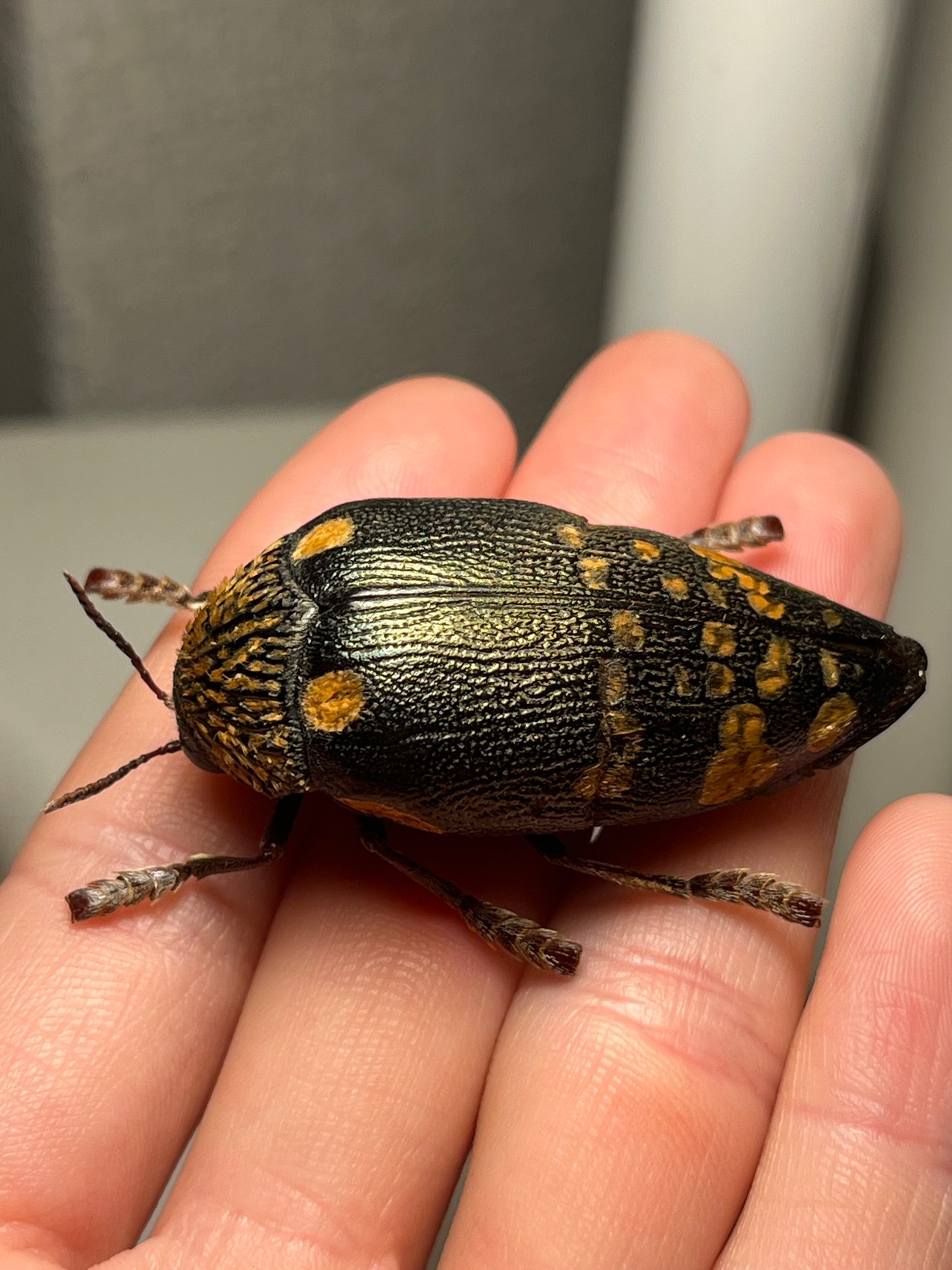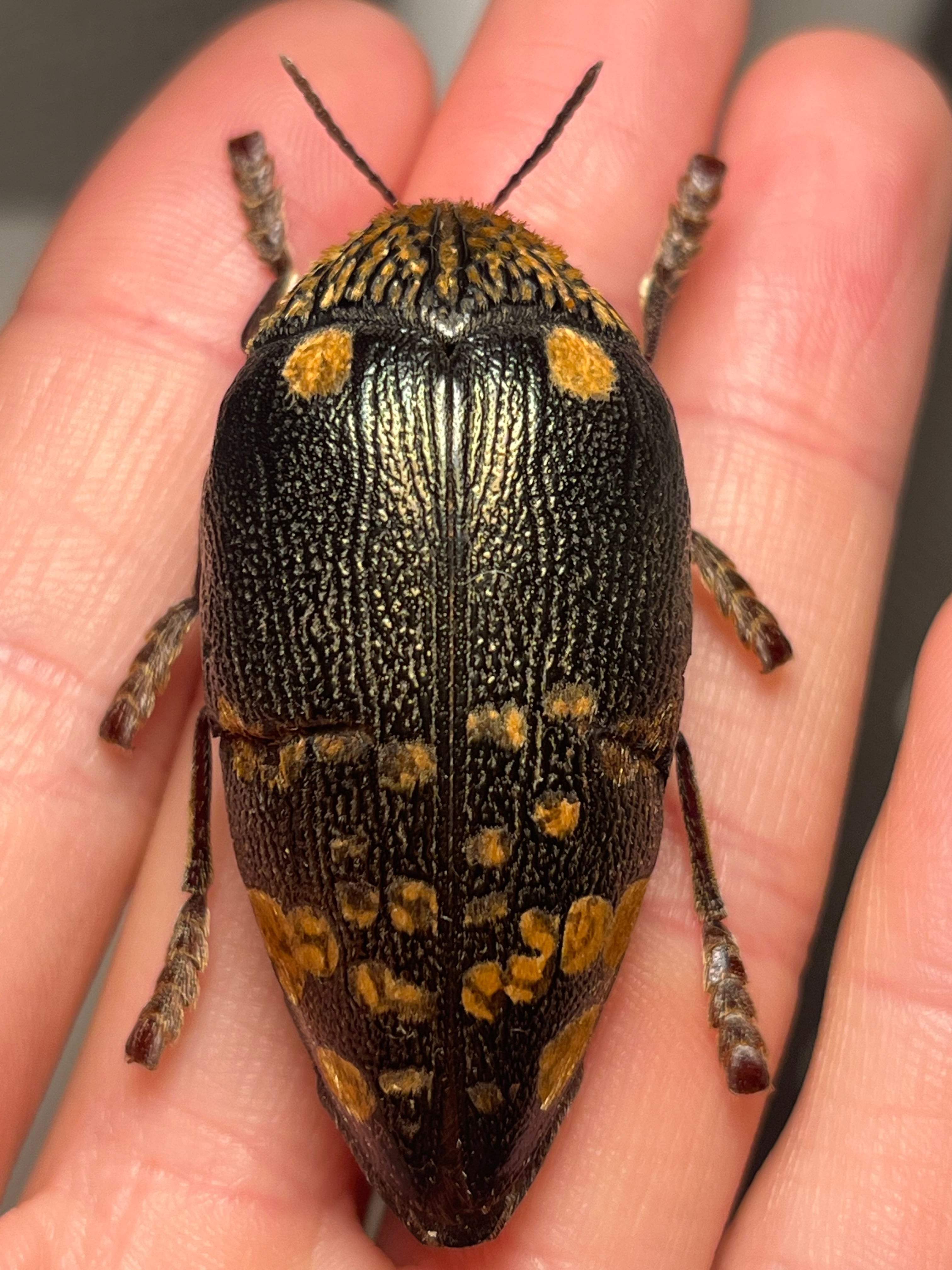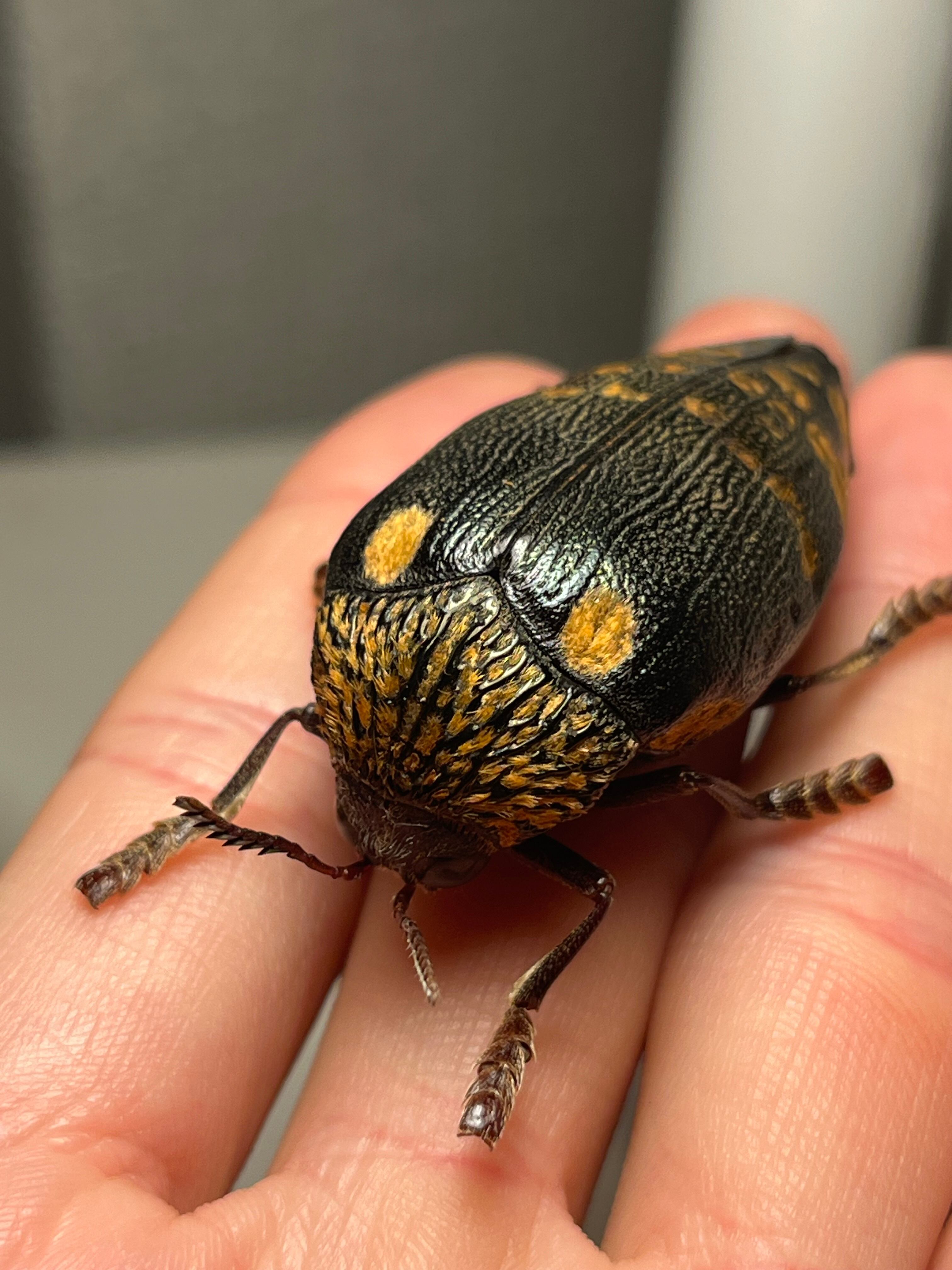 頭がオーストラリアのアラメタマムシのように入り組んでいる模様かつ補色関係の青と橙の色合いが抜群に美しいです。