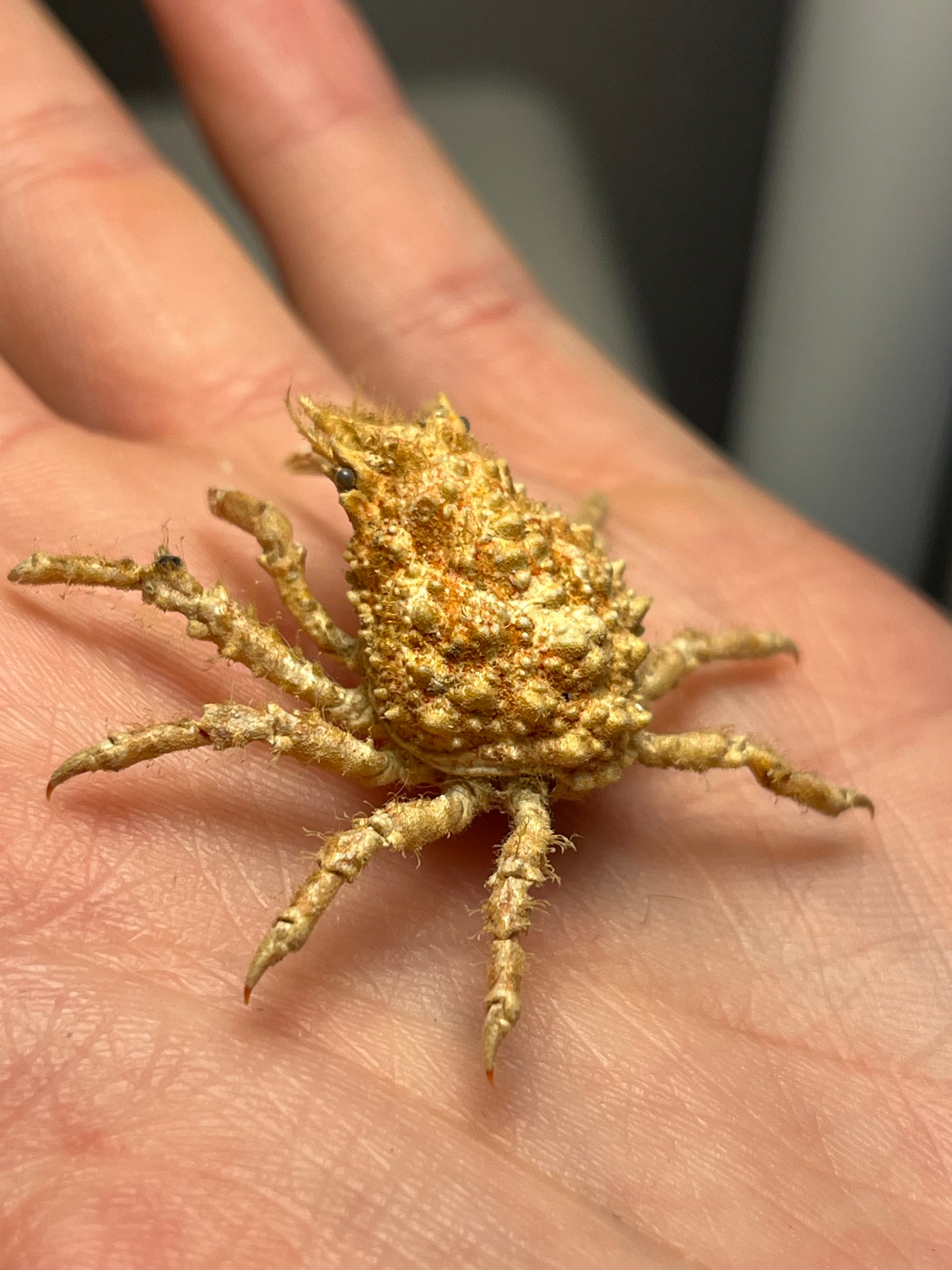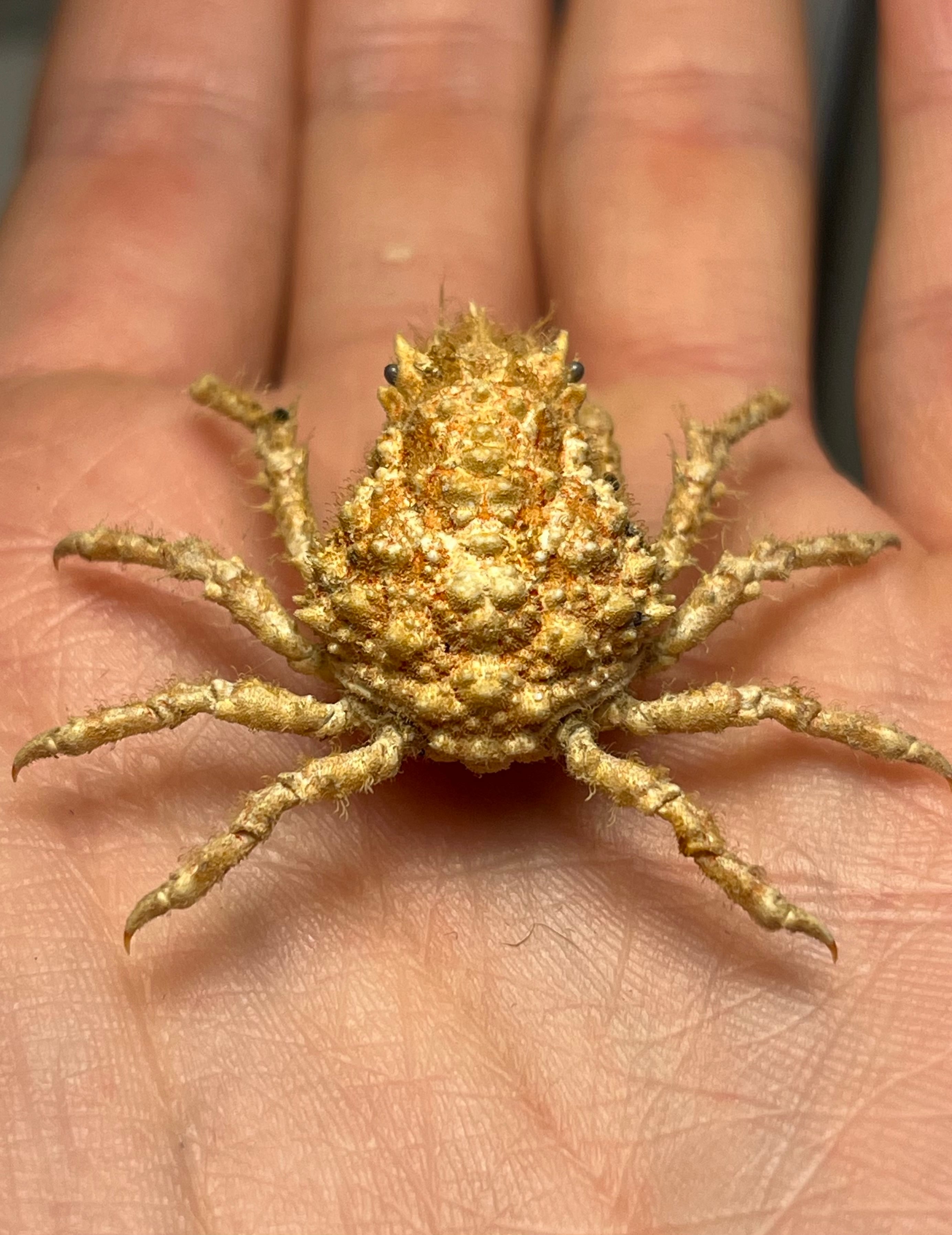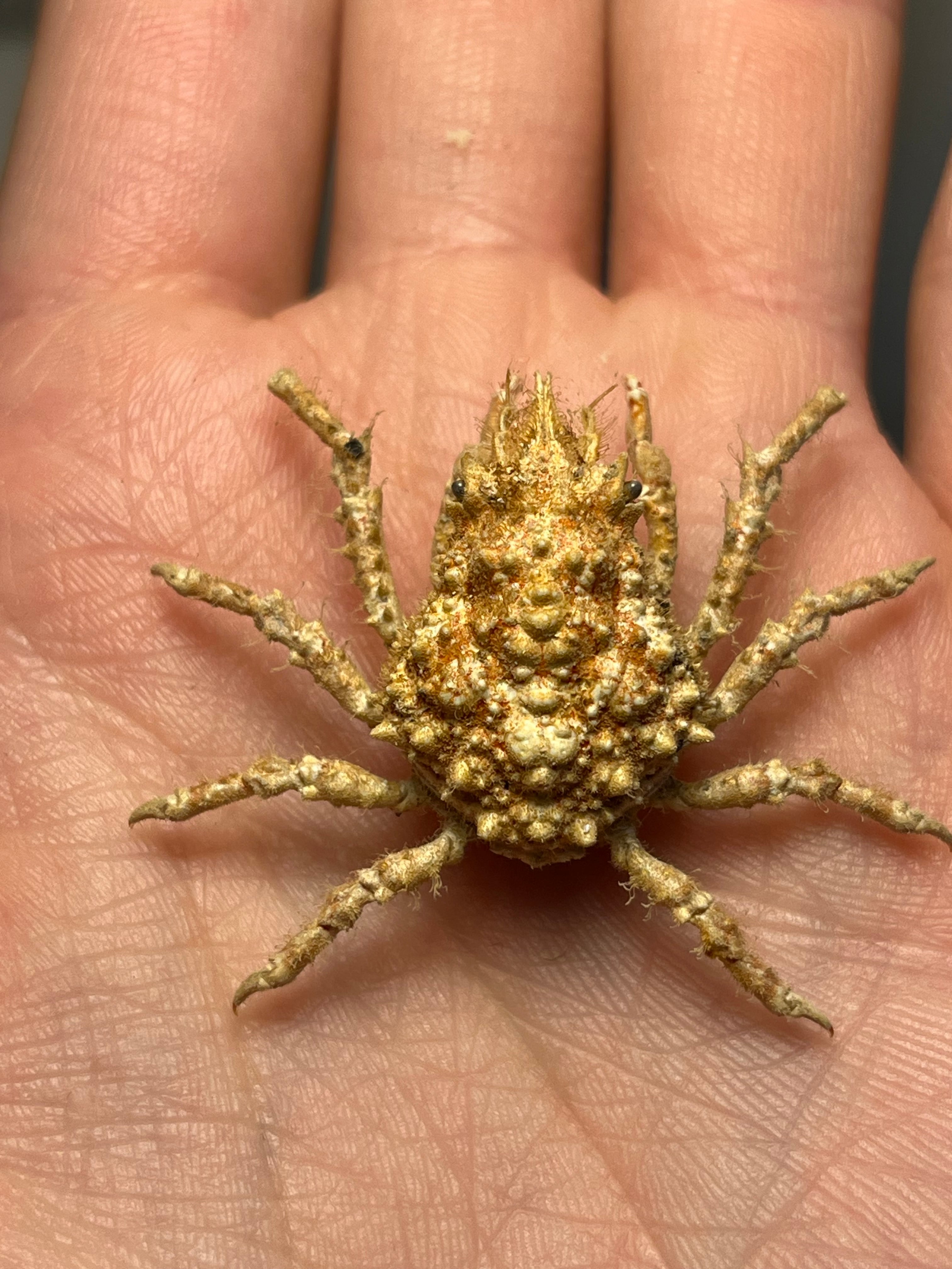 名前の由来と見た目: 甲羅は洋なし型で、頭部に海藻をつけて海藻に擬態する。甲長は約3cm、甲幅約2.5cm