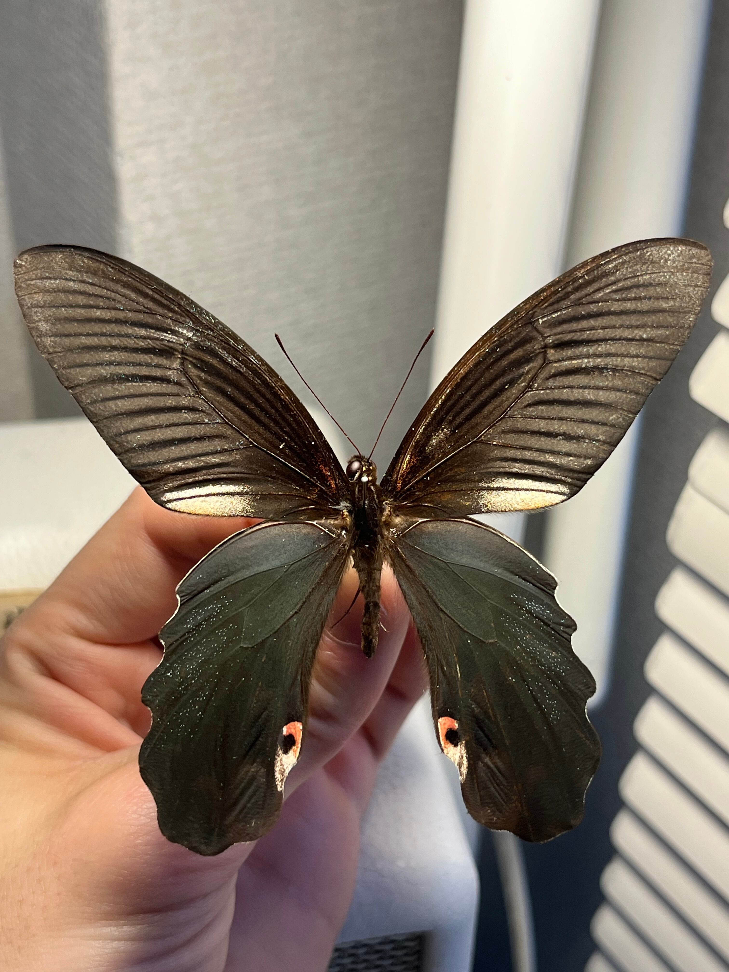 形態: オスは全体的に黒く、後翅の裏面に特徴的な赤色斑を持つ(Redbreast)。