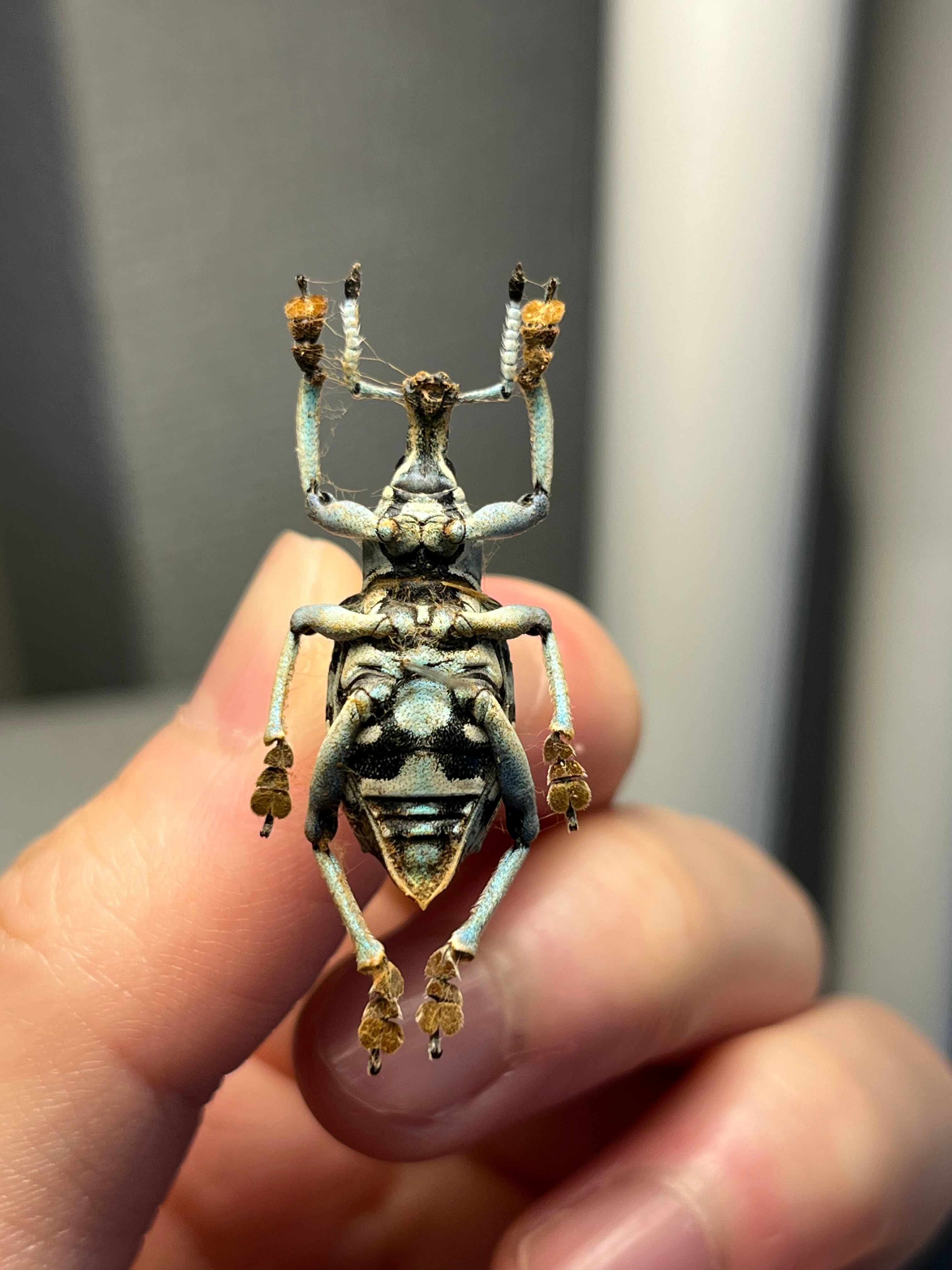 亜種 Eupholus-nickerli anthracina では、基本色は灰色がかった灰色で、横方向の黒と黄色の帯があります。これらの構造色は非常に小さく平らな鱗に由来し、おそらく捕食者に毒性を警告する役割を果たしています。吻の先端と触角の先端は黒色です。