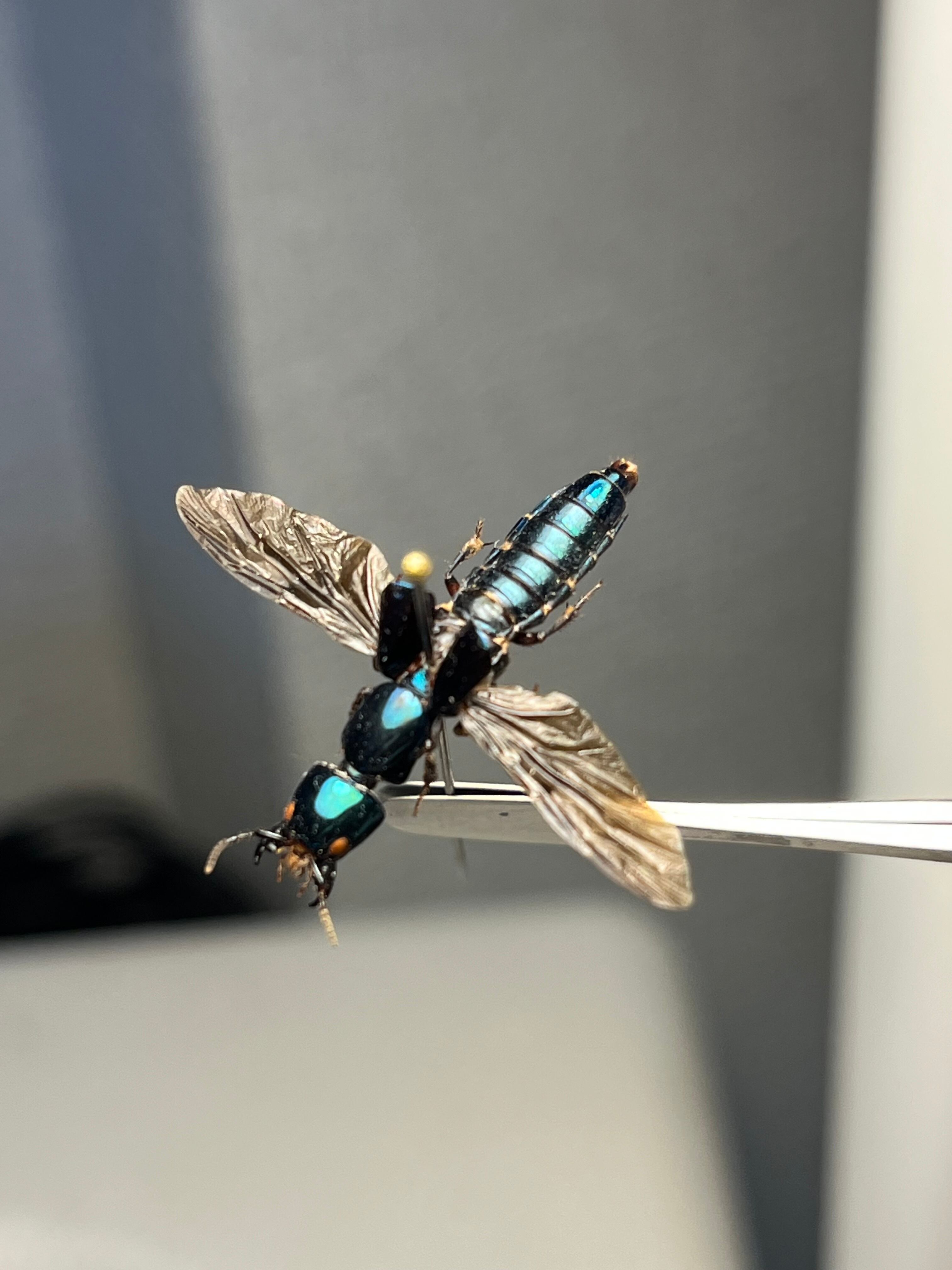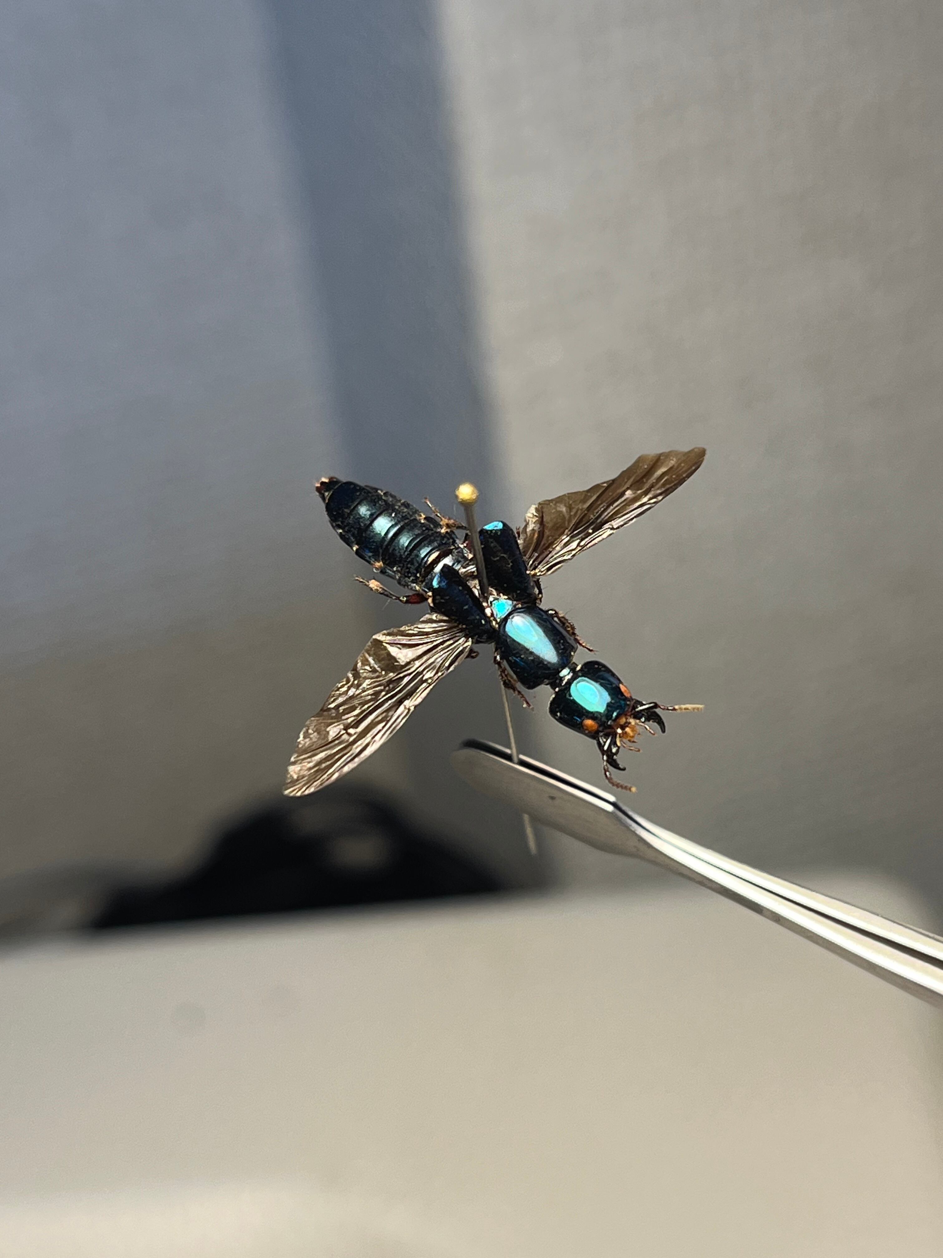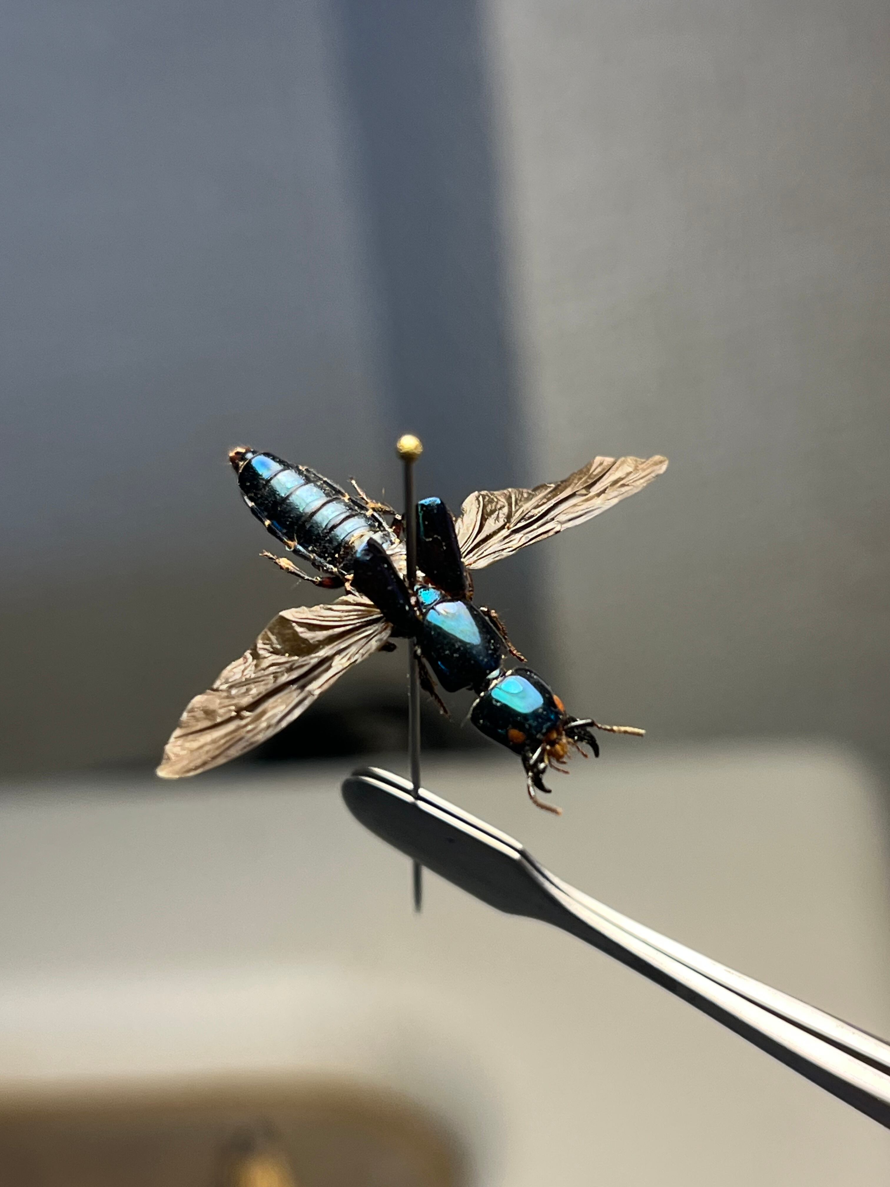【開隠翅虫】メタリックブルーのペルーのハネカクシの一種 標本 隠翅虫、羽隠虫 Staphylinidae sp. ヘビトンボ ムカデ あり アリ ハチ 蜂