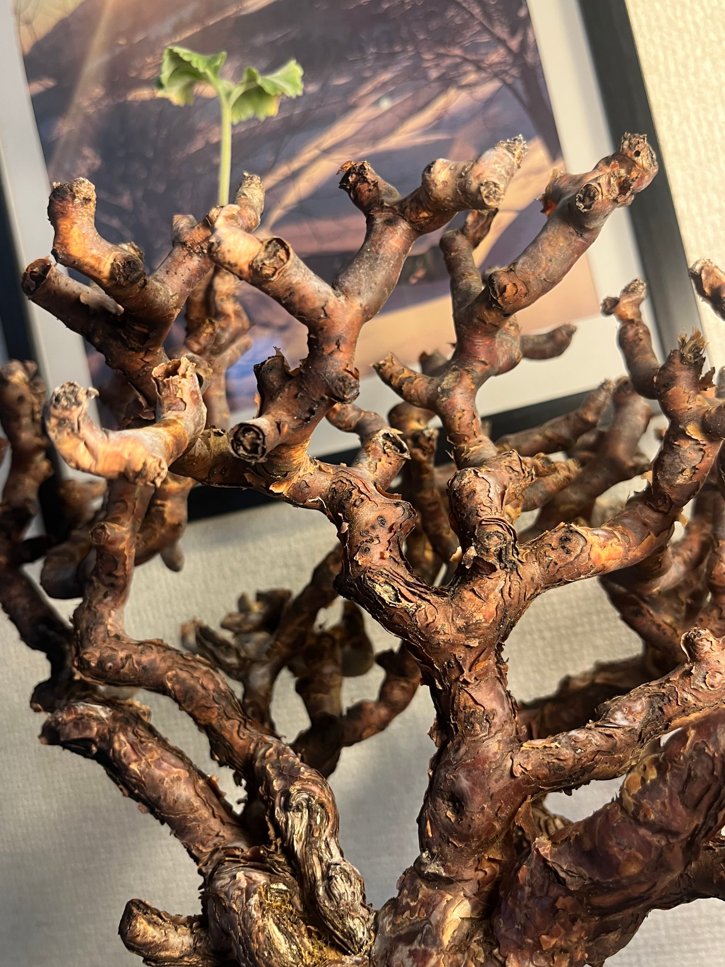 濃いブラウンの幹から銀色がかった緑の葉を出す不思議な魅力の植物。