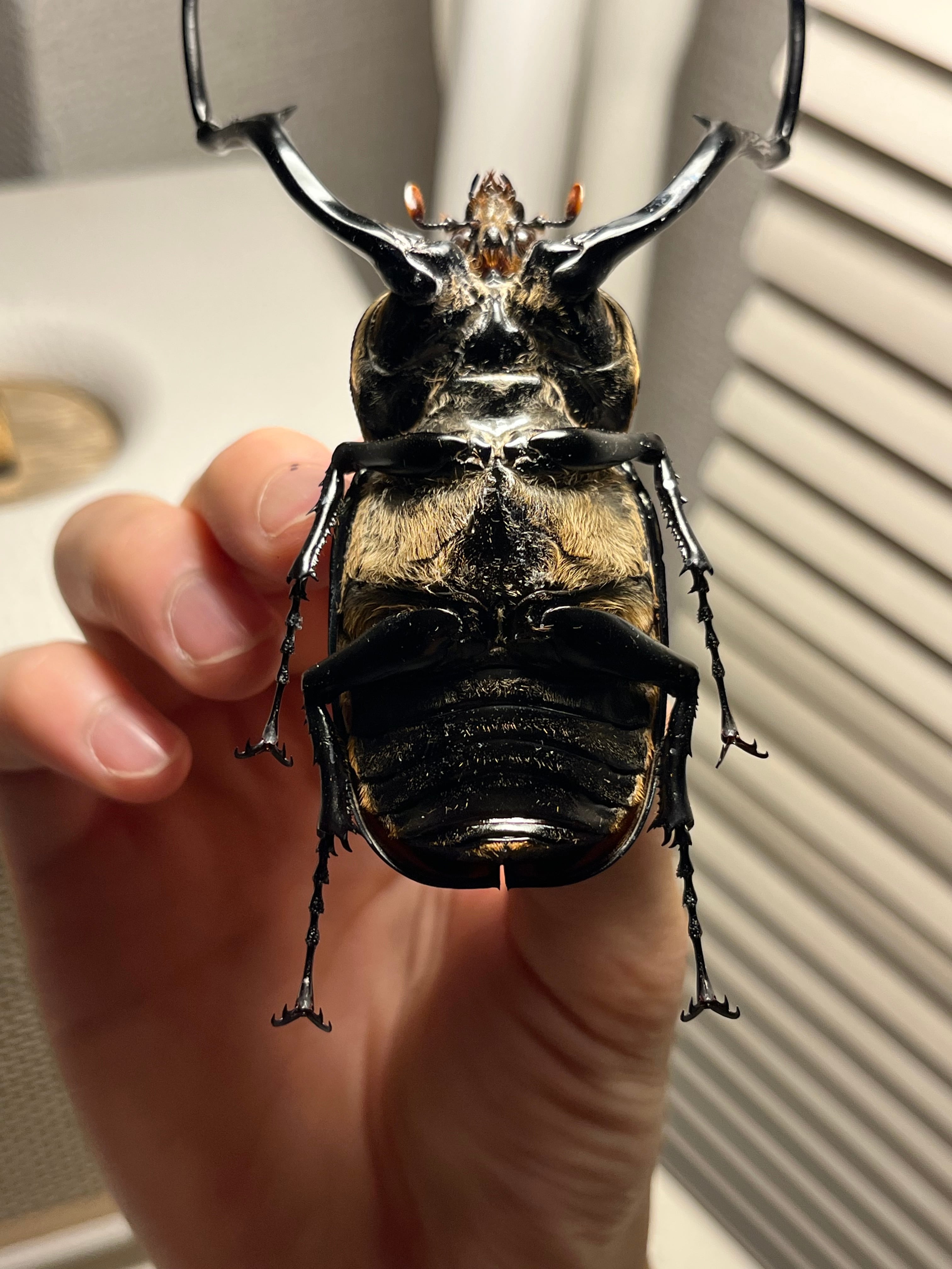 フィリピン ミンダナオ島 ボンガボン リサップ産の画像個体♂を配送します。私が計測したところ70mmでした。ビッグサイズです。2025年10月に採取されております。マックスは80mm以上になるみたいですが、73mmくらいが頭打ちでそれ以上のものはほとんど出回らないそうです。