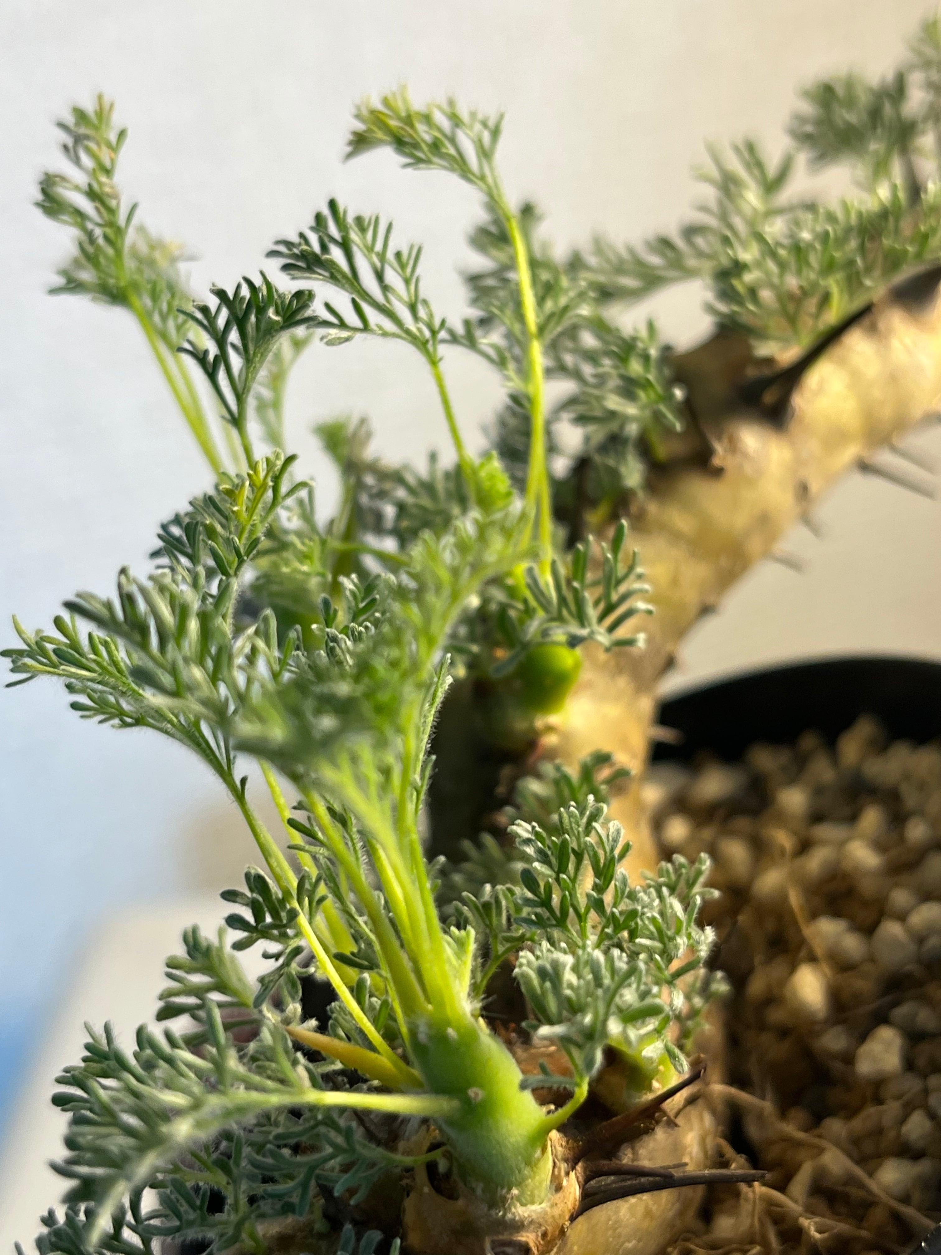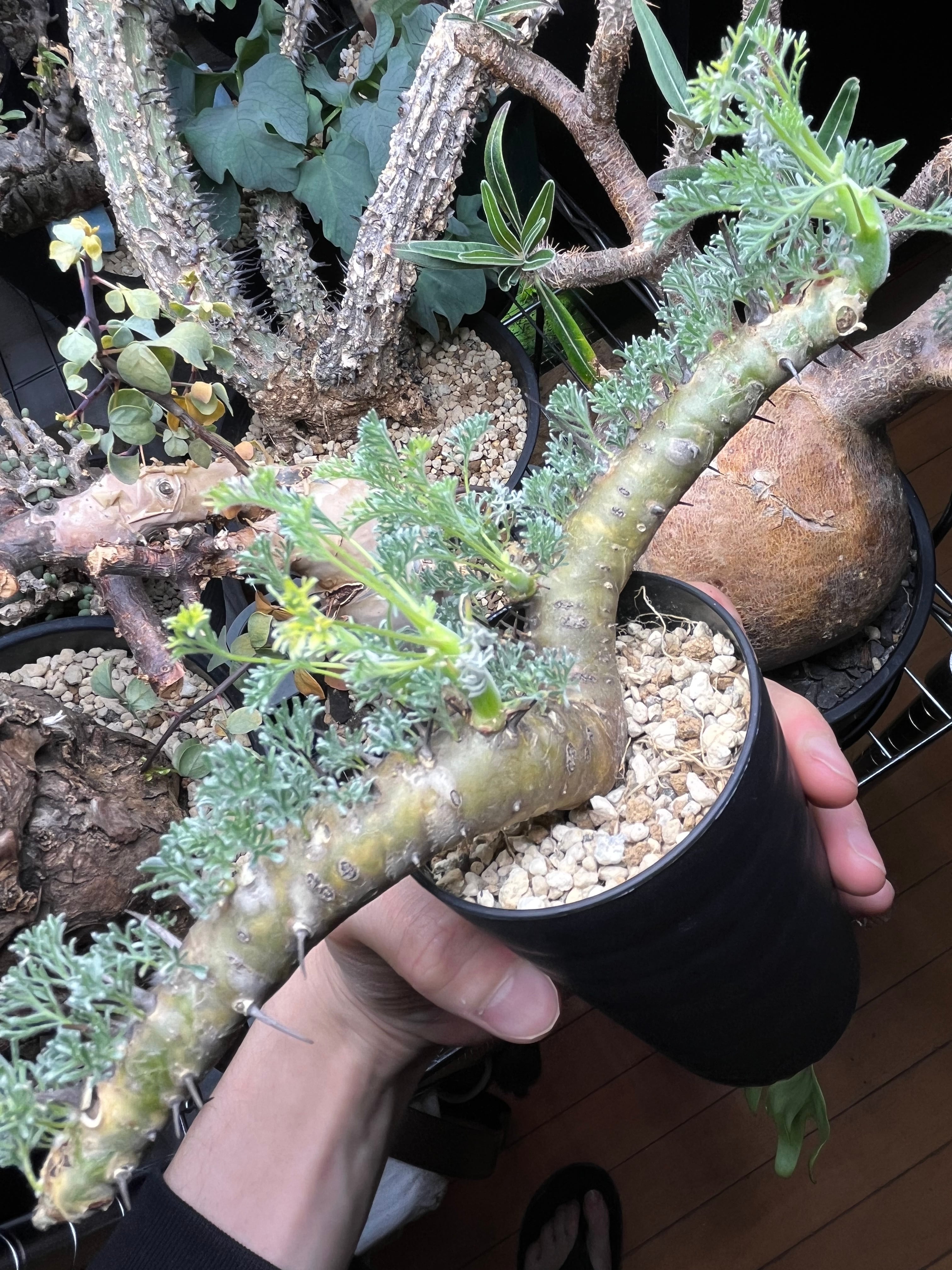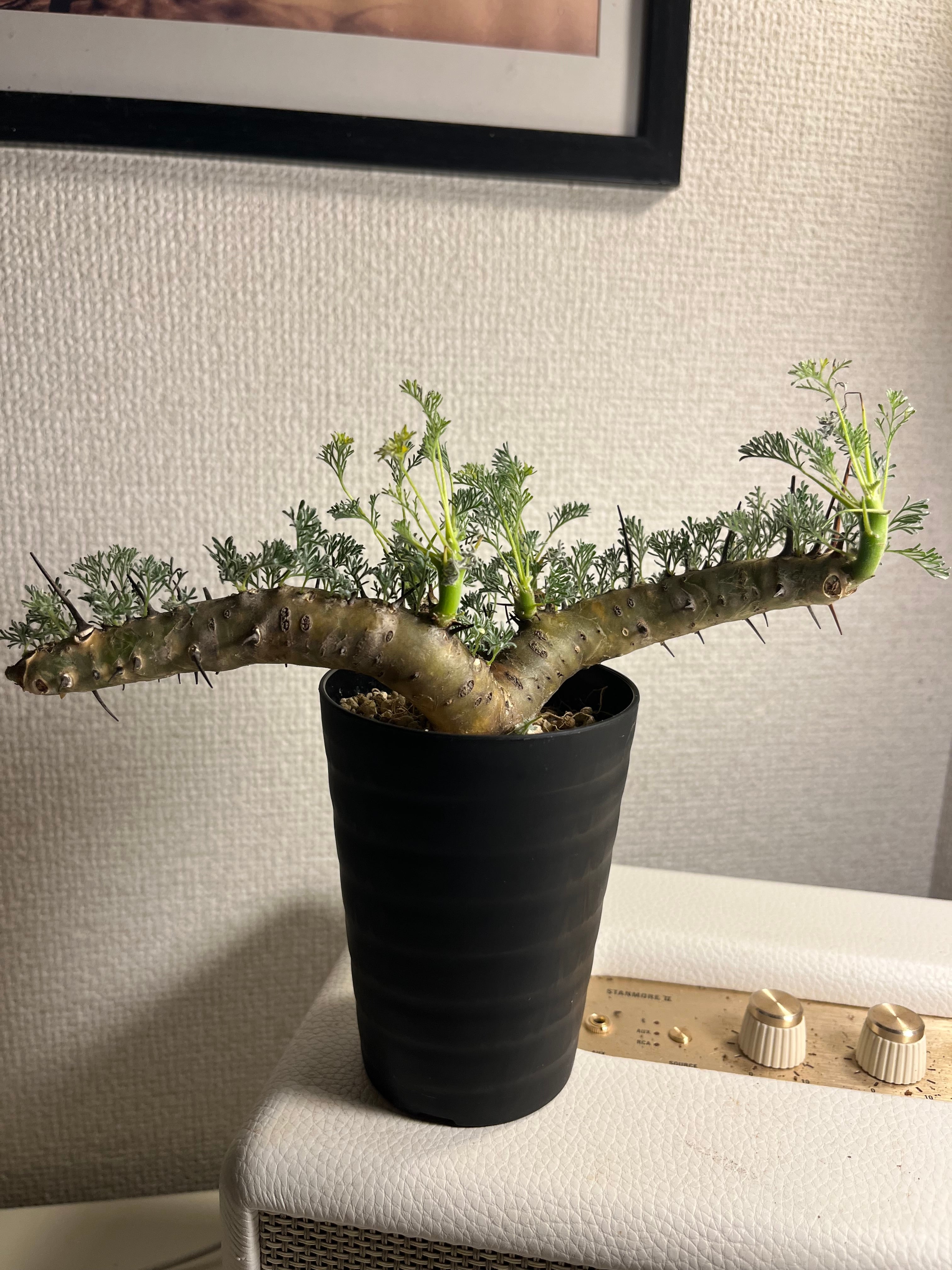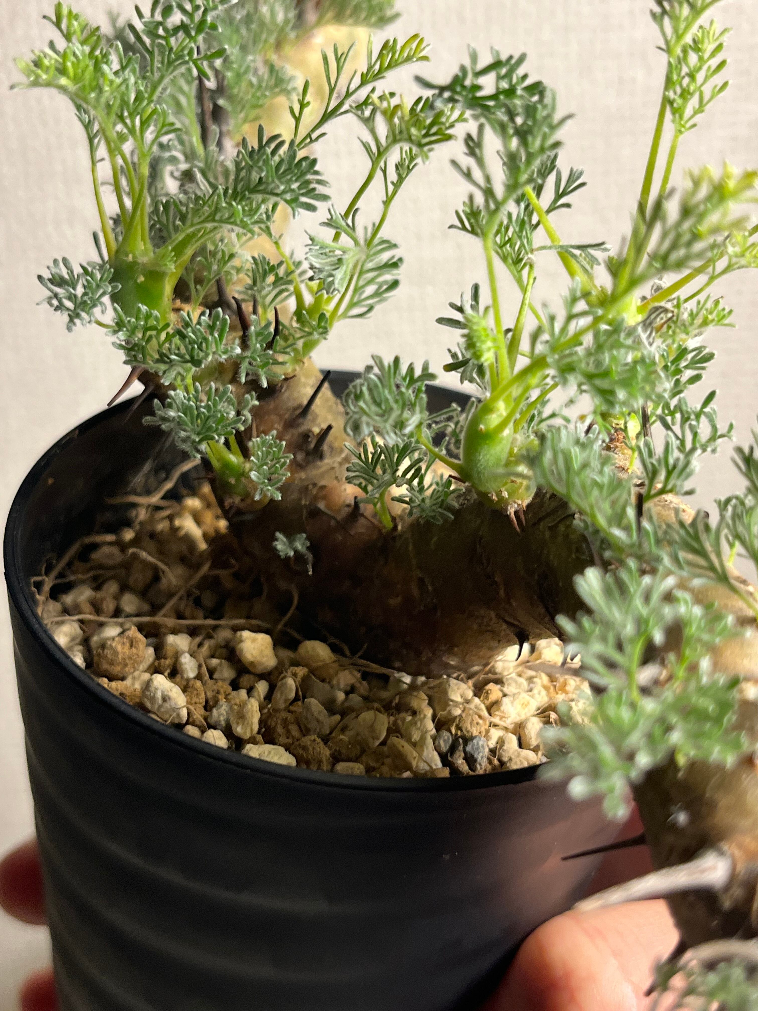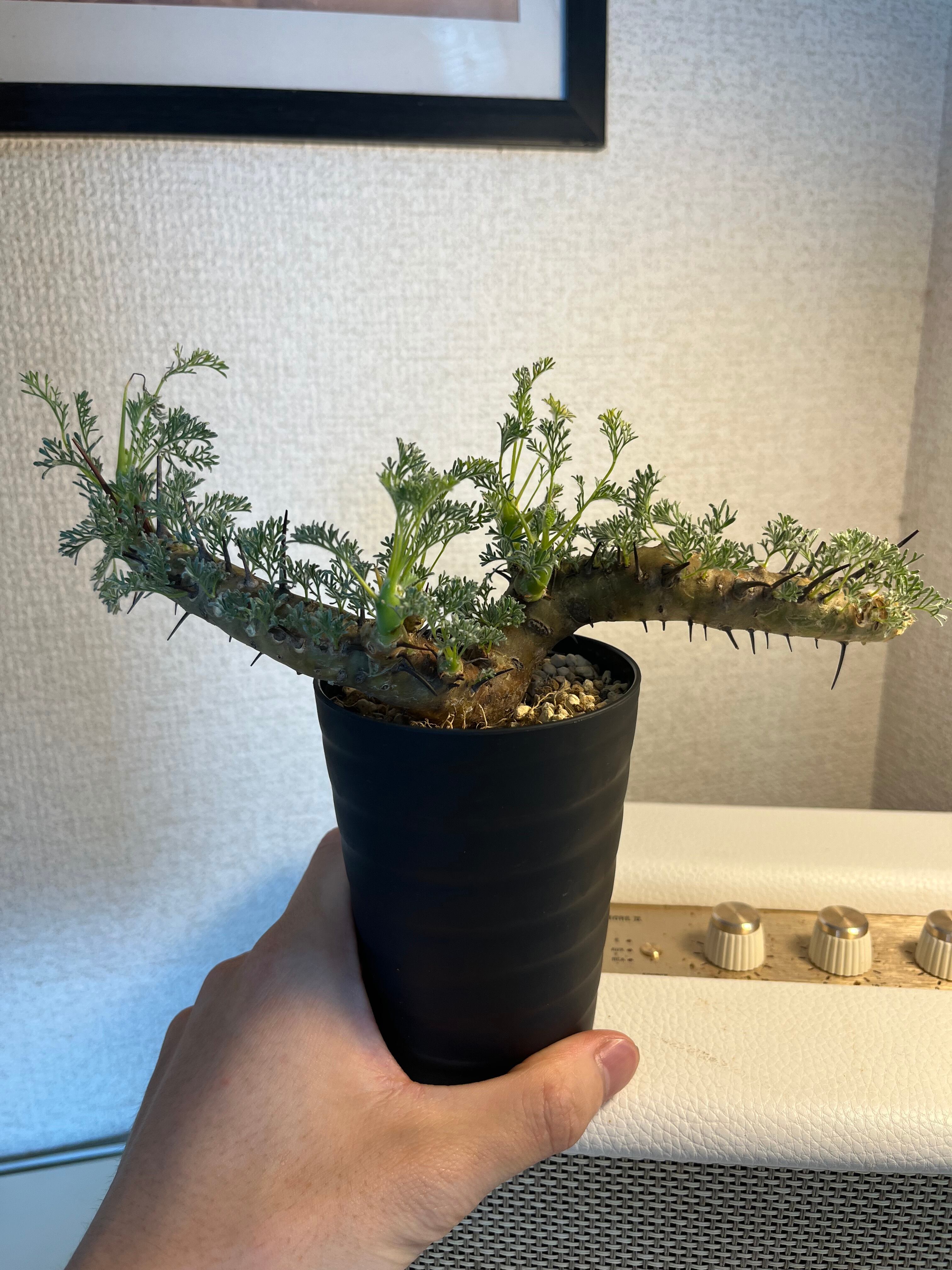 「モンソニア・ヘレー」は、フウロソウ科モンソニア(旧サルコカウロン)属の塊根植物です。和名は「竜骨城(りゅうこつじょう)」といい、地面を這う蛇のような幹は鋭いトゲに覆われ、その合間に緑のサンゴのような葉が付くという、一度見たら忘れられないユニークな姿をしています。涼しい時期に生長する種で、夏に落葉・休眠し涼しくなる秋から葉が芽吹きます。春には繊細な白い花を咲かせます。年間を通して乾燥を好むため、生育期でも水の与えすぎに注意しましょう。生長は非常に遅く、盆栽風にも楽しめる植物です。