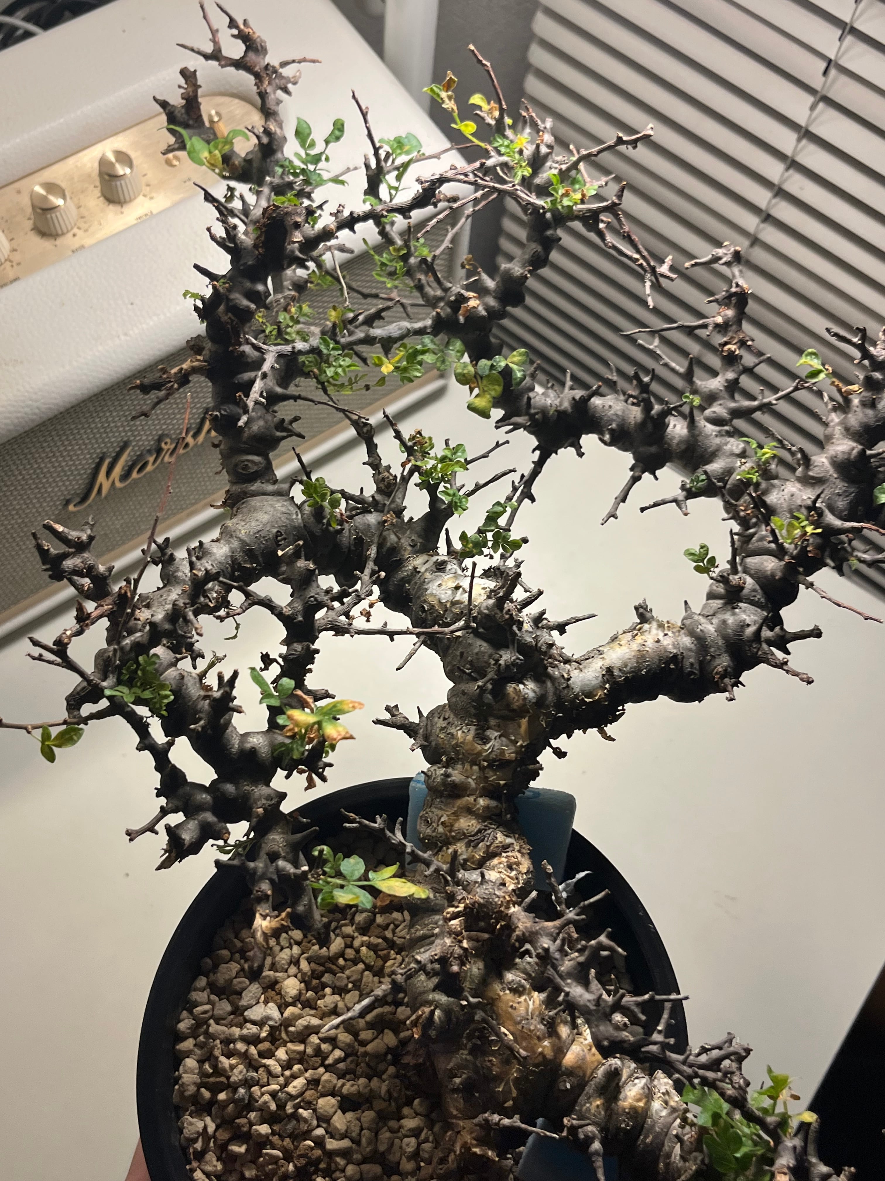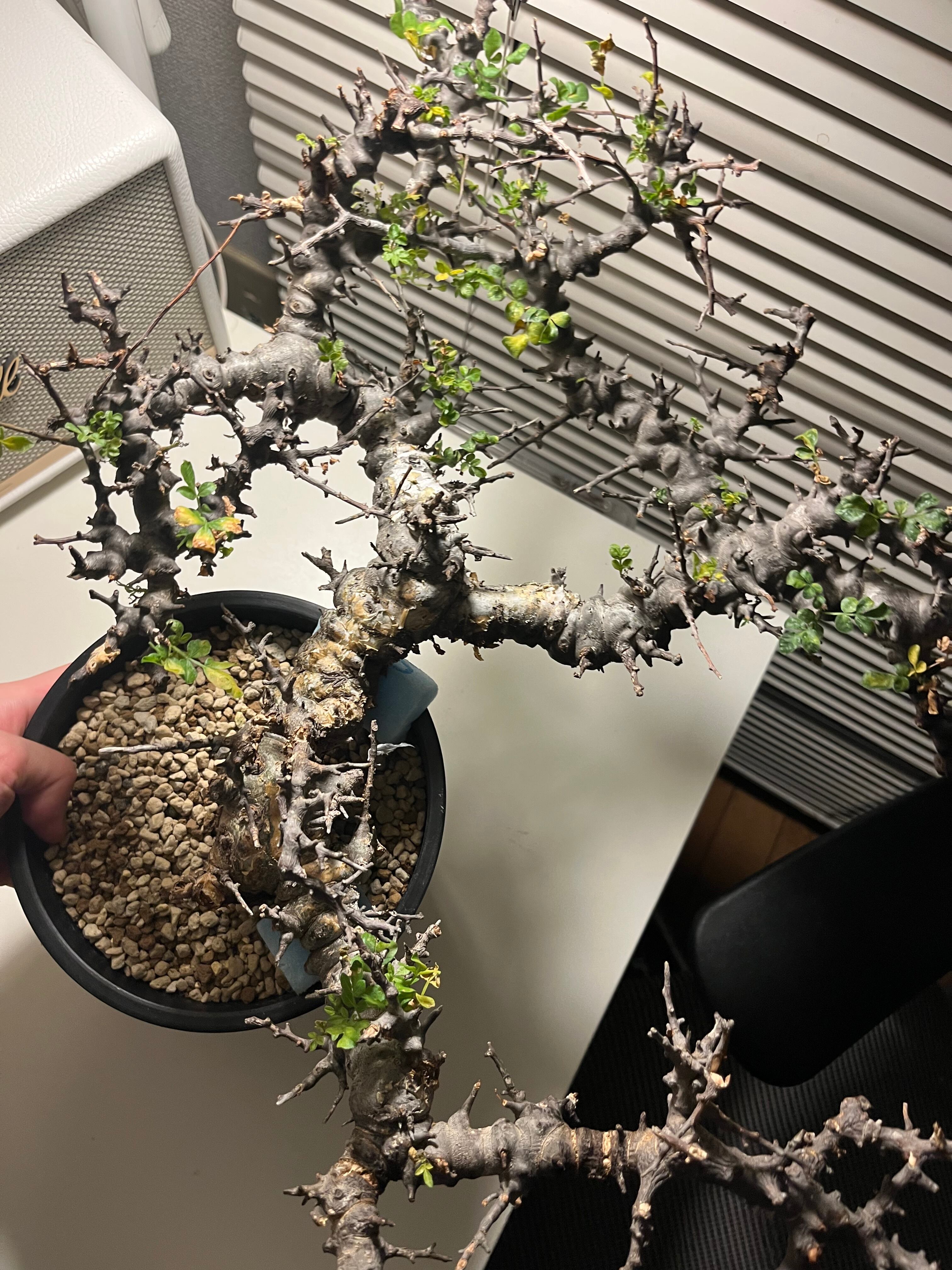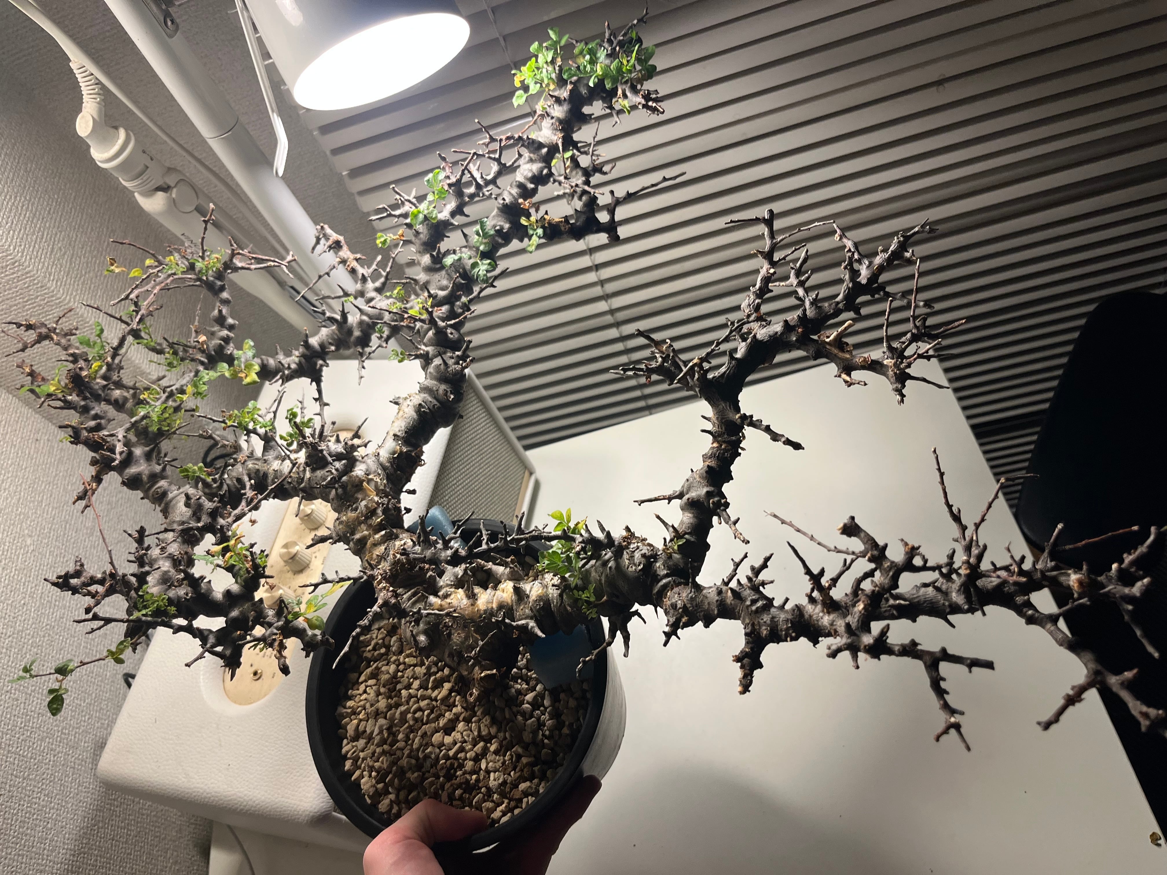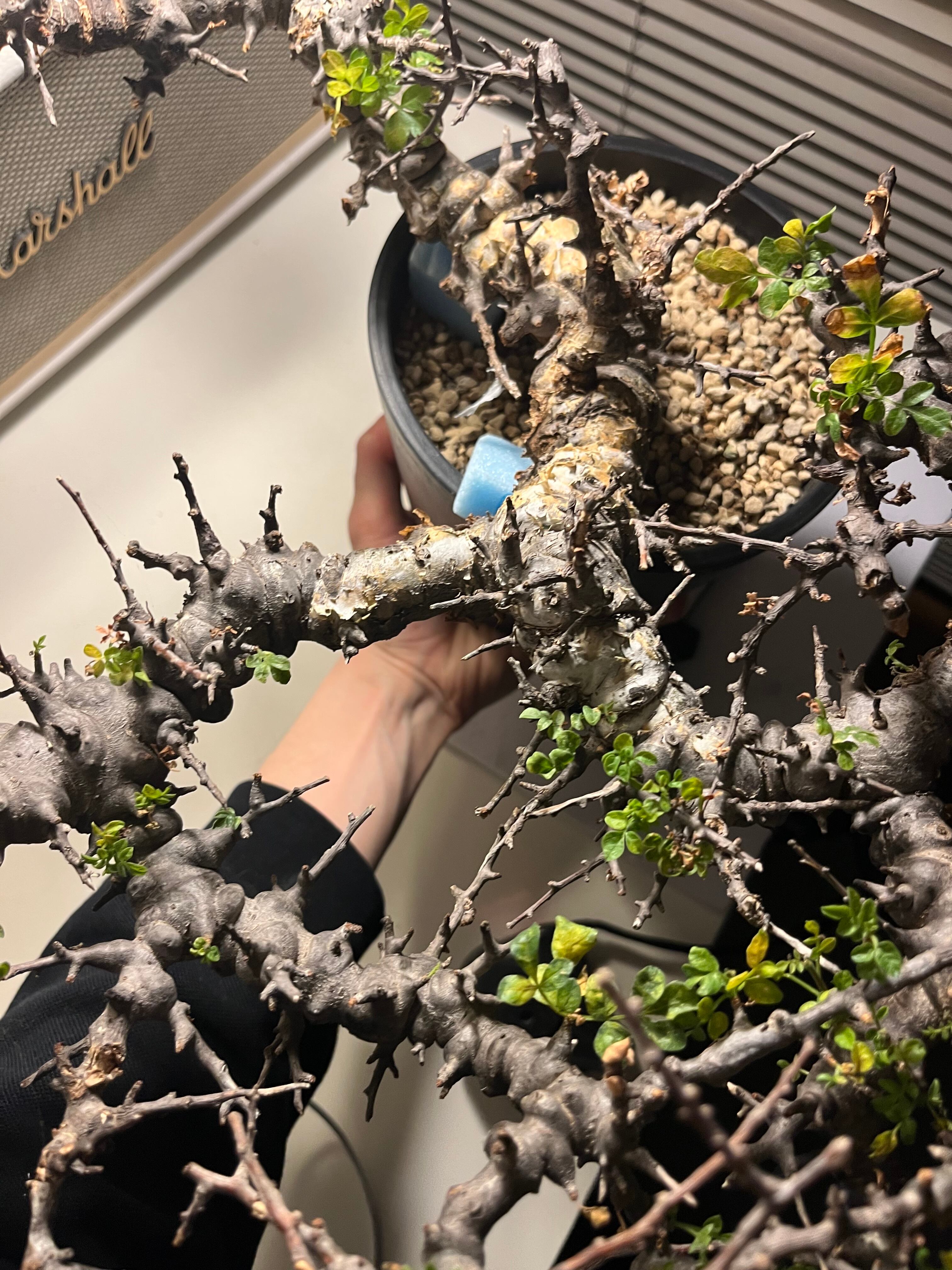ソマリア北部エイル地方に自生する、ゴツゴツした幹と繊細な葉のコントラストが美しい希少な灌木コーデックスです。天然の盆栽のような佇まいで人気が高く、成長期には枝から小さな緑色の葉を多く茂らせます。