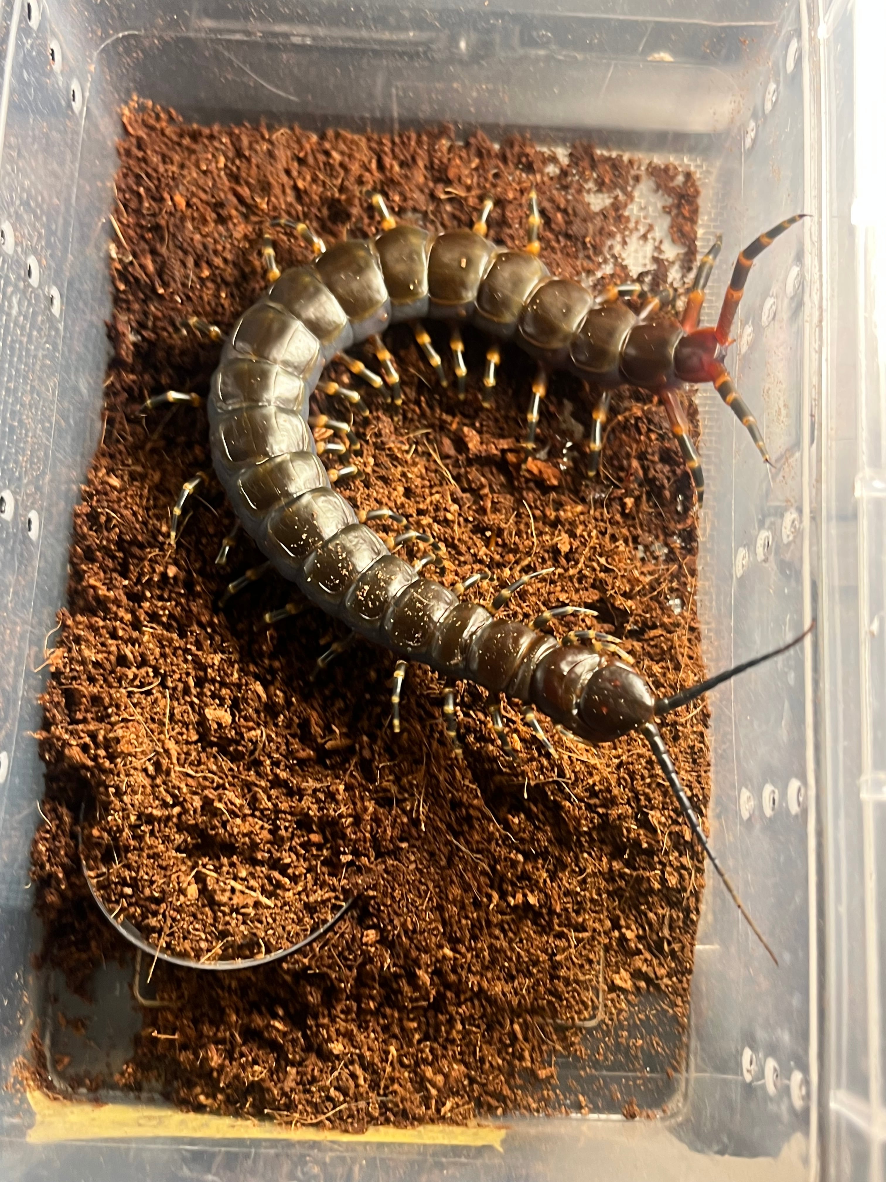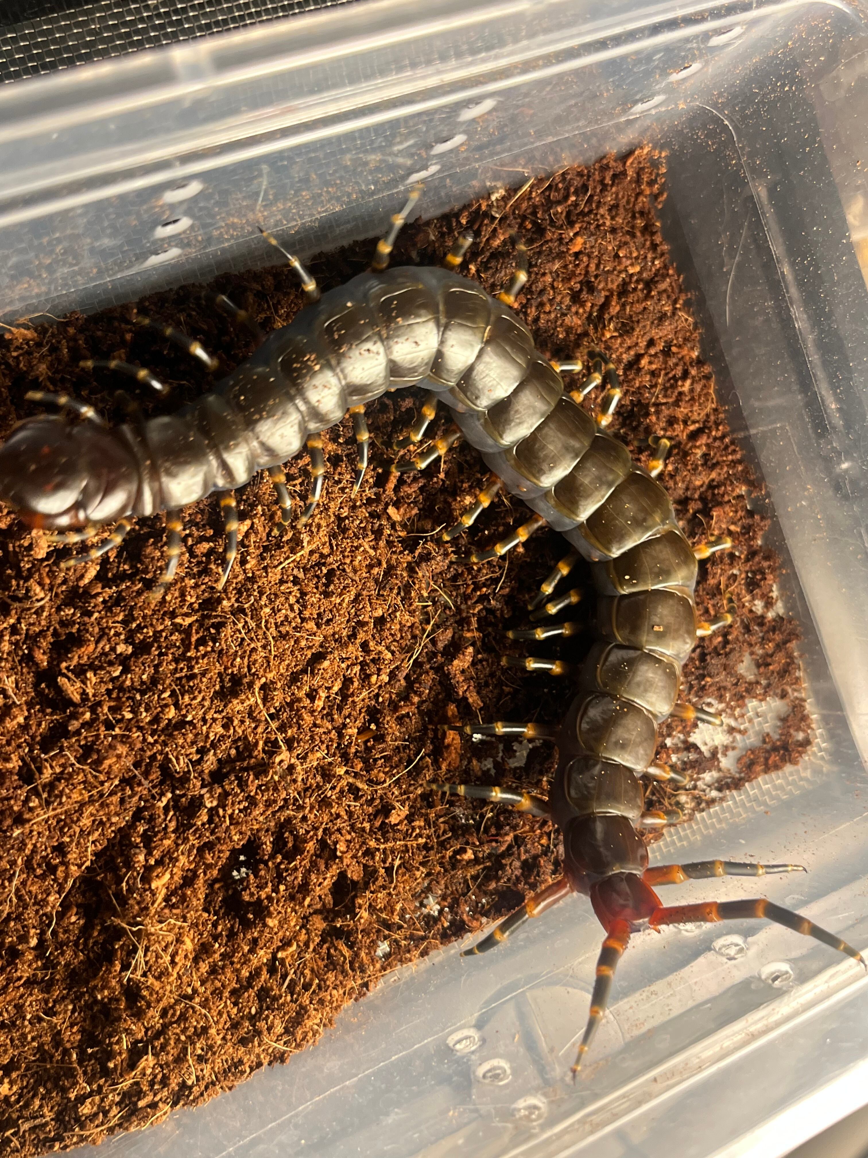 ペルビアンホワイトレッグに次ぐ、ムカデ2番目の大きさです。ガラパゴスオオムカデに似てますが、本種の方が大きくなり、外骨格の質感が圧倒的に良いのでおすすめです!マルゲリータ島産の2枚目以降の画像個体を配送します。すでにまるまると太っているギガンテアです。しっかり排泄もしています。